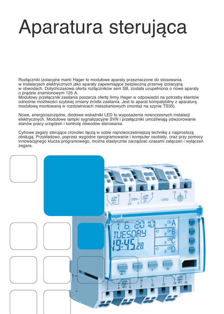 Aparatura sterujàca Roz∏àczniki izolacyjne marki Hager to modu∏owe aparaty przeznaczone do stosowania w instalacjach elektrycznych jako aparaty zapewniajàce bezpiecznà przerw´ izolacyjnà w obwodach. Dotychczasowa oferta roz∏àczników serii SB, zosta∏a uzupe∏niona o nowe aparaty o pràdzie znamionowym 125 A. Modu∏owy prze∏àcznik zasilania poszerza ofert´ firmy Hager w odpowiedzi na potrzeby klientów odnoÊnie mo˝liwoÊci szybkiej zmiany êród∏a zasilania. Jest to aparat kompatybilny z aparaturà modu∏owà montowanà w rozdzielnicach mieszkaniowych (monta˝ na szynie TS35). Nowe, energooszcz´dne, diodowe wskaêniki LED to wyposa˝enie nowoczesnych instalacji elektrycznych. Modu∏owe lampki sygnalizacyjne SVN i prze∏àczniki umo˝liwiajà odwzorowanie stanów pracy urzàdzeƒ i kontrol´ obwodów sterowania. Cyfrowe zegary sterujàce cronotec ∏àczà w sobie najnowoczeÊniejszà technik´ z najprostszà obs∏ugà. Przyk∏adowo, poprzez wygodne oprogramowanie i komputer osobisty, oraz przy pomocy innowacyjnego klucza programowego, mo˝na elastycznie zarzàdzaç czasami za∏àczeƒ i wy∏àczeƒ zegara. TUESDAY 10.02 modu∏owe prze∏àczniki zasilania 10.04 przyciski, lampki sygnalizacyjne 10.05 przekaêniki bistabilne 10.06 przekaêniki instalacyjne 10.08 styczniki 10.09 styczniki ciche 10.10 przekaênik priorytetowy 10.10 przekaêniki czasowe 10.11 wy∏àczniki schodowe 10.12 transformatory, dzwonki, brz´czyki, gniazda 10.13 zegary sterujàce 10.14 termostaty 10.18 Êciemniacze 10.22 wy∏àczniki zmierzchowe 10.27 informacje techniczne 10.30 Aparatura sterujàca roz∏àczniki Roz∏àczniki izolacyjne SA z mo˝liwoÊcià wyzwolenia nowoÊç Pod∏àczenie: Styki g∏ówne roz∏àcznika: • 16 mm2 dla pod∏àczeƒ wielodrutowych • 25 mm2 dla pod∏àczeƒ jednodrutowych Opis Dane techniczne IloÊç modu∏ów Roz∏àcznik 2-polowy 2 x 40 A 250 V~ 2,5 SA240 2 x 63 A 250 V~ 2,5 SA263 2 x 80 A 250 V~ 2,5 SA280 4 x 40 A 400 V~ 4,5 SA440 4 x 63 A 400 V~ 4,5 SA463 4 x 80 A 400 V~ 4,5 SA480 Zestyk sygnalizacyjny SD 6 A/230 V~ sygnalizowanie w przypadku wyzwolenia przy zdalnym wyzwoleniu za pomocà wyzwalacza pràdu roboczego i podnapi´ciowego 0,5 MZ202 Wyzwalacz pràdu roboczego Znamionowe napi´cie sterujàce: 230 V do 400 V AC 110 V do 130 V DC 24 V do 48 V AC 12 V do 48 V DC 1 MZ203 1 MZ204 1 1 MZ205 MZ206 13 21 1 3 14 22 2 4 Roz∏àcznik 4-polowy SA263 • 1 do 6 mm2 dla pod∏àczeƒ jednodrutowych Zdalne roz∏àczanie obwodów Roz∏àczniki izolacyjne wyposa˝one w styki pomocnicze CA 1NO + 1NZ do pod∏àczenia sygnalizacji po∏o˝enia styków. Jako dodatkowe wyposa˝enie mo˝na do∏àczyç dodatkowe styki sygnalizacyjne SD, wyzwalacze czy mechanizm blokujàcy. 13 21 N 3 5 7 14 22 N 4 6 8 ZgodnoÊç z normami: IEC 947-2 i 947-3 Kategoria ∏àczenia: AC-23A Styki pomocnicze roz∏àcznika: • 0,5 do 4 mm2 dla pod∏àczeƒ wielodrutowych Nr kat. SA463 poprzez podanie impulsu sterujàcego na cewk´ wyzwalacza roz∏àcznika MZ202 Wyzwalacz podnapi´ciowy Znamionowe napi´cie pracy: 48 V DC 230 V AC wyzwalanie wy∏àcznika instalacyjnego przy spadku napi´cia sieci Zakres wyzwalania: < 35% UN: wy∏àczyç 35% - 70%: wy∏àczyç lub trzymaç > 70% UN: trzymaç dopiero po podaniu napi´cia sieci mo˝liwe jest za∏àczenie roz∏àcznika MZ203 Mechanizm blokujàcy zapobiega niepo˝àdanemu w∏àczaniu i wy∏àczaniu roz∏àcznika MZ205 MZN175 10.02 Zastrzega si´ mo˝liwoÊç wprowadzenia zmian technicznych 2 MZN175 Roz∏àczniki • norma: EN 60669-1 • napi´cie znamionowe 250 V~ (jednofazowe) lub 400 V~ (trzyfazowe) • roz∏àczniki 40 A / 63 A z ∏atwymi w instalowaniu zaciskami Bi-Connect • zaciski - 16-25 A: linka 10 mm2, drut 16 mm2 - 40-63 A: linka 16 mm2, drut 25 mm2 - 80-100 A: linka 35 mm2, drut 50 mm2 Opis IloÊç biegunów Roz∏àczniki 1 2 3 4 IloÊç modu∏ów Opak. Nr kat. 16 16 16 16 1 1 2 2 12 1 1 1 SB116 SB216 SB316 SB416 1 2 3 4 25 25 25 25 1 1 2 2 1 1 1 1 SB125 SB225 SB325 SB425 1 2 3 4 40 40 40 40 1 2 3 4 1 1 1 1 SB140 SB240 SB340 SB440 1 2 3 4 63 63 63 63 1 2 3 4 1 1 1 1 SB163 SB263 SB363 SB463 2 3 80 80 2 3 1 1 SB280 SB380 2 3 4 100 100 100 2 3 4 1 1 1 SB299 SB399 SB499 1 2 3 4 4 125 125 125 125 125 1 2 3 4 4 1 1 1 1 1 SB112 SB212 SB312 SB412 SB412F*** Roz∏àczniki w obudowie kompaktowej 3 4 63 63 2,5 3,5 1 1 SH363N* SH463N* z zaciskiem dodatkowym** 3 63 2,5 1 SH363K* z zaciskiem dodatkowym** 4 63 3,5 1 SH463B* do zaryglowania, zaplombowania lub zamkni´cia z zaciskiem dodatkowym** 3 63 2,5 1 SH363S* SB140 SB399 nowoÊç In [A] SH363N Aparatura sterujàca SH363K * SH363S Wytrzyma∏oÊç zwarciowa roz∏àcznika w obudowie kompaktowej = 10 kA z dobezpieczeniem 63 A / gL ** Zacisk dodatkowy 10 mm2 (KF00A) montowany fabrycznie mo˝e byç pod∏àczony do ka˝dej fazy *** Tor neutralny po lewej stronie aparatu Zastrzega si´ mo˝liwoÊç wprowadzenia zmian technicznych 10.03 Roz∏àczniki, prze∏àczniki, przyciski Modu∏owy prze∏àcznik zasilania poszerza ofert´ firmy Hager w odpowiedzi na potrzeby klientów odnoÊnie mo˝liwoÊci szybkiej zmiany êród∏a zasilania. Jest to aparat kompatybilny z aparaturà modu∏owà montowanà w rozdzielnicach mieszkaniowych (monta˝ na szynie TS35). Uwaga: Obwody zasilajàce muszà byç dodatkowo zabezpieczone od zwarç i przecià˝eƒ (np. wy∏àcznik nadpràdowy). Sam prze∏àcznik nie stanowi zabezpieczenia obwodu prze∏àczanego. Uwaga: maksymalny pràd zwarciowy w obwodzie prze∏àcznika 4,5kA! Parametry: • napi´cie znamionowe izolacji 500 V • odpornoÊç na udary napi´ciowe 4kV • temperatura pracy -20°C do +50°C • temp. przechowywania 0°C do +45°C • pod∏àczanie - drut 25mm2 - linka 16mm2 • zgodnoÊç z normà PN-EN 60947-3 • norma: EN 60669-1 • napi´cie znamionowe Opis Styki In [A] IloÊç Opak. Nr kat. modu∏ów stary Nr kat. nowy Modu∏owy prze∏àcznik zasilania 1+N 63 4 1 SF263* 3+N 63 8 1 SF463* 1Z 16 1 12 SB111