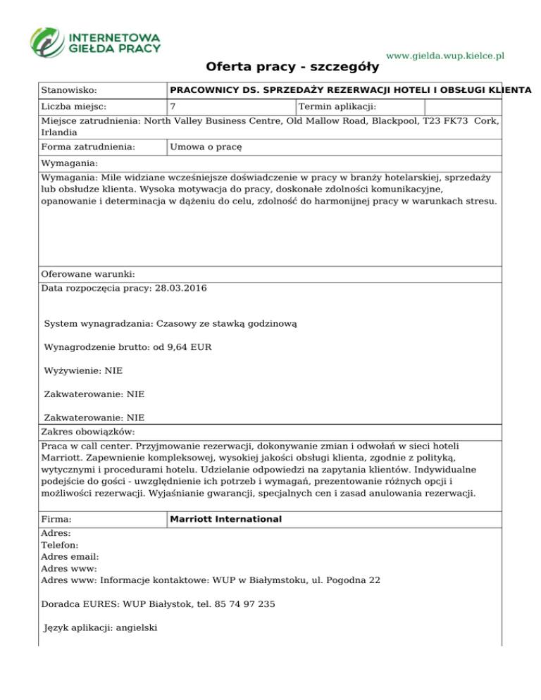 Oferta pracy - szczegóły www.gielda.wup.kielce.pl Stanowisko: PRACOWNICY DS. SPRZEDAŻY REZERWACJI HOTELI I OBSŁUGI KLIENTA Liczba miejsc: 7 Termin aplikacji: Miejsce zatrudnienia: North Valley Business Centre, Old Mallow Road, Blackpool, T23 FK73 Cork, Irlandia Forma zatrudnienia: Umowa o pracę Wymagania: Wymagania: Mile widziane wcześniejsze doświadczenie w pracy w branży hotelarskiej, sprzedaży lub obsłudze klienta. Wysoka motywacja do pracy, doskonałe zdolności komunikacyjne, opanowanie i determinacja w dążeniu do celu, zdolność do harmonijnej pracy w warunkach stresu. Oferowane warunki: Data rozpoczęcia pracy: 28.03.2016 System wynagradzania: Czasowy ze stawką godzinową Wynagrodzenie brutto: od 9,64 EUR Wyżywienie: NIE Zakwaterowanie: NIE Zakwaterowanie: NIE Zakres obowiązków: Praca w call center. Przyjmowanie rezerwacji, dokonywanie zmian i odwołań w sieci hoteli Marriott. Zapewnienie kompleksowej, wysokiej jakości obsługi klienta, zgodnie z polityką, wytycznymi i procedurami hotelu. Udzielanie odpowiedzi na zapytania klientów. Indywidualne podejście do gości - uwzględnienie ich potrzeb i wymagań, prezentowanie różnych opcji i możliwości rezerwacji. Wyjaśnianie gwarancji, specjalnych cen i zasad anulowania rezerwacji. Firma: Marriott International Adres: Telefon: Adres email: Adres www: Adres www: Informacje kontaktowe: WUP w Białymstoku, ul. Pogodna 22 Doradca EURES: WUP Białystok, tel. 85 74 97 235 Język aplikacji: angielski Sposób aplikowania: do doradcy EURES z WUP Sposób przekazania dokumentów: email: – [email protected] w tytule emaila proszę wpisać - Pracownicy ds. sprzedaży rezerwacji hotelu i obsługi klienta Wymagane dokumenty: CV i list motywacyjny - CV może być przesłane również w języku niemieckim Uwagi: Identyfikator oferty: 4898396 Instytucja koordynująca ofertę: Wojewódzki Urząd Pracy w Białymstoku Urząd Pracy dokłada wszelkich starań, aby oferty pracy będące w zasobach urzędu, były rzetelne i wiarygodne. Ponieważ wszystkie oferty pracy pochodzą od osób trzecich Urząd Pracy zastrzega, że odpowiedzialność za ewentualne rozbieżności pomiędzy warunkami pracy zaprezentowanymi w niniejszej ofercie a warunkami zaproponowanymi przez potencjalnego pracodawcę ponosi pracodawca.