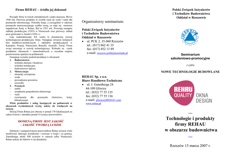 Firma REHAU – źródła jej dokonań Początki firmy to trzech zatrudnionych i jedna maszyna. Był to 1946 rok. Pierwsze produkty to zwykłe węże do wody i ranty dla przemysłu obuwniczego. Potrzeby kraju, a szczególnie w zakresie przemysłu motoryzacyjnego szybko rosną, co staje się motorem napędowym firmy w Rehau. Był to 1951 rok. Powstają następne zakłady produkcyjne (1955) w Niemczech oraz pierwszy zakład poza granicami w Austrii (1956 r.). Lata siedemdziesiąte XX wieku to dynamiczny rozwój technologiczno-produkcyjny firmy. Następuje otwarcie kolejnych biur handlowo-technicznych i zakładów produkcyjnych w Kanadzie, Francji, Niemczech, Brazylii, Australii, Turcji. Firma wciąż inwestuje w rozwój technologiczny. Wchodzi na rynek produktów okiennych i samochodowych o wysokim stopniu przetworzenia opartym na polimerach. Następuje wyraźny podział produkcji w obszarach: 1. Budownictwo: technika okienna i fasadowa technika instalacyjna budownictwo lądowe. 2. Motoryzacja: elementy zewnętrzne woda prowadzenie powietrza uszczelki. 3. Przemysł: meble urządzenia gospodarstwa domowego węże rozwiązania dla przemysłu (lotnictwo, kolej, klimatyzacja). Wiele produktów i usług bazujących na polimerach w obszarach wymienionych wyżej, należy do wiodących na świecie. Dzisiaj Firma Rehau jest obecna w ponad 170 lokalizacjach na całym świecie i zatrudnia ponad 14 tysięcy pracowników. DOMENĄ FIRMY JEST JAKOŚĆ – JAKOŚĆ TWORZĄ LUDZIE Zdolnym i zaangażowanym pracownikom Rehau stwarza wiele możliwości dalszego kształcenia i rozwoju w kraju i za granicą. Zatrudniając około 500 uczniów w samych tylko Niemczech, Rehau należy do liderów w tej dziedzinie. Polski Związek Inżynierów i Techników Budownictwa Oddział w Rzeszowie Organizatorzy seminarium: Polski Związek Inżynierów i Techników Budownictwa Oddział w Rzeszowie ul. PCK 2, 35-060 Rzeszów tel.: (017) 862 41 35 fax: (017) 852 13 89 e-mail: [email protected] Seminarium szkoleniowo-promocyjne z cyklu NOWE TECHNOLOGIE BUDOWLANE REHAU Sp. z o.o. Biuro Handlowo-Techniczne ul. J. Gutenberga 24 44-109 Gliwice tel.: (032) 77 55 135 fax: (032) 77 55 136 e-mail: [email protected] www.rehau.pl *** Technologie i produkty firmy REHAU w obszarze budownictwa *** Rzeszów 15 marca 2007 r.