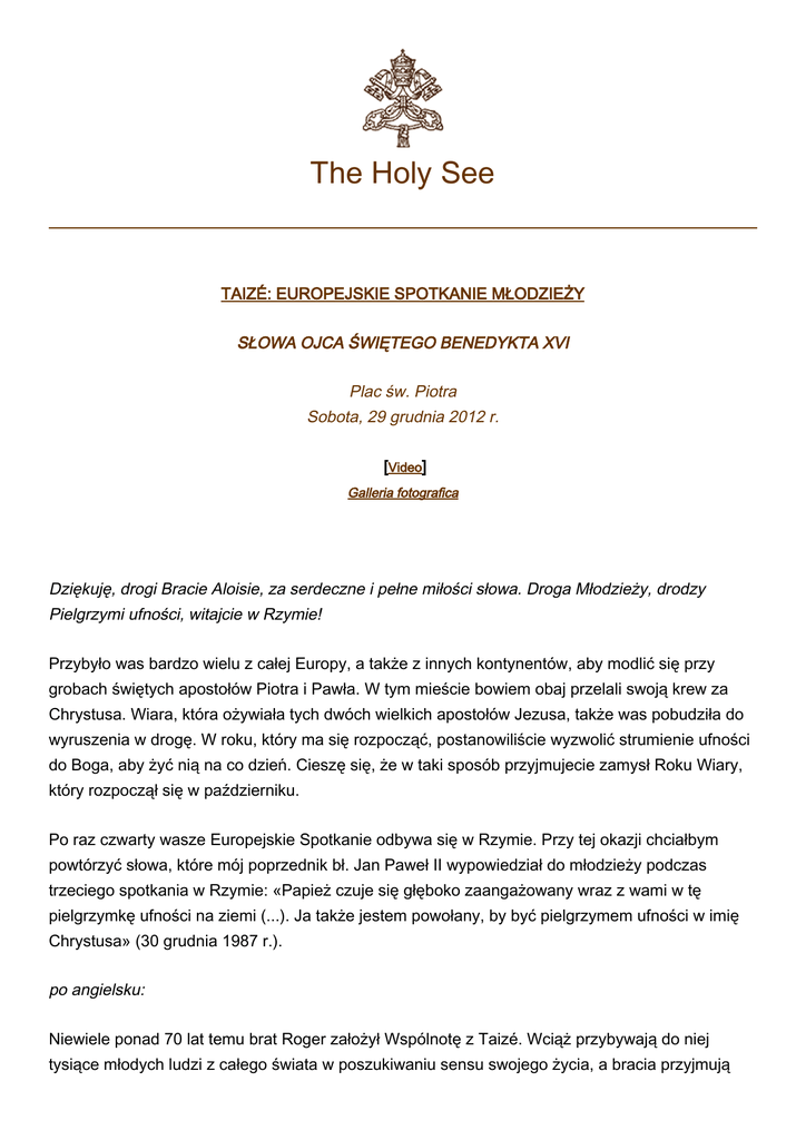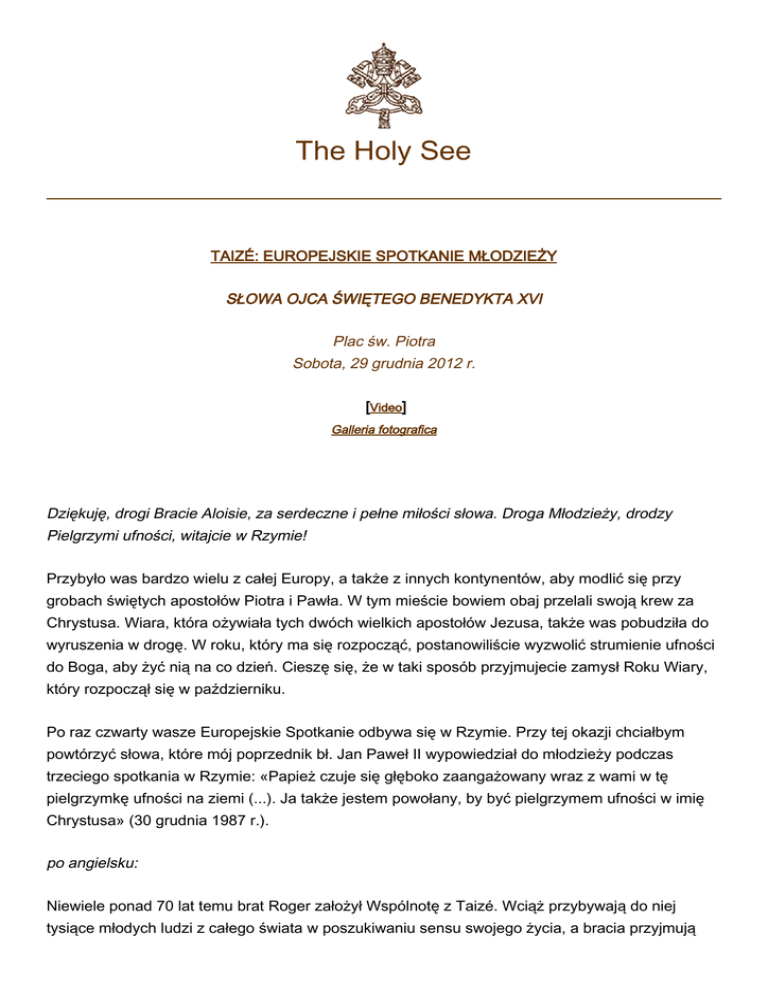 The Holy See TAIZÉ: EUROPEJSKIE SPOTKANIE MŁODZIEŻY SŁOWA OJCA ŚWIĘTEGO BENEDYKTA XVI Plac św. Piotra Sobota, 29 grudnia 2012 r. [Video] Galleria fotografica Dziękuję, drogi Bracie Aloisie, za serdeczne i pełne miłości słowa. Droga Młodzieży, drodzy Pielgrzymi ufności, witajcie w Rzymie! Przybyło was bardzo wielu z całej Europy, a także z innych kontynentów, aby modlić się przy grobach świętych apostołów Piotra i Pawła. W tym mieście bowiem obaj przelali swoją krew za Chrystusa. Wiara, która ożywiała tych dwóch wielkich apostołów Jezusa, także was pobudziła do wyruszenia w drogę. W roku, który ma się rozpocząć, postanowiliście wyzwolić strumienie ufności do Boga, aby żyć nią na co dzień. Cieszę się, że w taki sposób przyjmujecie zamysł Roku Wiary, który rozpoczął się w październiku. Po raz czwarty wasze Europejskie Spotkanie odbywa się w Rzymie. Przy tej okazji chciałbym powtórzyć słowa, które mój poprzednik bł. Jan Paweł II wypowiedział do młodzieży podczas trzeciego spotkania w Rzymie: «Papież czuje się głęboko zaangażowany wraz z wami w tę pielgrzymkę ufności na ziemi (...). Ja także jestem powołany, by być pielgrzymem ufności w imię Chrystusa» (30 grudnia 1987 r.). po angielsku: Niewiele ponad 70 lat temu brat Roger założył Wspólnotę z Taizé. Wciąż przybywają do niej tysiące młodych ludzi z całego świata w poszukiwaniu sensu swojego życia, a bracia przyjmują 2 ich, by uczestniczyli w ich modlitwie i dają sposobność doświadczenia osobistej relacji z Bogiem. Pragnąc wspierać tych młodych ludzi w drodze do Chrystusa, brat Roger postanowił zapoczątkować «pielgrzymkę ufności przez ziemię». Niestrudzony świadek Ewangelii pokoju i pojednania, żarliwie zaangażowany w ekumenizm świętości, brat Roger zachęcał wszystkich, którzy przewijali się przez Taizé, by dążyli do jedności. Powiedziałem nazajutrz po jego śmierci: «Powinniśmy wsłuchać się (...) w jego ekumenizm, przeżywany w duchu, i pozwolić, by jego świadectwo prowadziło nas do autentycznie zinterioryzowanego i duchowego ekumenizmu». Idąc w jego ślady, wszyscy bądźcie zwiastunami tego przesłania jedności. Zapewniam was, że Kościół katolicki nieodwołalnie angażuje się w nieustanne poszukiwanie dróg pojednania, aby doprowadzić do widzialnej jedności chrześcijan. Tego wieczoru pragnę szczególnie serdecznie pozdrowić obecnych wśród was prawosławnych i protestantów. po francusku: Dzisiaj Chrystus wam stawia pytanie, jakie skierował do swoich uczniów: «A wy za kogo Mnie uważacie?» Piotr, przy którego grobie teraz się znajdujemy, odpowiedział na nie: «Ty jesteś Mesjasz, Syn Boga żywego» (Mt 16, 15-16). I całe jego życie stało się konkretną odpowiedzią na to pytanie. Chrystus pragnie otrzymać także od każdego z was konkretną odpowiedź, która nie wynikałaby z przymusu czy strachu, ale z waszej głębokiej wolności. Gdy odpowiecie na to pytanie, wasze życie zyska największy sens. Fragment Listu św. Jana, którego przed chwilą wysłuchaliśmy, z wielką prostotą, jakby syntetycznie daje nam do zrozumienia, jaka powinna być odpowiedź: «Abyśmy wierzyli w imię Jego Syna, Jezusa Chrystusa, i miłowali się wzajemnie» (1 J 3, 23). Wierzyć i kochać Boga oraz bliźnich! Czyż może być coś wspanialszego? Coś piękniejszego? Obyście w czasie tych dni spędzonych w Rzymie pozwolili dojrzewać w waszych sercach temu «tak» powiedzianemu Chrystusowi, wykorzystując owocnie w szczególności długie chwile milczenia, któremu poświęcone jest główne miejsce w waszych wspólnych modlitwach po wysłuchaniu Słowa Bożego. To Słowo, mówi Drugi List św. Piotra, jest «jak lampa, która świeci w ciemnym miejscu», i dobrze czynicie patrząc na nią «aż dzień zaświta, a gwiazda poranna wzejdzie w waszych sercach» (por. 1, 19). Wy to zrozumieliście: skoro gwiazda zaranna musi wzejść w waszych sercach, to dlatego, że nie jest w nich przez cały czas. Niekiedy zło i cierpienie niewinnych rodzą w was wątpliwości i wahania. I może być trudno powiedzieć «tak» Chrystusowi. Ale te wątpliwości nie czynią z was niewierzących! Jezus nie odrzucił człowieka z Ewangelii, który wołał: «Wierzę, zaradź memu niedowiarstwu!» (Mk 9, 24). po niemiecku: Abyście w tych zmaganiach nie stracili ufności, Bóg nie pozostawia was samych ani 3 opuszczonych. On daje nam wszystkim przyjaźń i wsparcie wspólnoty Kościoła. W czasie waszego pobytu w Rzymie, w szczególności dzięki wielkodusznemu przyjęciu ze strony tak licznych parafii i wspólnot zakonnych, wyrabiacie sobie nowe wyobrażenie o Kościele. Po powrocie do domu, do waszych poszczególnych krajów odkrywajcie, że Bóg poprzez różnorodne powołania czyni was współodpowiedzialnymi za swój Kościół. Potrzebuje was ta wspólnota, która jest Ciałem Chrystusa, a wy macie w niej swoje pełne miejsce. W oparciu o wasze talenty, o to, co zostało dane jako specyficzny dar każdemu z was, Duch Święty kształtuje i ożywia tajemnicę wspólnoty, którą jest Kościół, aby głosił on dzisiejszemu światu Dobrą Nowinę. po polsku: Śpiew wraz z milczeniem zajmuje ważne miejsce w waszych wspólnych modlitwach. Pieśni z Taizé wypełniają w tych dniach bazyliki Rzymu. Śpiew jest niezrównanym wsparciem i wyrazem modlitwy. Śpiewając Chrystusowi, otwieracie się również na tajemnicę Jego nadziei. Miejcie odwagę uprzedzać jutrzenkę, aby chwalić Boga. Nie zawiedziecie się. Drodzy młodzi przyjaciele, Chrystus nie odciąga was od świata. On was posyła tam, gdzie przygasa światło, abyście je nieśli innym. Tak, jesteście powołani, abyście byli małymi kagankami dla tych, którzy was otaczają. Dzięki waszej trosce o bardziej równomierny podział dóbr ziemskich, dzięki waszemu zaangażowaniu na rzecz sprawiedliwości i nowej solidarności między ludźmi pomożecie 