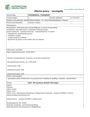 Oferta pracy - szczegóły Stanowisko: POKOJÓWKA / POKOJOWY Liczba miejsc: 1 www.gielda.wup.kielce.pl Termin aplikacji: 17.03.2017 Miejsce zatrudnienia: Rudolf-Breitscheidstr. 19, 18225 Kuehlungsborn, Niemcy Forma zatrudnienia: Umowa o pracę Wymagania: Wymagania: Wykształcenie lub kwalifikacje w branży hotelarskiej Posiadanie doświadczenia w obsłudze hotelowej gości Język niemiecki - wymóg konieczny - komunikatywny w mowie - umiejętność samodzielnej pracy - schludny wygląd - wysoka kultura osobista - gotowość do pracy w dni wolne oraz na zmiany Oferowane warunki: Data rozpoczęcia pracy: 18.03.2016 System wynagradzania: Czasowy ze stawką miesięczną Wynagrodzenie brutto: od 1 500 EUR Wyżywienie: NIE Zakwaterowanie: NIE Zakwaterowanie: NIE Zakres obowiązków: - sprzątanie pokoi hotelowych oraz przestrzeni wspólnych (podłóg, schodów, sanitariatów) Firma: ZAV- IPS Sachsen-Anhalt-Thüringen Adres: Telefon: Adres email: Adres www: Adres www: Informacje kontaktowe: Małgorzata Gościniak – doradca EURES w Polsce [email protected] Tobias Kruse – doradca EURES w Niemczech Bundesagentur für Arbeit Zentrale Auslands- und Fachvermittlung Internationaler Personalservice Magdeburg Hohepfortestraße 37 39104 Magdeburg Tel: +49 391 257 164 [email protected] Język aplikacji: niemiecki Sposób aplikowania: do doradcy EURES z WUP Sposób przekazania dokumentów: Aplikacje proszę kierować pocztą elektroniczną (e-mail) z dopiskiem „Zimmermädchen” na adres e-mail doradcy EURES w WUP w Katowicach: [email protected] Wymagane dokumenty: CV wraz ze zdjęciem w formacie paszportowym EUROPASS Wzór do pobrania dostępny na stronie internetowej: https://europass.cedefop.europa.eu/de/documents/curriculum-vitae/templates-instructions Uwagi: Identyfikator oferty: 10000-1136318769-S Instytucja koordynująca ofertę: Wojewódzki Urząd Pracy w Katowicach Urząd Pracy dokłada wszelkich starań, aby oferty pracy będące w zasobach urzędu, były rzetelne i wiarygodne. Ponieważ wszystkie oferty pracy pochodzą od osób trzecich Urząd Pracy zastrzega, że odpowiedzialność za ewentualne rozbieżności pomiędzy warunkami pracy zaprezentowanymi w niniejszej ofercie a warunkami zaproponowanymi przez potencjalnego pracodawcę ponosi pracodawca.