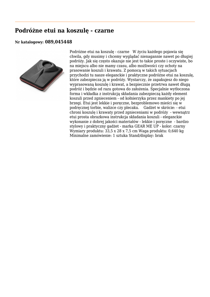 Podróżne etui na koszulę - czarne Nr katalogowy: 089,045448 Podróżne etui na koszulę - czarne W życiu każdego pojawia się chwila, gdy musimy i chcemy wyglądać nienagannie nawet po długiej podróży. Jak się często okazuje nie jest to takie proste i oczywiste, bo na miejscu albo nie mamy czasu, albo możliwości czy ochoty na prasowanie koszuli i krawatu. Z pomocą w takich sytuacjach przychodzi tu nasze eleganckie i praktyczne podróżne etui na koszulę, które zabezpiecza ją w podróży. Wystarczy, że zapakujesz do niego wyprasowaną koszulę i krawat, a bezpiecznie przetrwa nawet długą podróż i będzie od razu gotowa do założenia. Specjalnie wytłoczona forma i wkładka z instrukcją składania zabezpieczą każdy element koszuli przed zgnieceniem - od kołnierzyka przez mankiety po jej brzegi. Etui jest lekkie i poręczne, bezproblemowo mieści się w podręcznej torbie, walizce czy plecaku. Gadżet w skrócie: - etui chroni koszulę i krawaty przed zgnieceniami w podróży - wewnątrz etui prosta obrazkowa instrukcja składania koszuli - eleganckie wykonanie z dobrej jakości materiałów - lekkie i poręczne - bardzo stylowy i praktyczny gadżet - marka GEAR ME UP - kolor: czarny Wymiary produktu: 33,5 x 28 x 7,5 cm Waga produktu: 0,640 kg Minimalne zamówienie: 1 sztuka Stand/display: brak