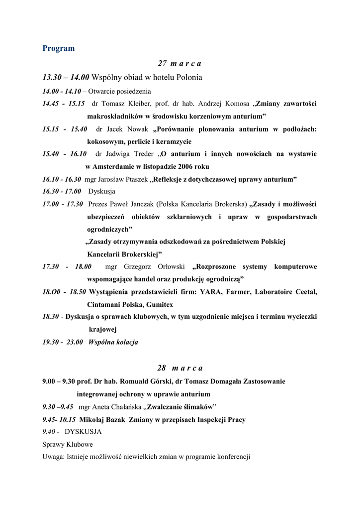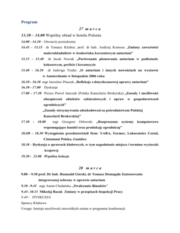 Program 27 m a r c a 13.30 – 14.00 Wspólny obiad w hotelu Polonia 14.00 - 14.10 – Otwarcie posiedzenia 14.45 - 15.15 dr Tomasz Kleiber, prof. dr hab. Andrzej Komosa „Zmiany zawartoś ci makroskł adników w ś rodowisku korzeniowym anturium” 15.15 - 15.40 dr Jacek Nowak „Porównanie plonowania anturium w podł oż ach: kokosowym, perlicie i keramzycie 15.40 - 16.10 dr Jadwiga Treder „O anturium i innych nowoś ciach na wystawie w Amsterdamie w listopadzie 2006 roku 16.10 - 16.30 mgr Jarosł aw Ptaszek „Refleksje z dotychczasowej uprawy anturium” 16.30 - 17.00 Dyskusja 17.00 - 17.30 Prezes PawełJanczak (Polska Kancelaria Brokerska) „Zasady i moż liwoś ci ubezpieczeń obiektów szklarniowych i upraw w gospodarstwach ogrodniczych” „Zasady otrzymywania odszkodowańza poś rednictwem Polskiej Kancelarii Brokerskiej” 17.30 - 18.00 mgr Grzegorz Orł owski „Rozproszone systemy komputerowe wspomagające handel oraz produkcjęogrodniczą” 18.O0 - 18.50 Wystąpienia przedstawicieli firm: YARA, Farmer, Laboratoire Ceetal, Cintamani Polska, Gumitex 18.30 - Dyskusja o sprawach klubowych, w tym uzgodnienie miejsca i terminu wycieczki krajowej 19.30 - 23.00 Wspólna kolacja 28 m a r c a 9.00 – 9.30 prof. Dr hab. Romuald Górski, dr Tomasz Domagał a Zastosowanie integrowanej ochrony w uprawie anturium 9.30 –9.45 mgr Aneta Chał ańska „Zwalczanie ś limaków” 9.45- 10.15 Mikoł aj Bazak Zmiany w przepisach Inspekcji Pracy 9.40 - DYSKUSJA Sprawy Klubowe Uwaga: Istnieje możliwoś ćniewielkich zmian w programie konferencji