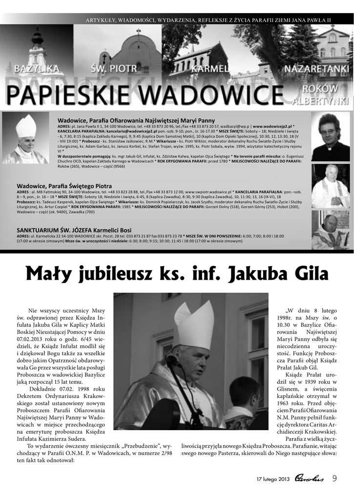 ARTYKUŁY, WIADOMOŚCI, WYDARZENIA, REFLEKSJE Z ŻYCIA PARAFII ZIEMI JANA PAWŁA II Wadowice, Parafia Ofiarowania Najświętszej Maryi Panny ADRES: pl. Jana Pawła II 1, 34-100 Wadowice, tel. +48 33 873 20 96, tel./fax +48 33 873 20 57, [email protected] | www.wadowicejp2.pl * KANCELARIA PARAFIALNA: [email protected] pon.-sob. 9-10; pon., śr. 16-17.30 * MSZE ŚWIĘTE: Soboty – 18; Niedziele i święta - 6, 7:30, 8:15 (kaplica Zakładu Karnego), 9, 9:45 (kaplica Dom Samotnej Matki), 10 (kaplica Dom Opieki Społecznej), 10:30, 12, 13:30, 18 (V - VIII 19:00) * Proboszcz - ks. Stanisław Jaśkowiec, R.M.* Wikariusze - ks. Piotr Wiktor, moderator dekanalny Ruchu Światło-Życie i Służby Liturgicznej, ks. Adam Garlacz, ks. Janusz Korbel, ks. Stefan Trojan, wyśw. 1995, ks. Piotr Sobala, wyśw. 1994, wizytator katechetyczny rejonu VI * W duszpasterstwie pomagają: ks. mgr Jakub Gil, infułat, ks. Zdzisław Kałwa, kapelan Ojca Świętego * Na terenie parafii mieszka: o. Eugeniusz Chuchro OCD, kapelan Zakładu Karnego w Wadowicach * ROK ERYGOWANIA PARAFII: przed 1780 * MIEJSCOWOŚCI NALEŻĄCE DO PARAFII: Roków (265), Wadowice – część (9566) Wadowice, Parafia Świętego Piotra ADRES : al. MB Fa�mskiej 90, 34-100 Wadowice, tel. +48 33 823 28 88, tel./fax +48 33 873 12 00, www.swpiotr.wadowice.pl * KANCELARIA PARAFIALNA: pon.–sob. 8 – 9, pon., śr. 16 – 18 * MSZE ŚWIĘTE: Soboty 18; Niedziele i święta, 6:45, 8 (kaplica Zawadka), 8:30, 9:30 (kaplica Zawadka), 10, 11:30, 13, 16 (IX-VI), 18 Proboszcz: ks. Tadeusz Kasperek, kapelan Ojca Świętego * Wikariusze: ks. Dominik Popielarczyk, ks. Jacek Szydło, moderator dekanalny Ruchu Światło-Życie i Służby Liturgicznej, ks. Artur Czepiel * ROK ERYGOWANIA PARAFII: 1985 * MIEJSCOWOŚCI NALEŻĄCE DO PARAFII: Gorzeń Dolny (518), Gorzeń Górny (253), Hobot (200), Wadowice – część (ok. 9400), Zawadka (700) SANKTUARIUM ŚW. JÓZEFA Karmelici Bosi ADRES: ul. Karmelicka 22 34-100 WADOWICE skr. Poczt. 28 tel. 033 873 21 87 fax 033 873 23 78 * MSZE ŚW. W DNI POWSZEDNIE: 6:00; 7:00; 8:00 i 18:00 (17:00 w okresie zimowym) Msze św. w uroczystości i niedziele: 6:30; 8:00; 9:15; 10:30; 11:45 i 18:00 (17:00 w okresie zimowym) Mały jubileusz ks. inf. Jakuba Gila Nie wszyscy uczestnicy Mszy św. odprawionej przez Księdza Infułata Jakuba Gila w Kaplicy Matki Boskiej Nieustającej Pomocy w dniu 07.02.2013 roku o godz. 6/45 wiedzieli, że Ksiądz Infułat modlił się i dziękował Bogu także za wszelkie dobro jakim Opatrzność obdarowywała Go przez wszystkie lata posługi Proboszcza w wadowickiej Bazylice jaką rozpoczął 15 lat temu. Dokładnie 07.02. 1998 roku Dekretem Ordynariusza Krakowskiego został ustanowiony nowym Proboszczem Parafii Ofiarowania Najświętszej Maryi Panny w Wadowicach w miejsce przechodzącego na emeryturę proboszcza Księdza Infułata Kazimierza Sudera. To wydarzenie ówczesny miesięcznik „Przebudzenie”, wychodzący w Parafii O.N.M. P. w Wadowicach, w numerze 2/98 ten fakt tak odnotował: „W dniu 8 lutego 1998r. na Mszy św. o 10.30 w Bazylice Ofiarowania Najświętszej Maryi Panny odbyła się niecodzienna uroczystość. Funkcję Proboszcza Parafii objął Ksiądz Prałat Jakub Gil. Ksiądz Prałat urodził się w 1939 roku w Glisnem, a święcenia kapłańskie otrzymał w 1963 roku. Przed objęciem Parafii Ofiarowania N.M. Panny pełnił funkcję dyrektora Caritas Archidiecezji Krakowskiej. Parafia z wielką życzliwością przyjęła nowego Księdza Proboszcza. Parafianie, witając swego nowego Pasterza, skierowali do Niego następujące słowa: 17 lutego 2013 9 RTYKUŁY, WIADOMOŚCI, WYDARZENIA, REFLEKSJE Z ŻYCIA PARAFII ZIEMI JANA PAWŁA II Czcigodny Księże Prałacie. Z radością i szacunkiem witamy Księdza wśród nas i serdecznie przyjmujemy do naszej Wspólnoty Parafialnej, życząc dobrej i owocnej pracy. My, Parafianie Parafii Ofiarowania Najświętszej Maryi Panny dołożymy starań, ofiarując swoją życzliwą pomoc, aby stworzyć dobrą atmosferę pracy i współpracy. Bardzo pragniemy, by nasza Parafia była dla Księdza Proboszcza rodzinną wspólnotą pełną miłości, życzliwości i zaufania. Polecamy się księdza modlitwie i duchowej opiece.” Tak rozpoczął się kolejny etap życia kapłańskiego Księdza Prałata Jakuba Gila, wtedy tylko Opatrzność wiedziała, że będzie trwał tylko 13 lat i 6 miesięcy. Przez lata w których Ksiądz Prałat , a następnie Ksiądz Infułat Jakub Gil kierował papieską Parafią dokonanych zostało tyle różnych dzieł jak nigdy dotąd w historii Parafii. Zaczęło się od ocieplenia stropu Bazyliki a skończyło na sprawieniu nowych 27 - głosowych organów. W międzyczasie była wymiana posadzki na marmurową, nowa polichromia figuralna wnętrza ukazująca treści Encyklik Jana Pawła II. Odnowione zostały wszystkie ołtarze, ambona, pająki, stacje Drogi Krzyżowej, Chrzcielnica, naczynia liturgiczne. Zakupione zostały nowe sedilia w prezbiterium i ławki w kaplicach. Kościół otrzymał nowy dach kryty blachą miedzianą i odrestaurowaną elewację. A nade wszystko Bazylika wzbogaciła się o nową kaplicę poświęconą Błogosławionemu Janowi Pawłowi II, dzięki zaadaptowaniu części nawy bocznej, wykorzystywanej dotąd jako pomieszczenie pomocnicze. Kaplicę tą poświęcił Ojciec Święty Benedykt XVI w czasie pobytu w Wadowicach w dniu 27 maja 2006 roku. W sferze duchowej na ten okres przypada rozkwit życia religijnego. Organizowane są różnorakie nabożeństwa, procesje pokutne ulicami miasta, w okresie wielkopostnym odprawiane Drogi Krzyżowe po mieście. W miesiącu maju codzienne procesje z Najświętszym Sakramentem po wadowickim Rynku. Na szczególną uwagę zasługiwały comiesięczne wieczorne Msze św. o szybkie wyniesienie na Ołtarze Sługi Bożego Jana Pawła II, każdego drugiego dnia miesiąca począwszy od maja 2005 roku do stycznia 2011 roku. Do przewodzenia tym nabożeństwom zapraszani byli k
