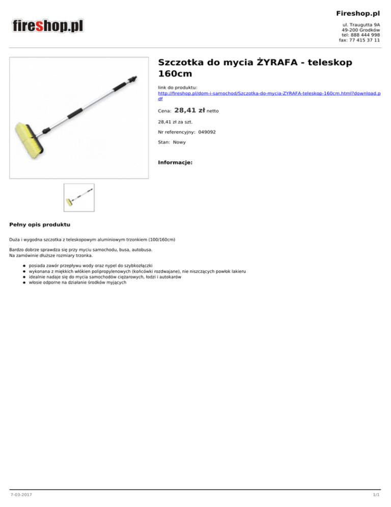 Fireshop.pl ul. Traugutta 9A 49-200 Grodków tel: 888 444 998 fax: 77 415 37 11 Szczotka do mycia ŻYRAFA - teleskop 160cm link do produktu: http://fireshop.pl/dom-i-samochod/Szczotka-do-mycia-ZYRAFA-teleskop-160cm.html?download.p df Cena: 28,41 zł netto 28,41 zł za szt. Nr referencyjny: 049092 Stan: Nowy Informacje: Pełny opis produktu Duża i wygodna szczotka z teleskopowym aluminiowym trzonkiem (100/160cm) Bardzo dobrze sprawdza się przy myciu samochodu, busa, autobusa. Na zamówinie dłuższe rozmiary trzonka. posiada zawór przepływu wody oraz nypel do szybkozłączki wykonana z miękkich włókien polipropylenowych (końcówki rozdwajane), nie niszczących powłok lakieru idealnie nadaje się do mycia samochodów ciężarowych, łodzi i autokarów włosie odporne na działanie środków myjących 7-03-2017 1/1