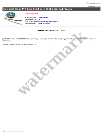 Informacje o produkcie Utworzono 07-03-2017 Plecionka Jaxon Pro Carp Lead Core 25 lbs czarny/brązowy Cena : 8,50 zł Nr katalogowy : 0000000197 Producent : JAXON Stan magazynowy : poniżej średniego Średnia ocena : brak recenzji er m ar k JAXON PRO CARP LEAD CORE JAXON PRO CARP LEAD CORE Materiał przyponowy z ołowianym rdzeniem. Niezastąpiony przy budowaniu szybkotonących zestawów karpiowych. w at Średnica: 0,25mm ; Długość: 5m ; Wytrzymałość: 25lb Wygenerowano w programie www.oscGold.com