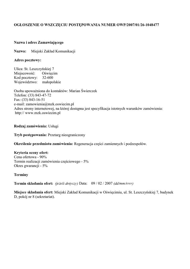 ! " # $ % & ' Miejski Zakład Komunikacji ( ! ) ' % * ' + ( Ulica: St. Leszczyńskiej 7 Miejscowość: Oświęcim Kod pocztowy: 32-600 Województwo: małopolskie Osoba upoważniona do kontaktów: Marian Świerczek Telefon: (33) 843-47-72 Fax: (33) 843-16-51 e-mail: [email protected] Adres strony internetowej, na której dostępna jest specyfikacja istotnych warunków zamówienia: http:// www.mzk.oswiecim.pl ' + " ! 2 * ' 1 + ) # . 0 4 * - , / ) ' ' - ) % - - + Przetarg nieograniczony ( " ' Usługi ( 5 ' * * 3 " , - Regeneracja części zamiennych i podzespołów. ( ( Cena ofertowa - 90% Termin realizacji zamówienia częściowego - 5% Okres gwarancji - 5% " - " - + ! 0 6 - ' 5 * ( 7 8 9 : 9 ; < = > ? @ A B @ C Data: 09 / 02 / 2007 7 = = D E E D F F F F C Miejski Zakład Komunikacji w Oświęcimiu, ul. St. Leszczyńskiej 7, budynek D, pokój nr 8 (sekretariat). # ! % ! 0 6 - ' 5 * (