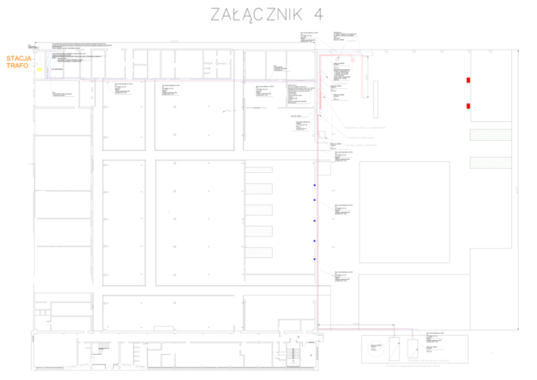 ZAŁĄCZNIK 4 Proj. koryto kablowe np. 500 h 60 h montażu min. 3m QDop min. 50kg/m rezerwa wypełnienia 40% gr blachy min. 1mm 60450 Zasilanie min. 4x YAKXS 1x240mm2 (1st supply line)* 4x YAKXS 1x240mm2 (2nd supply line)* L≈40-50m Moc ok 2* 260kW suwnica W pomieszczeniu transformatorów zainstalować wyciąg powietrza (wentylacja mechaniczna). Dodatkowo zainstalować klimatozator. Zaprojektować i wykonać automatykę chlodzenia pomieszczenia transformatorów. Dobór urządzeń wykonać na podstawie obliczeń Proj. transformator 1000kVA (1MVA) W istn RGnN wymienić przekładniki, amperomierze, most kablowy pomiędzy trafo a RGnN przepusty pomiędzy pomieszczeniami wykonac jako ppoż; zmodyfikowac nastawy na NZM4 W polach RnN zainstalować rozłącznik zblokowany 1250A Rozłącznik wyposazyć w wkładki 2x500A . Proj. koryto kablowe np. 500 h 60 h montażu min. 4m QDop min. 50kg/m rezerwa wypełnienia 40% gr blachy min. 1mm Proj. koryto kablowe np. 500 h 60 h montażu min. 4m QDop min. 50kg/m rezerwa wypełnienia 40% gr blachy min. 1mm Proj. koryto kablowe np. 500 h 60 h montażu min. 3m QDop min. 50kg/m rezerwa wypełnienia 40% gr blachy min. 1mm * L≈15m Moc ok 25kW Zestaw gniazd serwisowych Gniazdo z wyłącznikiem 0-1 1 x gniazdo 16A 5P 400V 1 x gniazdo 32A 5P 400V 2 x GS 16A 250V dodat. zabezp 10A (gniazdo) Zasilanie min. YAKXS 5x6mm2 Zasilanie RG 1 min. 4x (3x YAKXS 1x240mm2) Zasilanie z RGnN sekcja 3, pole 7-8 dł. 80-90m Szczegółową ilość i przekrój żył dobrać na etapie projektu po wykonaniu obliczeń: ·obciążalności (dla In=1250A) ·dopuszczalnego spadku napięcia ·impedancji pętli zwarcia Wykonać dodatkowe połączenie wyrównawcze kompresor Kabel min.YAKXS 2 5x16mm * L≈15m Moc ok 30kW Kabel min.YAKXS 2 5x10mm * L≈10m Moc ok 20kW Nowy 7m Proj. RG1 1600A Proj. koryto kablowe np. 600h60 h montażu min. 3m QDop Wytwornica azotu z kompresorem min. 50kg/m rezerwa wypełnienia 40% gr blachy min. 1mm rozdzielnia elektryczna Kabel min.YAKXS 2 5x10mm * L≈10m Moc ok 10kW pompa układu podawania Proj. koryto kablowe np. 200 h 60 h montażu min. 3m QDop min. 20kg/m rezerwa wypełnienia 40% gr blachy min. 1mm 60450 . Istn. kanał kablowy Proj. koryto kablowe 500h 60 pionowe + pokrywa na ścianie Kabel min.YAKXS 2 5x16mm Proj. koryto kablowe Przestrzeń nad sufitem podwieszanym 8970 STACJA TRAFO Proj. koryto kablowe np. 200 h 60 h montażu min. 3m QDop min. 20kg/m rezerwa wypełnienia 40% gr blachy min. 1mm Proj. koryto kablowe np. 200 h 60 h montażu min. 3m QDop min. 20kg/m rezerwa wypełnienia 40% gr blachy min. 1mm 16540 Proj. koryto kablowe np. 200 h 60 h montażu min. 3m QDop min. 20kg/m rezerwa wypełnienia 40% gr blachy min. 1mm 1 Kabel min.YAKXS 2 5x35mm * L≈75-85m Moc ok 80kW Kabel min.YAKXS 2 5x16mm * L≈80-90m Moc ok 15kW 2 3 Chłodznia wentylatorowa-maszyny Chłodznia sprężarkowa+wentylatorowa-formy . . 1V 1U 2n 2u 2v 1W 2w