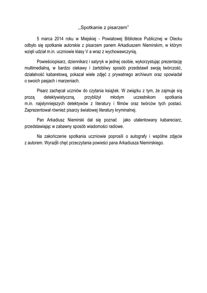 ,,Spotkanie z pisarzem” 5 marca 2014 roku w Miejskiej - Powiatowej Bibliotece Publicznej w Olecku odbyło się spotkanie autorskie z pisarzem panem Arkadiuszem Niemirskim, w którym wzięli udział m.in. uczniowie klasy V a wraz z wychowawczynią. Powieściopisarz, dziennikarz i satyryk w jednej osobie, wykorzystując prezentację multimedialną, w bardzo ciekawy i żartobliwy sposób przedstawił swoją twórczość, działalność kabaretową, pokazał wiele zdjęć z prywatnego archiwum oraz opowiadał o swoich pasjach i marzeniach. Pisarz zachęcał uczniów do czytania książek. W związku z tym, że zajmuje się prozą detektywistyczną, przybliżył młodym uczestnikom spotkania m.in. najsłynniejszych detektywów z literatury i filmów oraz twórców tych postaci. Zaprezentował również pisarzy światowej literatury kryminalnej. Pan Arkadiusz Niemirski dał się poznać jako utalentowany kabareciarz, przedstawiając w zabawny sposób wiadomości radiowe. Na zakończenie spotkania uczniowie poprosili o autografy i wspólne zdjęcie z autorem. Wyraz ili chęć przeczytania powieści pana Arkadiusza Niemirskiego.