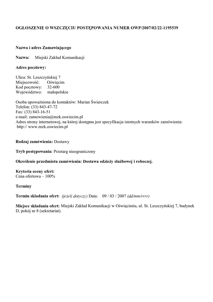 ! " # $ % & ' Miejski Zakład Komunikacji ( ! ) ' % * ' + ( Ulica: St. Leszczyńskiej 7 Miejscowość: Oświęcim Kod pocztowy: 32-600 Województwo: małopolskie Osoba upoważniona do kontaktów: Marian Świerczek Telefon: (33) 843-47-72 Fax: (33) 843-16-51 e-mail: [email protected] Adres strony internetowej, na której dostępna jest specyfikacja istotnych warunków zamówienia: http:// www.mzk.oswiecim.pl ' + " ! 2 * ' 1 + ) # . 0 8 * - , / ) ' ' - ) % - - + Przetarg nieograniczony ( " ' Dostawy ( 9 ' * * 3 " , - ( ' 4 ! * ' 5 + ! 6 3 5 . ' # ' . ' % # 7 ( Cena ofertowa – 100% " - " - + ! 0 6 - ' 9 * ( : ; < = < > ? @ A B C D E C F Data: 09 / 03 / 2007 : @ @ G H H G I I I I F Miejski Zakład Komunikacji w Oświęcimiu, ul. St. Leszczyńskiej 7, budynek D, pokój nr 8 (sekretariat). # ! % ! 0 6 - ' 9 * (