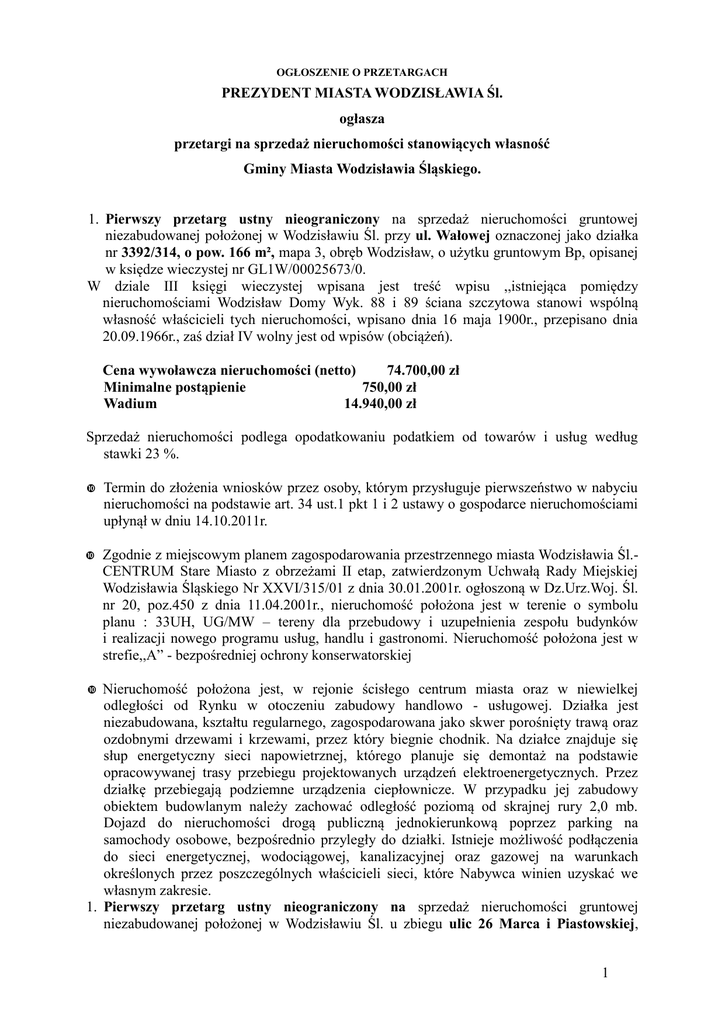 OGŁOSZENIE O PRZETARGACH PREZYDENT MIASTA WODZISŁAWIA Śl. ogłasza przetargi na sprzedaż nieruchomości stanowiących własność Gminy Miasta Wodzisławia Śląskiego. 1. Pierwszy przetarg ustny nieograniczony na sprzedaż nieruchomości gruntowej niezabudowanej położonej w Wodzisławiu Śl. przy ul. Wałowej oznaczonej jako działka nr 3392/314, o pow. 166 m², mapa 3, obręb Wodzisław, o użytku gruntowym Bp, opisanej w księdze wieczystej nr GL1W/00025673/0. W dziale III księgi wieczystej wpisana jest treść wpisu ,,istniejąca pomiędzy nieruchomościami Wodzisław Domy Wyk. 88 i 89 ściana szczytowa stanowi wspólną własność właścicieli tych nieruchomości, wpisano dnia 16 maja 1900r., przepisano dnia 20.09.1966r., zaś dział IV wolny jest od wpisów (obciążeń). Cena wywoławcza nieruchomości (netto) 74.700,00 zł Minimalne postąpienie 750,00 zł Wadium 14.940,00 zł Sprzedaż nieruchomości podlega opodatkowaniu podatkiem od towarów i usług według stawki 23 %. Termin do złożenia wniosków przez osoby, którym przysługuje pierwszeństwo w nabyciu nieruchomości na podstawie art. 34 ust.1 pkt 1 i 2 ustawy o gospodarce nieruchomościami upłynął w dniu 14.10.2011r. Zgodnie z miejscowym planem zagospodarowania przestrzennego miasta Wodzisławia Śl.CENTRUM Stare Miasto z obrzeżami II etap, zatwierdzonym Uchwałą Rady Miejskiej Wodzisławia Śląskiego Nr XXVI/315/01 z dnia 30.01.2001r. ogłoszoną w Dz.Urz.Woj. Śl. nr 20, poz.450 z dnia 11.04.2001r., nieruchomość położona jest w terenie o symbolu planu : 33UH, UG/MW – tereny dla przebudowy i uzupełnienia zespołu budynków i realizacji nowego programu usług, handlu i gastronomi. Nieruchomość położona jest w strefie,,A” - bezpośredniej ochrony konserwatorskiej Nieruchomość położona jest, w rejonie ścisłego centrum miasta oraz w niewielkej odległości od Rynku w otoczeniu zabudowy handlowo - usługowej. Działka jest niezabudowana, kształtu regularnego, zagospodarowana jako skwer porośnięty trawą oraz ozdobnymi drzewami i krzewami, przez który biegnie chodnik. Na działce znajduje się słup energetyczny sieci napowietrznej, którego planuje się demontaż na podstawie opracowywanej trasy przebiegu projektowanych urządzeń elektroenergetycznych. Przez działkę przebiegają podziemne urządzenia ciepłownicze. W przypadku jej zabudowy obiektem budowlanym należy zachować odległość poziomą od skrajnej rury 2,0 mb. Dojazd do nieruchomości drogą publiczną jednokierunkową poprzez parking na samochody osobowe, bezpośrednio przyległy do działki. Istnieje możliwość podłączenia do sieci energetycznej, wodociągowej, kanalizacyjnej oraz gazowej na warunkach określonych przez poszczególnych właścicieli sieci, które Nabywca winien uzyskać we własnym zakresie. 1. Pierwszy przetarg ustny nieograniczony na sprzedaż nieruchomości gruntowej niezabudowanej położonej w Wodzisławiu Śl. u zbiegu ulic 26 Marca i Piastowskiej, 1 oznaczonej jako działka nr 2562/138 o pow. 485 m², mapa 1 W-R, obręb Wodzisław Radlin, o użytku gruntowym B, opisanej w księdze wieczystej nr GL1W/00010038/9. Dział III i IV księgi wieczystej wolny jest od wpisów (obciążeń). Cena wywoławcza nieruchomości (netto) 73 000,00 zł Minimalne postąpienie 730,00 zł Wadium 14 600,00 zł Sprzedaż nieruchomości podlega opodatkowaniu podatkiem od towarów i usług według stawki 23 %. • Termin do złożenia wniosków przez osoby, którym przysługuje pierwszeństwo w nabyciu nieruchomości na podstawie art. 34 ust.1 pkt 1 i 2 ustawy o gospodarce nieruchomościami upłynął w dniu 14.10.2011r. • Dla terenu na którym położona jest nieruchomość, miasto nie posiada planu zagospodarowania miasta Wodzisławia Śl. Zgodnie ze studium uwarunkowań i kierunków zagospodarowania przestrzennego miasta Wodzisławia Śl., zatwierdzonym Uchwałą Rady Miejskiej Wodzisławia Śl. Nr XIX/191/08 z dnia 31.01.2008r., nieruchomość położona jest w terenach o symbolu OZ - obszary zabudowane.W przypadku braku miejscowego planu ustalenie przeznaczenia terenu, określenie sposobu zagospodarowania i warunków zabudowy terenu następuje w drodze decyzji o warunkach zabudowy. Wydanie takiej decyzji może nastąpić na wniosek inwestora, w odniesieniu do konkretnego zamierzenia inwestycyjnego. Nieruchomość położona jest w niewielkiej odległości od centrum miasta w otoczeniu zabudowy mieszkaniowej wielorodzinnej. Teren nieruchomości jest płaski, przy czym jest on wzniesiony skarpami w stosunku do ulicy 26 Marca i Piastowskiej. Działka jest niezabudowana, kształtu regularnego, przylega bezpośrednio do istniejącego parkingu przy ul. Piastowskiej. Istnieje możliwość podłączenia do sieci energetycznej, wodociągowej, kanalizacyjnej i gazowej, na warunkach określonych przez poszczególnych właścicieli sieci, które Nabywca winien uzyskać we własnym zakresie. Przetargi odbędą się w dniu 01 grudnia 2011r. w siedzibie Urzędu Miasta Wodzisławia Śl. przy ul. Bogumińskiej 4B, pokój 206, piętro I, począwszy od godz. 1100 według następującej kolejności: - godz. 1100 działka przy ul. Wałowa, - godz. 1115 działka u zbiegu ulic 26 Marca i Piastowskiej Wadium w podanych wysokościach winno być wniesione w formie pieniężnej przelewem na rachunek Urzędu Miasta Wodzisławia Śl. nr nr 67 1240 4357 1111 0010 3970 8909 Bank Pekao S.A. do dnia 24 listopada 2011r. z podaniem numeru ewidecyjnego działki. - Za datę wniesienia wadium uważa się dzień uznania rachunku bankowego Urzędu Miasta Wodzisławia Śl., - Wadium winno być wniesione przez obojga małżonków, w przypadku zamiaru nabycia nieruchomości na zasadach wspólności ustawowej małżeńskiej. Warunkiem uczestnictwa w przetargach jest dokonanie odpowiedniej wpłaty wadium w wyznaczonym terminie, osobiste stawiennictwo oraz przedłożenie komisji przetargowej w dniu przetargu : a) dowodu wpłaty wadium, b) dowodu tożsam