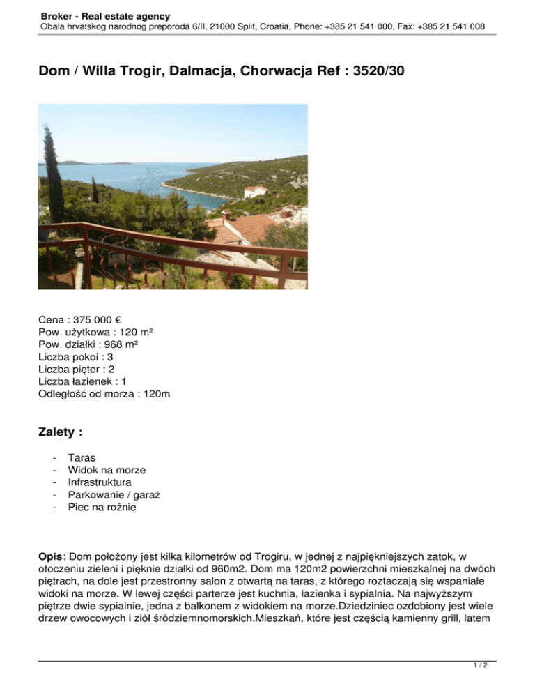 Broker - Real estate agency Obala hrvatskog narodnog preporoda 6/II, 21000 Split, Croatia, Phone: +385 21 541 000, Fax: +385 21 541 008 Dom / Willa Trogir, Dalmacja, Chorwacja Ref : 3520/30 Cena : 375 000 € Pow. użytkowa : 120 m² Pow. działki : 968 m² Liczba pokoi : 3 Liczba pięter : 2 Liczba łazienek : 1 Odległość od morza : 120m Zalety : - Taras Widok na morze Infrastruktura Parkowanie / garaż Piec na rożnie Opis: Dom położony jest kilka kilometrów od Trogiru, w jednej z najpiękniejszych zatok, w otoczeniu zieleni i pięknie działki od 960m2. Dom ma 120m2 powierzchni mieszkalnej na dwóch piętrach, na dole jest przestronny salon z otwartą na taras, z którego roztaczają się wspaniałe widoki na morze. W lewej części parterze jest kuchnia, łazienka i sypialnia. Na najwyższym piętrze dwie sypialnie, jedna z balkonem z widokiem na morze.Dziedziniec ozdobiony jest wiele drzew owocowych i ziół śródziemnomorskich.Mieszkań, które jest częścią kamienny grill, latem 1/2 Broker - Real estate agency Obala hrvatskog narodnog preporoda 6/II, 21000 Split, Croatia, Phone: +385 21 541 000, Fax: +385 21 541 008 oferuje przyjemny cień. Utwardzone parking dla 8 samochodów. Pięknej, spokojnej i miłej atmosferze, naturalnej plaży tylko 120m od morza wraz z przyległymi przystań. 2/2