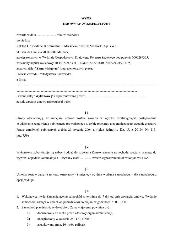 WZÓR UMOWY Nr ZGKiM/D/2/12/2010 zawarta w dniu ........................ roku w Malborku pomiędzy: Zakład Gospodarki Komunalnej i Mieszkaniowej w Malborku Sp. z o.o. ul. Gen. de Gaulle'a 70, 82-200 Malbork, zarejestrowanym w Wydziale Gospodarczym Krajowego Rejestru Sądowego pod pozycją 0000299365, wniesiony kapitał zakładowy 10 443 529,63 zł, REGON 220531610, NIP 579-215-31-75, zwanym dalej "Zamawiającym" i reprezentowanym przez: Prezesa Zarządu - Władysława Krawczyka a firmą: ............................................................................................................................................................................... ....................................................................................................................................................... , zwaną dalej "Wykonawcą" i reprezentowaną przez: ............................................................................. została zawarta umowa następującej treści. §1 Strony oświadczają, że niniejsza umowa została zawarta w wyniku rozstrzygnięcia postępowania o udzielenie zamówienia publicznego prowadzonego w trybie przetargu nieograniczonego, zgodnie z ustawą Prawo zamówień publicznych z dnia 29 stycznia 2004 r. (tekst jednolity Dz. U. z 2010r. Nr 113, poz.759) §2 Wykonawca zobowiązuje się nabyć i oddać do używania Zamawiającemu samochodu specjalistycznego do wywozu odpadów komunalnych - używany marki ............. wraz z wyposażeniem określonym w SIWZ. §3 Umowa zostaje zawarta na czas oznaczony 48 miesięcy od dnia wydania samochodu – dla samochodu z opcją wykupu. §4 1. Wykonawca wyda Zamawiającemu samochód w terminie do 7 dni od dnia zawarcia umowy. Wydanie samochodu nastąpi w dniach od poniedziałku do piątku, w godzinach 7.00 – 15.00. 2. Samochód przedstawiony do odbioru Zamawiającemu powinien być: 1) dopuszczony do ruchu przez właściwy organ administracji, 2) ubezpieczony w zakresie AC, OC, NNW, 3) zatankowany (min. 10 litrów paliwa), 3. Wraz z samochodem wykonawca wyda Zamawiającemu: 1) dowód rejestracyjny, 2) polisy potwierdzające zawarcie umowy ubezpieczenia i opłacenie składki, 3) poświadczoną z oryginałem kopię karty wozu wraz z numerem homologacji (do czasu całkowitego rozliczenia umowy leasingu). 4. Odbiór samochodu będzie potwierdzony protokołem zdawczo-odbiorczym podpisanym przez osobę upoważnioną ze strony Zamawiającego i Wykonawcy. 5. W przypadku, gdy samochód ma jakiekolwiek wady lub jest niezgodny z Ofertą Wykonawcy lub, gdy brak jest jednego z dokumentów, o których mowa w ust. 3, Zamawiający ma prawo odmówić odbioru samochodu oraz wyznaczy Wykonawcy termin na usunięcie przez Wykonawcę wad lub braków w terminie, nie krótszym niż 7 dni. Po bezskutecznym upływie tego terminu Zamawiający ma prawo odstąpić od umowy w części lub w całości. §5 1. Wykonawca zobowiązuje się w szczególności do: 1) informować Zamawiającego o wszelkich zapytaniach skierowanych do niego przez organy lub osoby trzecie, których przedmiotem jest używany przez Zamawiającego samochód lub w wyniku których jest zobowiązany ujawnić informację o Zamawiającym lub używanym przez niego samochodzie, w terminie 7 dni od dnia otrzymania zapytania oraz zakresie udzielonych tym organom lub osobom informacji najpóźniej w dniu, w którym przekazał informację temu organowi lub osobie trzeciej, 2) ubezpieczyć samochód w zakresie i na warunkach zgodnie z ofertą, w całym okresie trwania umowy, 3) terminowo opłacać składki ubezpieczenia, zawierać umowy ubezpieczenia oraz przedstawiać Zamawiającemu dokumenty potwierdzające opłacenie składek ubezpieczenia oraz dokumenty potwierdzające zawarcie umów ubezpieczenia samochodu w kolejnych okresach w trakcie trwania umowy leasingu, co najmniej 7 dni przed upływem terminu wygaśnięcia uprzednio zawartych umów ubezpieczenia lub terminem płatności składek, 4) nie obciążać samochodu na rzecz osób trzecich ani przelewać swoich praw wynikających z niniejszej umowy na osoby trzecie. 2. Zamawiający zobowiązuje się w szczególności do: 1) korzystać z samochodu w sposób zgodny z jego przeznaczeniem, 2) utrzymywać samochód w stanie przydatnym do umówionego użytku przez cały okres obowiązywania umowy oraz dokonywania wszelkich napraw koniecznych do zachowania samochodu w stanie nie pogorszonym, 3) ponosić wszelkie koszty i opłaty związane z użytkowaniem samochodu, 4) nie dokonywać przebudowy samochodu, 5) nie oddawać samochodu osobom trzecim do odpłatnego albo nieodpłatnego używania. Ograniczenie to nie dotyczy osób zatrudnionych lub wykonujących pracę na rzecz Zamawiającego na podstawie umów o pracę, zlecenie lub o dzieło. §6 1. Zamawiający ma prawo nabyć samochód objęty umową po upływie okresu leasingu. 2. Nabycie, o którym mowa w ust. 1, nastąpi na podstawie umowy przenoszącej własność samochodu, za cenę, o której mowa w ofercie Wykonawcy. Cena ta płatna będzie na rachunek bankowy Wykonawcy wskazany w umowie sprzedaży samochodu w terminie do 14 dni od dnia przeniesienia własności. §7 1. Zamawiający zapłaci Wykonawcy z tytułu ubezpieczenia i leasingu samochodu wynagrodzenie, którego kwota zawiera wszelkie koszty, jakie ponosi Zamawiający w związku z realizacją przedmiotu umowy, w wysokości: ………………......................................………. zł brutto (słownie: ……………………………………………………………...........). 2. Wynagrodzenie płatne będzie w ratach, miesięcznie do 15 każdego następującego po sobie miesiąca. 3. Wysokość rat leasingowych określa załącznik nr 1 do umowy. 4. Wynagrodzenie będzie wypłacane Wykonawcy na podstawie prawidłowo wystawianych faktur VAT, przelewem na rachunek bankowy wskazany na fakturze. 5. Jako dzień zapłaty Strony uznają dzień obciążenia rachunku bankowego Zamawiającego. §8 1. Zakazuje się zmi
