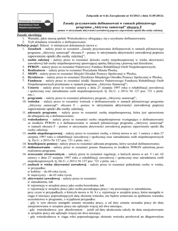 Załącznik nr 6 do Zarządzenia nr 41/2012 z dnia 11.09.2012r. Zasady przyznawania dofinansowań w ramach pilotażowego programu „Aktywny samorząd” obszaru F - pomoc w utrzymaniu aktywności zawodowej poprzez zapewnienie opieki dla osoby zależnej Zasady określają: 1. Warunki, jakie muszą spełnić Wnioskodawcy ubiegający się o uzyskanie dofinansowania. 2. Tryb składania wniosków o dofinansowanie. Definicje pojęć: Ilekroć w niniejszym dokumencie mowa o: 1. Zasadach – należy przez to rozumieć „Zasady przyznawania dofinansowań w ramach pilotażowego programu „Aktywny samorząd” obszaru F - pomoc w utrzymaniu aktywności zawodowej poprzez zapewnienie opieki dla osoby zależnej”; 2. osobie zależnej - należy przez to rozumieć dziecko osoby niepełnosprawnej w wieku aktywności zawodowej lub osoby niepełnosprawnej sprawującej opiekę faktyczną i prawną nad dzieckiem; 3. PFRON - należy przez to rozumieć Państwowy Fundusz Rehabilitacji Osób Niepełnosprawnych; 4. Realizatorze - należy przez to rozumieć Prezydenta Miasta Płocka; 5. MOPS - należy przez to rozumieć Miejski Ośrodek Pomocy Społecznej w Płocku; 6. Dyrektorze – należy przez to rozumieć Dyrektora Miejskiego Ośrodka Pomocy Społecznej w Płocku; 7. Funduszu – należy przez to rozumieć środki finansowe Państwowego Funduszu Rehabilitacji Osób Niepełnosprawnych przekazane w ramach programu „Aktywny Samorząd”; 8. Ustawie – należy przez to rozmieć ustawę z dnia 27 sierpnia 1997 roku o rehabilitacji zawodowej i społecznej oraz zatrudnianiu osób niepełnosprawnych /tj. Dz.U. z 2011r Nr 127 poz. 721 z późn. zm./; 9. programie - należy przez to rozumieć pilotażowy program „Aktywny samorząd”; 10. wniosku – należy przez to rozumieć wniosek o dofinansowanie w ramach pilotażowego programu „Aktywny samorząd”- obszaru F - pomoc w utrzymaniu aktywności zawodowej poprzez zapewnienie opieki dla osoby zależnej; 11. adresacie programu – należy przez to rozumieć osobę niepełnosprawną, która jest uprawniona do ubiegania się o dofinansowanie; 12. wnioskodawcy – należy przez to rozumieć osoby niepełnosprawne występujące o dofinansowanie ze środków PFRON o o dofinansowanie w ramach pilotażowego programu „Aktywny samorząd” w ramach obszaru F - pomoc w utrzymaniu aktywności zawodowej poprzez zapewnienie opieki dla osoby zależnej; 13. osobie niepełnosprawnej – należy przez to rozumieć osobę, o której mowa w art. 1 ustawy z dnia 27 sierpnia 1997 roku o rehabilitacji zawodowej i społecznej oraz zatrudnianiu osób niepełnosprawnych /tj. Dz.U. z 2011r Nr 127 poz. 721 z późn. zm./; 14. beneficjencie pomocy- należy przez to rozumieć adresata programu, który uzyskał dofinansowanie; 15. dofinansowaniu - należy przez to rozumieć pomoc finansową ze środków PFRON udzieloną przez realizatora programu; 16. orzeczeniu równoważnym – należy przez to rozumieć regulacje, o których mowa w art. 5 i art. 62 ustawy z dnia 27 sierpnia 1997 roku o rehabilitacji zawodowej i społecznej oraz zatrudnianiu osób niepełnosprawnych /tj. Dz.U. z 2011r Nr 127 poz. 721 z późn. zm./; 17. osobach w wieku aktywności zawodowej - należy przez to rozumieć pełnoletnie osoby w wieku, w przypadku: a/ kobiety – do 60 roku życia, b/ mężczyzny – do 65 roku życia; 18. aktywności zawodowej – należy przez to rozumieć: a/ zatrudnienie, lub b/ rejestrację w urzędzie pracy jako osoba bezrobotna, lub c/ rejestrację w urzędzie pracy jako osoba poszukująca pracy i nie pozostająca w zatrudnieniu, przy czym w przypadkach, o których mowa w lit. b i c, rejestracja w urzędzie pracy, która nastąpiła w ciągu 6 miesięcy poprzedzających datę złożenia wniosku, nie będzie uznawana za spełnienie warunku uczestnictwa w programie, z wyjątkiem przypadku: - gdy w tym okresie nastąpiło ustanie stosunku pracy, a od daty ustania stosunku pracy do dnia zarejestrowania w urzędzie pracy nie upłynęło więcej niż dwa miesiące, - gdy wnioskodawca jest absolwentem – jeżeli od daty ukończenia szkoły do dnia zarejestrowania w urzędzie pracy nie upłynęło więcej niż dwa miesiące, - gdy wnioskodawca w ciągu roku poprzedzającego złożenie wniosku przebywał na długotrwałym leczeniu (trwającym dłużej niż 3 miesiące), a od daty zakończenia leczenia do dnia zarejestrowania w urzędzie pracy nie upłynęło więcej niż dwa miesiące, - gdy wnioskodawca aktualnie uczestniczy w kursie lub szkoleniu służącym podniesieniu kwalifikacji zawodowych, a uczestnictwo w tym kursie lub szkoleniu wiązało się z koniecznością wcześniejszego wykreślenia z rejestru urzędy pracy; 19. zatrudnieniu – należy przez to rozumieć: a/ stosunek pracy na podstawie umowy o pracę, zawartej na czas nieokreślony lub określony, jednak nie krótszy niż 3 miesiące, b/ stosunek pracy na podstawie powołania, wyboru, mianowania oraz spółdzielczej umowy o pracę, jeżeli na podstawie przepisów szczególnych pracownik został powołany na czas określony; okres ten nie może być krótszy niż 3 miesiące, c/ działalność rolniczą w rozumieniu ustawy z dnia 20 grudnia 1990r o ubezpieczeniu społecznym rolników (Dz.U. z 2008r Nr 50 poz. 291 z późń. zm.), d/ działalność gospodarczą w rozumieniu ustawy z dnia 2 lipca 2004r o swobodzie działalności gospodarczej (Dz.U. z 2010r Nr 220 poz. 1447 z późń. zm), e/ zatrudnienie na podstawie umowy cywilnoprawnej, zawartej na okres nie krótszy niż 6 miesięcy, f/ staż zawodowy w rozumieniu ustawy z dnia 20 kwietnia 2004r i promocji zatrudnienia i instytucjach rynku pracy (Dz.U. z 2008r Nr 69 poz. 415 z późń. zm.); 20. gospodarstwie domowym – należy rozumieć w zależności od stanu faktycznego: a/ wspólne gospodarstwo domowe – gdy wnioskodawca ma wspólny budżet domowy z innymi osobami, wchodzącymi w skład jego rodziny, b/ samodzielne gospodarstwo domowe - gdy wnioskodawca mieszka i ut