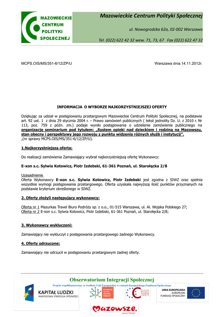 Mazowieckie Centrum Polityki Społecznej ul. Nowogrodzka 62a, 02-002 Warszawa Tel. (022) 622 42 32 wew. 71, 73, 67 Fax (022) 622 47 32 MCPS.OIS/MS/351-6/12/ZP/U Warszawa dnia.14.11.2012r. INFORMACJA O WYBORZE NAJKORZYSTNIEJSZEJ OFERTY Dziękując za udział w postępowaniu przetargowym Mazowieckie Centrum Polityki Społecznej, na podstawie art. 92 ust. 1 z dnia 29 stycznia 2004 r. – Prawo zamówień publicznych ( tekst jednolity Dz. U. z 2010 r. Nr 113, poz. 759 z późn. zm.) podaje wyniki postępowania o udzielenie zamówienia publicznego na organizację seminarium pod tytułem: „System opieki nad dzieckiem i rodziną na Mazowszu, stan obecny i perspektywy jego rozwoju z punktu widzenia różnych służb i instytucji”. ,(nr sprawy MCPS.OIS/MS/351-6/12/ZP/U). 1.Najkorzystniejsza oferta: Do realizacji zamówienia Zamawiający wybrał najkorzystniejszą ofertę Wykonawcy: E-xon s.c. Sylwia Kotowicz, Piotr Izdebski, 61-361 Poznań, ul. Starołęcka 2/8 Uzasadnienie Oferta Wykonawcy E-xon s.c. Sylwia Kotowicz, Piotr Izdebski jest zgodna z SIWZ oraz spełnia wszystkie wymogi postępowania przetargowego. Oferta uzyskała najwyższą ilość punktów przyznanych na podstawie kryterium określonego w SIWZ. 2. Oferty złożyli następujący wykonawcy: Oferta nr 1 Mazurkas Travel Biuro Podróży sp. z o.o., 01-515 Warszawa, ul. Al. Wojska Polskiego 27; Oferta nr 2 E-xon s.c. Sylwia Kotowicz, Piotr Izdebski, 61-361 Poznań, ul. Starołęcka 2/8; 3. Wykonawcy wykluczeni: Zamawiający nie wykluczył z postępowania przetargowego żadnego Wykonawcy. 4. Oferty odrzucone: Zamawiający nie odrzucił w postępowaniu przetargowym żadnej oferty. Obserwatorium Integracji Społecznej Projekt współfinansowany ze środków Unii Europejskiej w ramach Europejskiego Funduszu Społecznego Mazowieckie Centrum Polityki Społecznej ul. Nowogrodzka 62a, 02-002 Warszawa Tel. (022) 622 42 32 wew. 71, 73, 67 Fax (022) 622 47 32 5. Porównanie ofert (ocena): Nr oferty 1 2 Oznaczenie Wykonawcy Punktacja Mazurkas Travel Biuro Podróży sp. z o.o., 01-515 Warszawa, ul. Al. Wojska Polskiego 27 E-xon s.c. Sylwia Kotowicz, Piotr Izdebski, 61-361 Poznań, ul. Starołęcka 2/8 61,58 100,00 Umowa w sprawie zamówienia publicznego, zgodnie z art. 94 ust.1 pkt 1 ustawy Prawo zamówień publicznych, może być zawarta w terminie nie krótszym niż 10 dni od dnia przesłania zawiadomienia o wyborze najkorzystniejszej oferty, Dyrektor Mazowieckiego Centrum Polityki Społecznej /-/Zdzisław Biszewski Obserwatorium Integracji Społecznej Projekt współfinansowany ze środków Unii Europejskiej w ramach Europejskiego Funduszu Społecznego