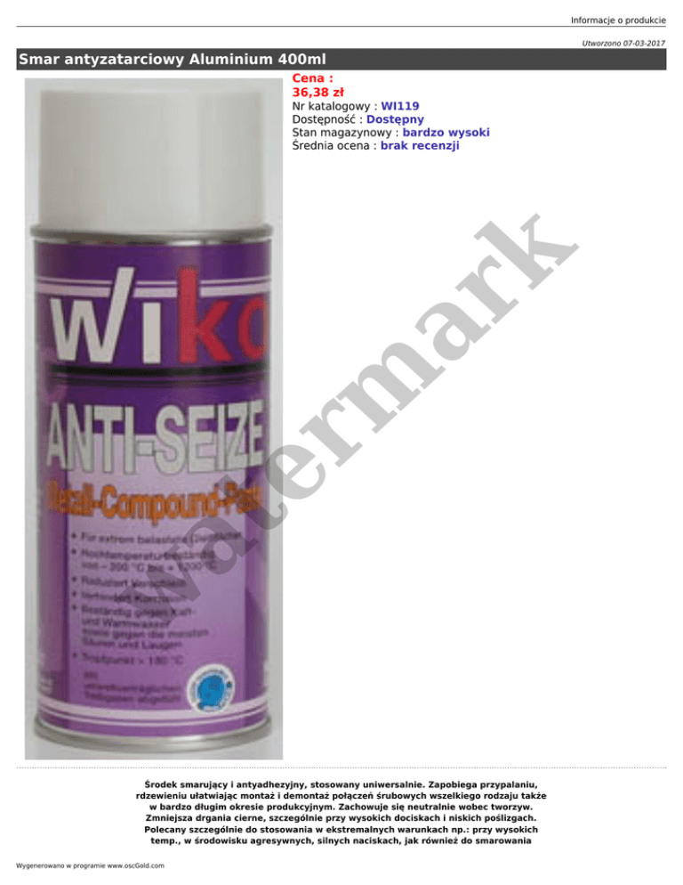 Informacje o produkcie Utworzono 07-03-2017 Smar antyzatarciowy Aluminium 400ml Cena : 36,38 zł w at er m ar k Nr katalogowy : WI119 Dostępność : Dostępny Stan magazynowy : bardzo wysoki Średnia ocena : brak recenzji Środek smarujący i antyadhezyjny, stosowany uniwersalnie. Zapobiega przypalaniu, rdzewieniu ułatwiając montaż i demontaż połączeń śrubowych wszelkiego rodzaju także w bardzo długim okresie produkcyjnym. Zachowuje się neutralnie wobec tworzyw. Zmniejsza drgania cierne, szczególnie przy wysokich dociskach i niskich poślizgach. Polecany szczególnie do stosowania w ekstremalnych warunkach np.: przy wysokich temp., w środowisku agresywnych, silnych naciskach, jak również do smarowania Wygenerowano w programie www.oscGold.com obciążonych łożysk i płaszczyzn ślizgowych (tylko w silnikach wolnobieżnych). Smar wysokotemperaturowy, do 1200 C. Właściwości Ochrona przed korozją i wysoce wydajny środek smarujący do części statycznych lub rotujących Szczególne zalety: Odporny na wysokie ciśnienie Odporny na ścieranie Utrudnia korozję i utlenianie Wodoodporny a także odporny na większość kwasów i ługów Redukuje tarcie i zużycie poprzez wspaniałe działanie rozdzielające, czym zapobiega przedwczesnemu kupowaniu części zamiennych Zapobiega zapiekaniu się śrub Może być stosowany w temperaturach –200 do + 1200°C Dziedziny zastosowań: er m ar k Do smarowania ekstremalnie obciążonych powierzchni ślizgu. Nadaje się do połączeń śrubowych, wtykowych i bagnetowych przy niewielkich prędkościach. Używany przy wymagających temperaturowo połączeniach śrubowych i innych. Sposób użycia: w at Optymalne warunki pracy i składowania to 15 do 25°C. Traktowaną powierzchnię oczyścić z innych smarów. Pojemnik przed użyciem intensywnie potrzasnąć, aż dobrze słyszalne będą kulki mieszające. Nanosić cienko i równomiernie z odległości około 20 do 30cm, potem pozwolić odparować.