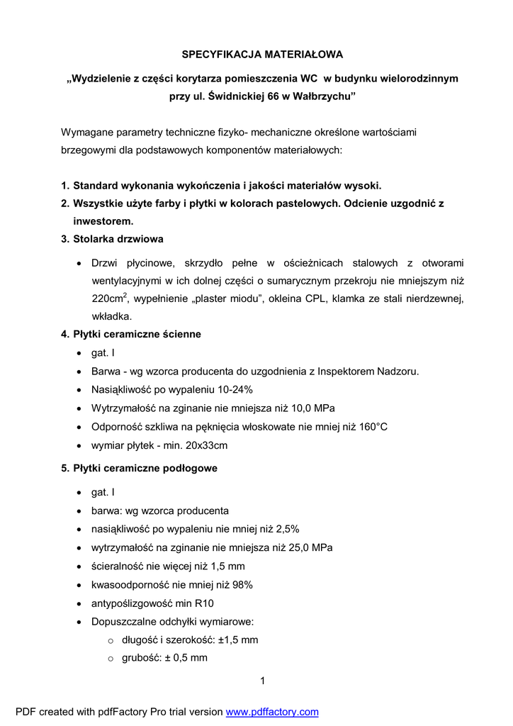 SPECYFIKACJA MATERIAŁOWA „Wydzielenie z części korytarza pomieszczenia WC w budynku wielorodzinnym przy ul. Świdnickiej 66 w Wałbrzychu” Wymagane parametry techniczne fizyko- mechaniczne określone wartościami brzegowymi dla podstawowych komponentów materiałowych: 1. Standard wykonania wykończenia i jakości materiałów wysoki. 2. Wszystkie użyte farby i płytki w kolorach pastelowych. Odcienie uzgodnić z inwestorem. 3. Stolarka drzwiowa • Drzwi płycinowe, skrzydło pełne w ościeżnicach stalowych z otworami wentylacyjnymi w ich dolnej części o sumarycznym przekroju nie mniejszym niż 220cm2, wypełnienie „plaster miodu”, okleina CPL, klamka ze stali nierdzewnej, wkładka. 4. Płytki ceramiczne ścienne • gat. I • Barwa - wg wzorca producenta do uzgodnienia z Inspektorem Nadzoru. • Nasiąkliwość po wypaleniu 10-24% • Wytrzymałość na zginanie nie mniejsza niż 10,0 MPa • Odporność szkliwa na pęknięcia włoskowate nie mniej niż 160°C • wymiar płytek - min. 20x33cm 5. Płytki ceramiczne podłogowe • gat. I • barwa: wg wzorca producenta • nasiąkliwość po wypaleniu nie mniej niż 2,5% • wytrzymałość na zginanie nie mniejsza niż 25,0 MPa • ścieralność nie więcej niż 1,5 mm • kwasoodporność nie mniej niż 98% • antypoślizgowość min R10 • Dopuszczalne odchyłki wymiarowe: o długość i szerokość: ±1,5 mm o grubość: ± 0,5 mm 1 PDF created with pdfFactory Pro trial version www.pdffactory.com o krzywizna: 1,0 mm • wymiar płytek - min. 33x33cm 6. Zaprawy klejowe Do mocowania płytek można stosować zaprawy cementowe marki 5 MPa lub 8MPa albo kleje elastyczne. 7. Gładź gipsowa • Produkt powinien być zgodny z: PN B-30042:1997 8. Suche tynki i ścianki działowe z płyt G-K • Płyty gipsowo-kartonowe gr. 12,5mm wg PN-B-79406:1997 i PN-B-79405:1997 • wilgotność powietrza w pomieszczeniach: ≤70% • Zaprawa gipsowa wg instrukcji producenta • Profile stalowe C100, U100 i łączniki wg instrukcji producenta • Materiał izolujący – wełna mineralna gr. 100mm o gęstości mineralnej 10kg/m3 wskaźniku izolacyjności akustycznej 49dB zgodna z: - Polska Norma PN-EN 13162:2002 - Certyfikat CE 1390-CPD-0017/04/P - EC Deklaracja Zgodności Nr CIG 00024, Nr CIG 00025 • Taśma zbrojąca i taśma uszczelniająca do izolacji akustycznej wg instrukcji producenta • ściany od strony komunikacji (korytarza) powyżej lamperii - gładzie gipsowe z pełnym przygotowaniem podłoża 9. Lamperie – komunikacja (korytarz) • I grupa cenowa • Suche mieszanki tynkarskie przygotowane fabrycznie powinny odpowiadać wymaganiom normy PN-B-10109:1998 lub aprobat technicznych 10. Posadzka Posadzki z zaprawy cementowej powinny być wykonane wg normy PN-90/B-14504 • Woda ( PN-EN 1008:2004) Do przygotowania zapraw stosować można każdą wodę zdatną do picia. Niedozwolone jest użycie wód ściekowych, kanalizacyjnych bagiennych oraz wód zawierających tłuszcze organiczne, oleje i muł. 2 PDF created with pdfFactory Pro trial version www.pdffactory.com • Piasek ( PN-EN 13139:2003) Piasek powinien spełniać wymagania obowiązującej normy przedmiotowej, a w szczególności: − nie zawierać domieszek organicznych, − składać się z różnych frakcji • Pospółka Pospółka - uziarnienie 0-31,5 mm • Cement wg normy PN-EN 191-1:2002 • Siatka posadzkowa Ø3 o oczku 10cm Siatki posadzkowe wykonywane są w arkuszachstandardowych oraz na specjalne zamówienie w zakresie wymiarówzewnętrznych (średnic i rozstawu prętów) w arkuszach o max szer. 3000 mm (+/-2mm) z prętów gładkich lub żebrowanych o wymiarach ø 3 do ø 10mm i oczkach od 100 do 400mm. Siatki te stosowane są do przeciwskurczowego zbrojenia betonu w posadzkach przemysłowych, mieszkalnych, garażach, pod ogrzewanie podłogowe itp. Siatki są wiązane w pakiety o masie maksymalnej do 3 ton i zaopatrzone w etykietę określającą typ maty, ilość i wagę. Siatkisą zgodne z normą DIN 488. 11. Płyty podłogowe OSB3 Płyty OSB3 gr. 25 mm zgodnie z dokumentacją projektową. Płyta OSB3 o grubości 25mm oraz standartowych wymiarach (mm) : 2440x1220, 2500x1250 lub ich wielokrotność. Maksymalna długość produkowanej płyty OSB to 7500mm, a maksymalna szerokość 2800mm. Płyta OSB produkowana jest według normy polskiej i europejskiej PN-EN 300:2000 w trzech rodzajach: OSB2 - płyta ogólnego stosowania w środowisku suchym; OSB3 - płyta konstrukcyjna do stosowania w srodowisku o umiarkowanej wilgotności na zewnątrz i wewnątrz - najpopularniejsza, najczęściej stosowana w budownictwie; OSB4 - płyta konstrukcyjna dla zastosowań nośnych o podwyższonych obciążeniach mechanicznych i w podwyższonej wilgotności na zewnątrz oraz wewnątrz (m.in. na belki dwuteowe i inne) - produkowana jest wyłącznie na zamówienie; 3 PDF created with pdfFactory Pro trial version www.pdffactory.com 12. Izolacja termiczna i akustyczna - wełna mineralna zgodna z: - Polska Norma PN-EN 13162:2002 - Certyfikat CE 1390-CPD-0017/04/P - EC Deklaracja Zgodności Nr CIG 00024, Nr CIG 00025 13. Izolacja przeciwwilgociowa - folii PCV. • grubości min. 1mm (+- 0,1 mm) • Wytrzymałość na rozrywanie powyżej 10 MPa. • Wydłużenie przy zerwaniu nie mniej niż 150%. • Zakres temperatury długotrwałego stosowania –15°C do +40°C. 4 PDF created with pdfFactory Pro trial version www.pdffactory.com