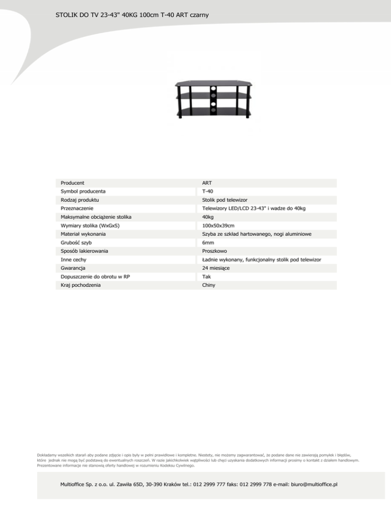 STOLIK DO TV 23-43" 40KG 100cm T-40 ART czarny Producent ART Symbol producenta T-40 Rodzaj produktu Stolik pod telewizor Przeznaczenie Telewizory LED/LCD 23-43" i wadze do 40kg Maksymalne obciążenie stolika 40kg Wymiary stolika (WxGxS) 100x50x39cm Materiał wykonania Szyba ze szkład hartowanego, nogi aluminiowe Grubość szyb 6mm Sposób lakierowania Proszkowo Inne cechy Ładnie wykonany, funkcjonalny stolik pod telewizor Gwarancja 24 miesiące Dopuszczenie do obrotu w RP Tak Kraj pochodzenia Chiny Dokładamy wszelkich starań aby podane zdjęcie i opis były w pełni prawidłowe i kompletne. Niestety, nie możemy zagwarantować, że podane dane nie zawierają pomyłek i błędów, które jednak nie mogą być podstawą do ewentualnych roszczeń. W razie jakichkolwiek wątpliwości lub chęci uzyskania dodatkowych informacji prosimy o kontakt z działem handlowym. Prezentowane informacje nie stanowią oferty handlowej w rozumieniu Kodeksu Cywilnego. Multioffice Sp. z o.o. ul. Zawiła 65D, 30-390 Kraków tel.: 012 2999 777 faks: 012 2999 778 e-mail: [email protected]