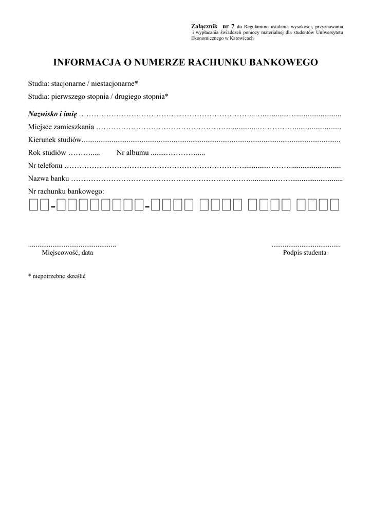 Załącznik nr 7 do Regulaminu ustalania wysokości, przyznawania i wypłacania świadczeń pomocy materialnej dla studentów Uniwersytetu Ekonomicznego w Katowicach INFORMACJA O NUMERZE RACHUNKU BANKOWEGO Studia: stacjonarne / niestacjonarne* Studia: pierwszego stopnia / drugiego stopnia* Nazwisko i imię …………………………………...………………………...…..............…........................ Miejsce zamieszkania ………………………………………………..............……………......................... Kierunek studiów.......................................................................................................................................... Rok studiów ………..... Nr albumu ........…………..... Nr telefonu ……………………………………………………………….............………........................... Nazwa banku ……………………………………………………………….............……............................ Nr rachunku bankowego: -- ............................................... Miejscowość, data * niepotrzebne skreślić ..................................... Podpis studenta