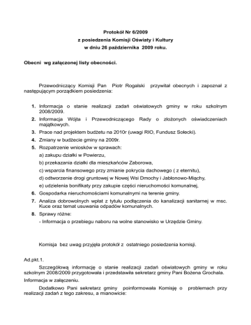 Protokół Nr 6/2009 z posiedzenia Komisji Oświaty i Kultury w dniu 26 października 2009 roku. Obecni wg załączonej listy obecności. Przewodniczący Komisji Pan Piotr Rogalski następującym porządkiem posiedzenia: przywitał obecnych i zapoznał z 1. Informacja o stanie realizacji zadań oświatowych gminy w roku szkolnym 2008/2009. 2. Informacja Wójta i Przewodniczącego Rady o złożonych oświadczeniach majątkowych. 3. Prace nad projektem budżetu na 2010r (uwagi RIO, Fundusz Sołecki). 4. Zmiany w budżecie gminy na 2009r. 5. Rozpatrzenie wniosków w sprawach: a) zakupu działki w Powierzu, b) przekazania działki dla mieszkańców Zaborowa, c) wsparcia finansowego przy zmianie pokrycia dachowego ( z eternitu), d) odtworzenie drogi gruntowej w Nowej Wsi Dmochy i Jabłonowo-Miąchy, e) udzielenia bonifikaty przy zakupie części nieruchomości komunalnej, 6. Gospodarka nieruchomościami komunalnymi na terenie gminy. 7. Analiza dobrowolnych wpłat z tytułu podłączenia do kanalizacji sanitarnej w msc. Kuce oraz temat usuwania odpadów komunalnych. 8. Sprawy różne: - Informacja o przebiegu naboru na wolne stanowisko w Urzędzie Gminy. Komisja bez uwag przyjęła protokół z ostatniego posiedzenia komisji. Ad.pkt.1. Szczegółową informację o stanie realizacji zadań oświatowych gminy w roku szkolnym 2008/2009 przygotowała i przedstawiła sekretarz gminy Pani Bożena Grochala. Informacja w załączeniu. Dodatkowo Pani sekretarz gminy poinformowała Komisję o realizacji zadań z tego zakresu, a mianowicie: problemach przy – istnieje konieczność zmiany obsługi finansowej szkoły, która powinna być obsługiwana za pomocą odrębnej jednostki organizacyjnej lub poprzez zatrudnienie głównego księgowego w szkole. W Urzędzie Gminy powinno być stanowisko do spraw nadzoru nad realizacją zadań z zakresu oświaty. Kontrola i nadzór jest przy Wójcie, natomiast realizacja należy do kierownika jednostki, czyli dyrektora szkoły lub do odrębnej jednostki, np. GZEAS. Nie może to być referat, ponieważ wówczas pracownicy referatu są pracownikami Wójta, a powinni być pracownikami dyrektora szkoły. U nas jest to źle prowadzone, zatem musimy podjąć pilną decyzję o zmianie. To wiąże się z dodatkowymi środkami finansowymi. – Drugim problemem jest zapewnienie średniego miesięcznego wynagrodzenia nauczycielom w poszczególnych stopniach awansu zawodowego. W przypadku kiedy nasi nauczyciele nie osiągną średniego miesięcznego wynagrodzenia, wówczas będziemy musieli pracować nad zmianą Regulaminu wynagradzania nauczycieli, aby gwarantował osiągnięcie tego wynagrodzenia w nowym roku. Komisja przyjęła powyższe sprawozdanie do akceptującej wiadomości. Ad.pkt.2 Informację o złożonych oświadczeniach majątkowych samorządowych, w imieniu Wójta przedstawiła sekretarz gminy. przez pracowników Informacja w załączeniu. Informację o złożonych oświadczeniach majątkowych przez radnych, w imieniu przewodniczącego rady przedstawiła sekretarz gminy. Informacja w załączeniu. Ad.pkt.3. Na temat prac nad projektem budżetu jako pierwsza głos zabrała Pani Wójt, zaznaczając, że do dnia dzisiejszego spływają wnioski z sołectw i od jednostek organizacyjnych. Potrzeb jest bardzo dużo, a środków finansowych bardzo mało. Musimy wybrać to co najpilniejsze. Ten rok jest wyjątkowo trudny, Pani skarbnik pierwszy raz będzie przygotowywała projekt budżet dla gminy. Jednak termin 15 listopada musimy dotrzymać i przesłać do Regionalnej Izby Obrachunkowej. Pani skarbnik gminy poinformowała , że Regionalna Izba Obrachunkowa analizując informację o przebiegu wykonania budżetu gminy za I półrocze 2009r. wydała pozytywną opinię z uwagami. Podkreślono po raz kolejny, że Samorządowy Ośrodek Kultury, Sportu i Rekreacji zajmuje się zarówno sportem jak i kulturą oraz prowadzi bibliotekę . Zgodnie z art. 9 ust. 1 ustawy z dnia 25.10.1991r o organizowaniu i prowadzeniu działalności kulturalnej jednostki samorządu terytorialnego organizują działalność kulturalną tworząc samorządowe instytucje kultury, dla których prowadzenie takiej działalności jest podstawowym celem statutowym. Inne są zasady finansowania zadań z zakresu kultury, a inne są zasady finansowania zadań z zakresu kultury fizycznej, sportu i rekreacji. R.I.O podkreśla, że nie jest możliwe – z uwagi na różne formy organizacyjne, jak i różne sposoby finansowania – łączenia w jednej formie organizacyjnej wykonywania zadań z zakresu kultury fizycznej i sportu z działalnością kulturalną. Finansowanie biblioteki odbywało się poprzez udzielenie dotacji dla SOKSiR, w skład którego wchodzi biblioteka. Ponadto zgodnie z ustawą o bibliotekach, biblioteki publiczne nie mogą być łączone z innymi instytucjami oraz z bibliotekami szkolnymi i pedagogicznymi. Zatem biblioteka gminna musi być zorganizowana w formie instytucji kultury, a tym samym wpisana do rejestru prowadzonego przez organizatora , nabywa osobowość prawną i rozpoczyna działalność. Temat ten powraca rok rocznie i w najbliższej przyszłości należy mim się zając. Wnioski do funduszu sołeckiego omówiła Pani Wójt analizując każdy wniosek. Poinformowała, iż z trzech sołectw nie wpłynęły wnioski, a dwa wpłynęły po terminie (Nowa Wieś Dmochy i Smolany). Pani sekretarz gminy poinformowała, iż zgodnie z ustawą o funduszu sołeckim termin na złożenie wniosku minął 30 września. Jeżeli ustawa nie dała żadnych możliwości przesunięcia terminy więc te, które wpłynęły po terminie, zarządzeniem wójta powinny być odrzucone, ponieważ nie spełniały wymogów formalnych. Wniosków nie złożyły sołectwa: Połcie Młode, Jastrząbki, Gołębie. Zdaniem sekretarz gminy należy zasięgnąć opinii radcy prawnego, czy wnioski, które wpłynęły po terminie, mogą być przyjęte . Pani Wójt omówiła poszczególne wnioski z sołectw, które zakwalif