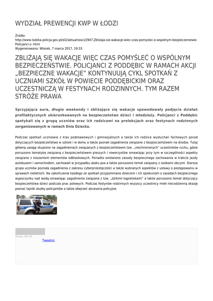 WYDZIAŁ PREWENCJI KWP W ŁODZI Źródło: http://www.lodzka.policja.gov.pl/el2/aktualnosci/2947,Zblizaja-sie-wakacje-wiec-czas-pomyslec-o-wspolnym-bezpieczenstwiePolicjanci-z-.html Wygenerowano: Wtorek, 7 marca 2017, 19:33 ZBLIŻAJĄ SIĘ WAKACJE WIĘC CZAS POMYŚLEĆ O WSPÓLNYM BEZPIECZEŃSTWIE. POLICJANCI Z PODDĘBIC W RAMACH AKCJI „BEZPIECZNE WAKACJE” KONTYNUUJĄ CYKL SPOTKAŃ Z UCZNIAMI SZKÓŁ W POWIECIE PODDĘBICKIM ORAZ UCZESTNICZĄ W FESTYNACH RODZINNYCH. TYM RAZEM STRÓŻE PRAWA Sprzyjająca aura, długie weekendy i zbliżające się wakacje spowodowały podjęcie działań profilaktycznych ukierunkowanych na bezpieczeństwo dzieci i młodzieży. Policjanci z Poddębic spotykali się z grupą uczniów oraz ich rodzicami na prelekcjach oraz festynach rodzinnych zorganizowanych w ramach Dnia Dziecka. Podczas spotkań uczniowie z klas podstawowych i gimnazjalnych a także ich rodzice wysłuchali fachowych porad dotyczących bezpieczeństwa w szkole i w domu a także poznali zagadnienia związane z bezpieczeństwem na drodze. Tutaj główną uwagę skupiono na zagadnieniach związanych z bezpieczeństwem tzw. „niechronionych” uczestników ruchu, gdzie poruszono tematykę związaną z bezpieczeństwem pieszych i rowerzystów omawiając przy tym w szczególności aspekty związane z noszeniem elementów odblaskowych. Ponadto omówiono zasady bezpiecznego zachowania w trakcie jazdy autobusem i samochodem, zachowań w przypadku ataku psa a także poruszono temat związany z osobami obcymi. Starsza grupa uczniów poznała zagadnienia z zakresu cyberprzestęczości a także wybranych aspektów z ustawy o postępowaniu w sprawach nieletnich. Na zakończenie każdego ze spotkań przypomniano dzieciom i ich opiekunom o zasadach bezpiecznego wypoczynku nad wodą omawiając zagadnienia związane z tzw. „dzikimi kąpieliskami” a także poruszono temat dotyczący bezpieczeństwa dzieci podczas prac polowych. Podczas festynów rodzinnych wszyscy uczestnicy mieli niecodzienną okazję poznać tajniki służby policjantów a także obejrzeć akcesoria policyjne. Ocena: 0/5 (0) Tweetnij