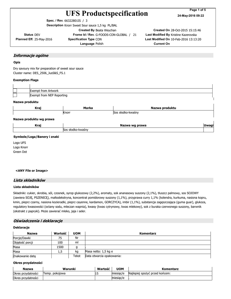Page 1 of 5 UFS Productspecification 24-May-2016 09:22 Spec. / Rev. 66322801IS / 3 Description Knorr Sweet Sour sauce 1,5 kg PL/BAL Created By Frame Id / Rev. Specification Type Language Status DEV Planned Eff. 25-May-2016 Beata Weychan G-FOODS-CON-GLOBAL / 21 CON Polish Created On 28-Oct-2015 15:15:46 Last Modified By Kristine Kazerovska Last Modified On 10-Feb-2016 13:13:20 Current On Informacje ogólne Opis Dry savoury mix for preparation of sweet sour sauce Cluster name: DES_2506_JusS&S_FS.1 Exemption Flags Exempt from Artwork Exempt from NEP Reporting Nazwa produktu Kraj Marka Knorr Nazwa produktu Sos słodko-kwaśny Nazwa produktu wg prawa Kraj Nazwa wg prawa Uwagi Sos słodko-kwaśny Symbole/Loga/Banery i znaki Logo UFS Logo Knorr Green Dot <ANY File or Image> Lista składników Lista składników Składniki: cukier, skrobia, sól, czosnek, syrop glukozowy (2,2%), aromaty, sok ananasowy suszony (2,1%), tłuszcz palmowy, sos SOJOWY (zawiera SOJĘ, PSZENICĘ), maltodekstryna, koncentrat pomidorowy suszony (1,1%), przyprawa curry 1,1% (kolendra, kurkuma, nasiona kopru, kmin, pieprz czarny, nasiona kozieradki, pieprz cayenne, kardamon, GORCZYCA), imbir (1,1%), substancja zagęszczająca (guma guar), glukoza, regulatory kwasowości (octany sodu, mleczan wapnia), kwasy (kwas cytrynowy, kwas mlekowy), sok z buraka czerwonego suszony, barwnik (ekstrakt z papryki). Może zawierać mleko, jaja i seler. Oświadczenia i deklaracje Deklaracje Nazwa Porcje/Dawki Objętość porcji Masa Masa Znakowanie datą Wartość 75 100 1500 1,5 UOM Nr ml g kg Tekst Komentarz . Masa netto: 1,5 kg e Data otwarcia opakowania: Okres przydatności Nazwa Okres przydatności Okres przydatności Warunki Temp. pokojowa Wartość UOM miesiąc/e 15 miesiąc/e Komentarz Najlepiej spożyć przed końcem: . UFS Productspecification Page 2 of 5 24-May-2016 09:22 Spec. / Rev. 66322801IS / 3 Description Knorr Sweet Sour sauce 1,5 kg PL/BAL Created By Frame Id / Rev. Specification Type Language Status DEV Planned Eff. 25-May-2016 Beata Weychan G-FOODS-CON-GLOBAL / 21 CON Polish Created On 28-Oct-2015 15:15:46 Last Modified By Kristine Kazerovska Last Modified On 10-Feb-2016 13:13:20 Current On Ryzyko zanieczyszczenia krzyżowego podczas procesu produkcji Information captured in the following property groups relates to the total allergen status of a product i.e. allergens inherent in the underlying ingredient composition of the product in addition to those due to cross contamination during processing of the product and which impact on final product labelling Alergeny Nazwa Tak Nie Stężenie Zboża zawierające gluten i produkty pochodne Skorupiaki i produkty pochodne Mięczaki i produkty pochodne Jaja i ich pochodne Ryby/Produkty rybne Orzeszki ziemne/Produkty z orzeszków ziemnych Soja/Produkty sojowe Mleko/Produkty mleczne Orzechy/Produkty z orzechów Nasiona sezamu/Produkty z nasion sezamu Siarczyny (=> 10mg/kg) Seler Musztarda/Produkty z gorczycy Łubin i produkty pochodne UOMZe składników Zanieczyszczenie mg/kg mg/kg mg/kg mg/kg mg/kg mg/kg mg/kg mg/kg mg/kg mg/kg mg/kg mg/kg mg/kg mg/kg Komentarz Diety - zagwarantowane Nazwa Hal-al Koszerna Wegańska Lakto-ovo-wegetariańska Lakto-wegetariańska Gluten Free Tak Nie Komentarz Tak Nie Komentarz Produkt wolny od: Nazwa Napromienianie Mięso Alkohol Meat acc. to Dir. 2001/101/EC Deklaracje Wyprodukowano zgodnie z zasadami HACCP (wymagane przez prawo żywnościowe UE). (For professionals) DLA SZEFÓW KUCHNI (zipper device text) PL: Po usunięciu etykiety, opakowanie nadaje się do przechowywania żywności. ENG: After removing, the label container is suitable for food storage Oświadczenia Nazwa Oświadczenie Oświadczenie Oświadczenie Oświadczenie 1 2 3 4 Opis (green leaf) Autentyczny smak. Najlepsze składniki / Authentic taste. Best ingredients . . . Uwagi UFS Productspecification Page 3 of 5 24-May-2016 09:22 Spec. / Rev. 66322801IS / 3 Description Knorr Sweet Sour sauce 1,5 kg PL/BAL Status DEV Planned Eff. 25-May-2016 Created By Frame Id / Rev. Specification Type Language Beata Weychan G-FOODS-CON-GLOBAL / 21 CON Polish Created On 28-Oct-2015 15:15:46 Last Modified By Kristine Kazerovska Last Modified On 10-Feb-2016 13:13:20 Current On Oświadczenia [Continued] Nazwa Oświadczenie Oświadczenie Oświadczenie Oświadczenie Oświadczenie Oświadczenie Oświadczenie Oświadczenie Oświadczenie Oświadczenie Oświadczenie Opis 5. 6 (icon) 7 (icon) 8 (icon) 9. 10(icon) 11(icon) 12(icon) 13. 14. 15. Uwagi Bez konserwantów* / ENG: No preservatives* Bez sztucznych barwników / ENG: No artificial colorants Bez dodatku glutaminianu sodu / ENG: No added MSG Stabilność w bemarze / ENG: Bain marie stability Na gorącą wodę / ENG: Hot boil Dozowanie/ ENG: Dosage 200 g / 1 L Oświadczenie 6 (note) PL: * Bez dodatku konserwantów - zgodnie z prawem. Oświadczenia / Orzeczenia (FoP- serving suggestion) Propozycja podania (BOP) Pasja dobrego smaku leży w naszej naturze! Aby przygotować smaczne i atrakcyjne dania o świeżym smaku, szefowie kuchni potrzebują wysokiej jakości składników. To naturalne! Właśnie dlatego szefowie kuchni KNORR stworzyli szeroki wachlarz profesjonalnych produktów ze starannie wyselekcjonowanymi, najwyższej jakości składnikami. Nasze warzywa oraz zioła dojrzewają w pełnym słońcu i zbierane są w szczycie sezonu. Stworzyliśmy program zrównoważonego rozwoju rolnictwa „Wzrost dla przyszłości”, aby pomagać chronić naszą planetę, a tym samym zagwarantować naszym klientom najlepsze składniki. Dołącz do pasjonatów doskonałego smaku i zrównoważonego rozwoju na: www.ufs.com PL: Sos słodko-kwaśny: • Doskonała podstawa do przygotowania dań kuchni orientalnej. • Wyśmienita kompozycja słodko- kwaśna, w połączeniu z przyprawami, daje szeroki wachlarz zastosowań. Instrukcje Sposób przygotowania Sposób przygotowania: Zawartość opakowania wsyp do 7,5 litrów wrzącej wody, dokładnie wymieszaj. Gotuj na wolnym og