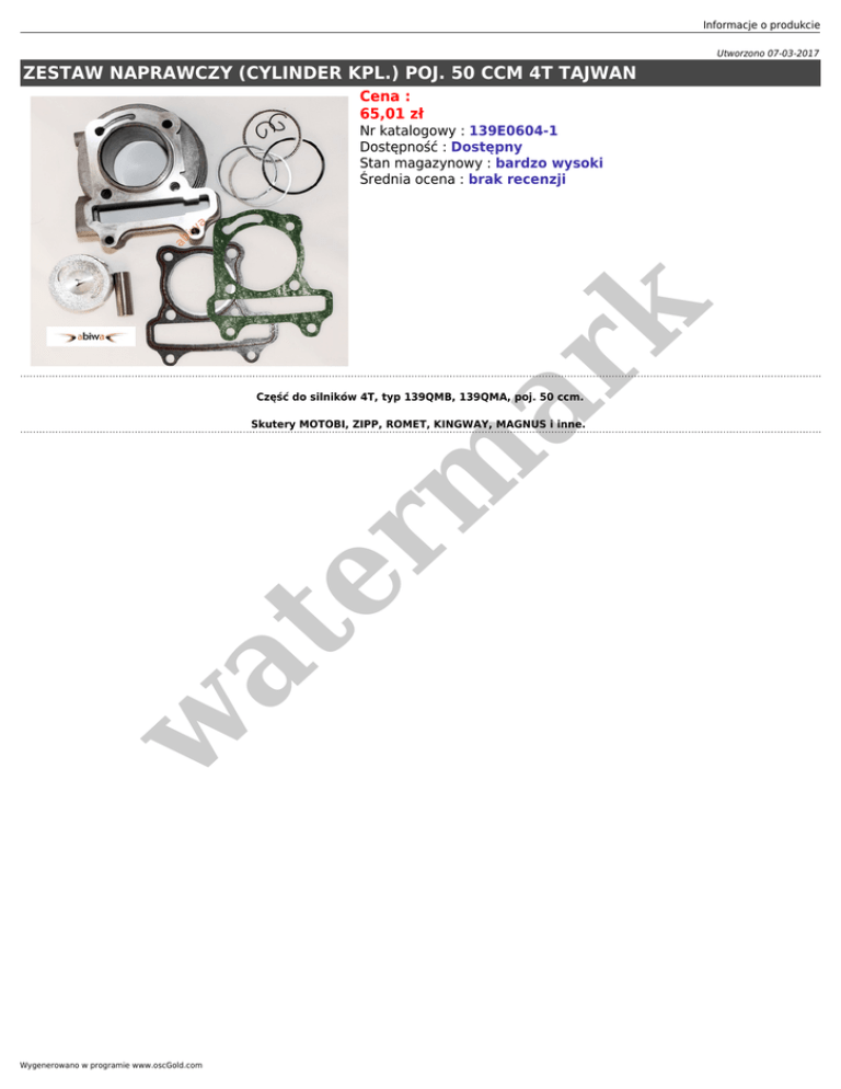 Informacje o produkcie Utworzono 07-03-2017 ZESTAW NAPRAWCZY (CYLINDER KPL.) POJ. 50 CCM 4T TAJWAN Cena : 65,01 zł er m ar k Nr katalogowy : 139E0604-1 Dostępność : Dostępny Stan magazynowy : bardzo wysoki Średnia ocena : brak recenzji Część do silników 4T, typ 139QMB, 139QMA, poj. 50 ccm. w at Skutery MOTOBI, ZIPP, ROMET, KINGWAY, MAGNUS i inne. Wygenerowano w programie www.oscGold.com