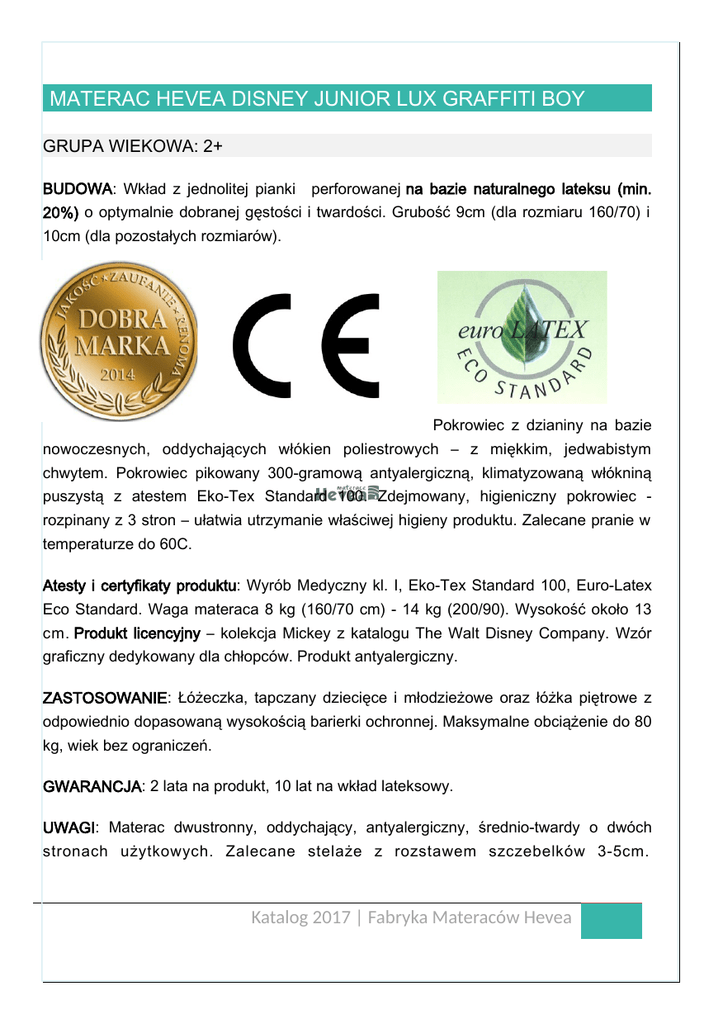 MATERAC HEVEA DISNEY JUNIOR LUX GRAFFITI BOY GRUPA WIEKOWA: 2+ BUDOWA: Wkład z jednolitej pianki perforowanej na bazie naturalnego lateksu (min. 20%) o optymalnie dobranej gęstości i twardości. Grubość 9cm (dla rozmiaru 160/70) i 10cm (dla pozostałych rozmiarów). Pokrowiec z dzianiny na bazie nowoczesnych, oddychających włókien poliestrowych – z miękkim, jedwabistym chwytem. Pokrowiec pikowany 300-gramową antyalergiczną, klimatyzowaną włókniną puszystą z atestem Eko-Tex Standard 100. Zdejmowany, higieniczny pokrowiec rozpinany z 3 stron – ułatwia utrzymanie właściwej higieny produktu. Zalecane pranie w temperaturze do 60C. Atesty i certyfikaty produktu: Wyrób Medyczny kl. I, Eko-Tex Standard 100, Euro-Latex Eco Standard. Waga materaca 8 kg (160/70 cm) - 14 kg (200/90). Wysokość około 13 cm. Produkt licencyjny – kolekcja Mickey z katalogu The Walt Disney Company. Wzór graficzny dedykowany dla chłopców. Produkt antyalergiczny. ZASTOSOWANIE: Łóżeczka, tapczany dziecięce i młodzieżowe oraz łóżka piętrowe z odpowiednio dopasowaną wysokością barierki ochronnej. Maksymalne obciążenie do 80 kg, wiek bez ograniczeń. GWARANCJA: 2 lata na produkt, 10 lat na wkład lateksowy. UWAGI: Materac dwustronny, oddychający, antyalergiczny, średnio-twardy o dwóch stronach użytkowych. Zalecane stelaże z rozstawem szczebelków 3-5cm. Katalog 2017 | Fabryka Materaców Hevea Rekomendowany stelaż Hevea Junior. Możliwość wykonania rozmiarów nietypowych. Realizacja do 7 dni roboczych. CENY DETALICZNE PLN oraz kody produktu: MATERAC HEVEA DISNEY JUNIOR LUX 160/70 590160210490 492 MATERAC HEVEA DISNEY JUNIOR LUX 160/80 590160210491 700 MATERAC HEVEA DISNEY JUNIOR LUX 160/90 590160210492 733 MATERAC HEVEA DISNEY JUNIOR LUX 180/80 590160210493 755 MATERAC HEVEA DISNEY JUNIOR LUX 190/80 590160210494 755 MATERAC HEVEA DISNEY JUNIOR LUX 180/90 590160210495 808 MATERAC HEVEA DISNEY JUNIOR LUX 200/80 590160210496 755 MATERAC HEVEA DISNEY JUNIOR LUX 190/90 590160210497 808 MATERAC HEVEA DISNEY JUNIOR LUX 200/90 590160210498 808 Katalog 2017 | Fabryka Materaców Hevea Katalog 2017 | Fabryka Materaców Hevea