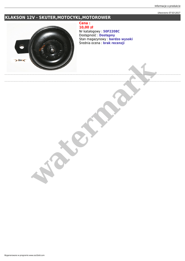 Informacje o produkcie Utworzono 07-03-2017 KLAKSON 12V - SKUTER,MOTOCYKL,MOTOROWER Cena : 10,00 zł w at er m ar k Nr katalogowy : 50F2208C Dostępność : Dostępny Stan magazynowy : bardzo wysoki Średnia ocena : brak recenzji Wygenerowano w programie www.oscGold.com