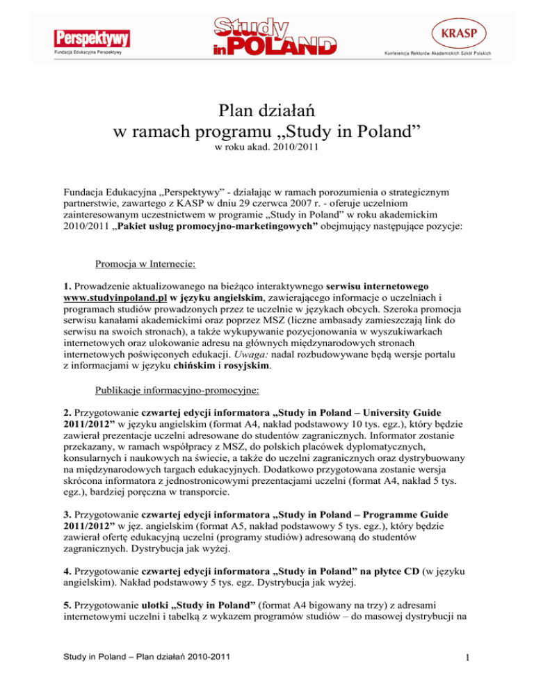 Plan działań w ramach programu „Study in Poland” w roku akad. 2010/2011 Fundacja Edukacyjna „Perspektywy” - działając w ramach porozumienia o strategicznym partnerstwie, zawartego z KASP w dniu 29 czerwca 2007 r. - oferuje uczelniom zainteresowanym uczestnictwem w programie „Study in Poland” w roku akademickim 2010/2011 „Pakiet usług promocyjno-marketingowych” obejmujący następujące pozycje: Promocja w Internecie: 1. Prowadzenie aktualizowanego na bieżąco interaktywnego serwisu internetowego www.studyinpoland.pl w języku angielskim, zawierającego informacje o uczelniach i programach studiów prowadzonych przez te uczelnie w językach obcych. Szeroka promocja serwisu kanałami akademickimi oraz poprzez MSZ (liczne ambasady zamieszczają link do serwisu na swoich stronach), a także wykupywanie pozycjonowania w wyszukiwarkach internetowych oraz ulokowanie adresu na głównych międzynarodowych stronach internetowych poświęconych edukacji. Uwaga: nadal rozbudowywane będą wersje portalu z informacjami w języku chińskim i rosyjskim. Publikacje informacyjno-promocyjne: 2. Przygotowanie czwartej edycji informatora „Study in Poland – University Guide 2011/2012” w języku angielskim (format A4, nakład podstawowy 10 tys. egz.), który będzie zawierał prezentacje uczelni adresowane do studentów zagranicznych. Informator zostanie przekazany, w ramach współpracy z MSZ, do polskich placówek dyplomatycznych, konsularnych i naukowych na świecie, a także do uczelni zagranicznych oraz dystrybuowany na międzynarodowych targach edukacyjnych. Dodatkowo przygotowana zostanie wersja skrócona informatora z jednostronicowymi prezentacjami uczelni (format A4, nakład 5 tys. egz.), bardziej poręczna w transporcie. 3. Przygotowanie czwartej edycji informatora „Study in Poland – Programme Guide 2011/2012” w jęz. angielskim (format A5, nakład podstawowy 5 tys. egz.), który będzie zawierał ofertę edukacyjną uczelni (programy studiów) adresowaną do studentów zagranicznych. Dystrybucja jak wyżej. 4. Przygotowanie czwartej edycji informatora „Study in Poland” na płytce CD (w języku angielskim). Nakład podstawowy 5 tys. egz. Dystrybucja jak wyżej. 5. Przygotowanie ulotki „Study in Poland” (format A4 bigowany na trzy) z adresami internetowymi uczelni i tabelką z wykazem programów studiów – do masowej dystrybucji na Study in Poland – Plan działań 2010-2011 1 targach edukacyjnych. W zależności od potrzeb ulotka drukowana będzie w języku angielskim, rosyjskim, francuskim, chińskim, arabskim lub hiszpańskim. Promocja na międzynarodowych targach i konferencjach edukacyjnych: 6. Promowanie polskiego szkolnictwa wyższego na wspólnym stoisku „Study in Poland” podczas następujących międzynarodowych targów edukacyjnych w roku akad. 2010/2011: a. Rosja – Moskwa, 11-13 listopada 2010 (Obrazowanie i Kariera) b. Ukraina – Kijów, 18-20 listopada 2010 (Osvita ta kar’era) c. Dania – Kopenhaga, 12-13 stycznia 2010 (Education Without Borders) d. Francja – Paryż, 28-29 stycznia 2011 (L’Etudiant International Fairs) e. Chiny – Pekin, 12-13 marca 2011 (CIEET) f. Ukraina – Kijów, 14-16 kwietnia 2011 (Osvita ta kar’era) g. Arabia Saudyjska – Rijadh, 19-22 kwietnia 2011 (International Exhibition & Conference on Higher Education) Uwaga: Korzystanie ze stoisk „Study in Poland” w ramach tych wydarzeń jest dla uczelni uczestniczących w programie bezpłatne! 7. Promowanie polskiego szkolnictwa wyższego na wspólnym stoisku „Study in Poland” podczas następujących konferencji edukacyjnych w roku akademickim 2010/2011: a) Kanada – Vancouver, 29 maja - 3 czerwca 2011 (NAFSA) b) Dania – Kopenhaga, 13-16 września 2011 (EAIE) Uwaga: Korzystanie ze stoisk „Study in Poland” w ramach tych wydarzeń jest dla uczelni uczestniczących w programie bezpłatne! Organizacja wydarzeń specjalnych w krajach priorytetowych: 8. Promocja polskich uczelni na Ukrainie (Charków, Donieck, Kijów, Lwów) podczas I edycji StudentEURO czyli „Polsko-ukraińskiego turnieju drużyn akademickich w piłce nożnej 2010-2012”. Termin: 20-26 września 2010. 9. Opcja: Zorganizowanie Dni Polskich Uczelni w Rosji (Moskwa), 11-13 listopada 2010 r. Uwaga: realizacja zależna od decyzji KRASP. 10. Zorganizowanie III Dni Polskich Uczelni na Ukrainie (Odessa, Mikołajew, Chersoń, Symferopol), 26-30 marca 2010 11. Zorganizowanie II Dni Polskich Uczelni w Kazachstanie (Astana, Karaganda), Uwaga: termin do ustalenia Konferencje na temat internacjonalizacji i szkolenia w kraju: 12. Spotkanie konsultacyjne prorektorów uczelni uczestniczących w programie „Study in Poland”, Warszawa, 25 listopada 2010. Study in Poland – Plan działań 2010-2011 2 13. Ogólnopolska konferencja „Studenci zagraniczni w Polsce 2011”, Łódź (Politechnika Łódzka), 21-22 stycznia 2011. 14. Szkolenie w zakresie promocji polskiego szkolnictwa wyższego za granicą (Akademia „Study in Poland”), kwiecień 2011 Inne inicjatywy: 15. Wydawanie i rozsyłanie elektronicznie co trzy tygodnie Newslettera „Study in Poland” dot. umiędzynarodowienia studiów w Polsce i na świecie. 16. Opracowanie raportu „Studenci zagraniczni w Polsce 2010”, październik 2010. 17. Zorganizowanie II edycji konkursu na najlepszego studenta zagranicznego w Polsce pod hasłem INTERSTUDENT, finał w listopadzie 2010. 18. Prowadzenie w Polsce kampanii promującej studiowanie w języku angielskim. Hasło kampanii: „Nie musisz wyjeżdżać z kraju, żeby studiować po angielsku – STUDY IN POLAND!” oraz „Study in Poland – in English!”. 19. Opcja: Uruchomienie od 1 marca 2011 r. kolejnych zagranicznych punktów informacyjno-promocyjnych „Study in Poland”: a. Kazachstan (Astana lub Almaty), b. Rosja (Moskwa), c. Chiny (Pekin lub Szanghaj). 20. Opcja: Wyjazd studyjny do krajów Ameryki Łacińskiej (Brazylia, Argentyna), luty/marzec 2011. Uwaga: realizacja zależna od 
