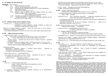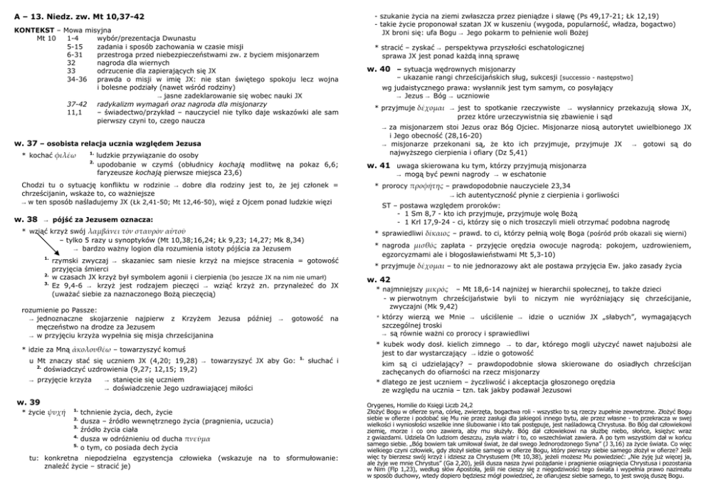 A – 13. Niedz. zw. Mt 10,37-42 KONTEKST – Mowa misyjna Mt 10 1-4 wybór/prezentacja Dwunastu 5-15 zadania i sposób zachowania w czasie misji 6-31 przestroga przed niebezpieczeństwami zw. z byciem misjonarzem 32 nagroda dla wiernych 33 odrzucenie dla zapierających się JX 34-36 prawda o misji w imię JX: nie stan świętego spokoju lecz wojna i bolesne podziały (nawet wśród rodziny) → jasne zadeklarowanie się wobec nauki JX 37-42 radykalizm wymagań oraz nagroda dla misjonarzy 11,1 – świadectwo/przykład – nauczyciel nie tylko daje wskazówki ale sam pierwszy czyni to, czego naucza w. 37 – osobista relacja ucznia względem Jezusa * kochać φιλέω 1. 2. ludzkie przywiązanie do osoby upodobanie w czymś (obłudnicy kochają modlitwę na pokaz 6,6; faryzeusze kochają pierwsze miejsca 23,6) Chodzi tu o sytuację konfliktu w rodzinie → dobre dla rodziny jest to, że jej członek = chrześcijanin, wskaże to, co ważniejsze → w ten sposób naśladujemy JX (Łk 2,41-50; Mt 12,46-50), więź z Ojcem ponad ludzkie więzi w. 38 → pójść za Jezusem oznacza: * wziąć krzyż swój λαμβάνει τὸν σταυρὸν αὐτοῦ – tylko 5 razy u synoptyków (Mt 10,38;16,24; Łk 9,23; 14,27; Mk 8,34) → bardzo ważny logion dla rozumienia istoty pójścia za Jezusem 1. 2. 3. później → gotowość na * idzie za Mną ἀκολουθέω – towarzyszyć komuś u Mt znaczy stać się uczniem JX (4,20; 19,28) → towarzyszyć JX aby Go: 2. doświadczyć uzdrowienia (9,27; 12,15; 19,2) → przyjęcie krzyża 1. słuchać i → stanięcie się uczniem → doświadczenie Jego uzdrawiającej miłości w. 39 * życie ψυχή 1. 2. 3. 4. 5. * stracić – zyskać → perspektywa przyszłości eschatologicznej sprawa JX jest ponad każdą inną sprawę w. 40 – sytuacja wędrownych misjonarzy – ukazanie rangi chrześcijańskich sług, sukcesji [successio - następstwo] wg judaistycznego prawa: wysłannik jest tym samym, co posyłający → Jezus → Bóg → uczniowie * przyjmuje δέχομαι → jest to spotkanie rzeczywiste → wysłannicy przekazują słowa JX, przez które urzeczywistnia się zbawienie i sąd → za misjonarzem stoi Jezus oraz Bóg Ojciec. Misjonarze niosą autorytet uwielbionego JX i Jego obecność (28,16-20) → misjonarze przekonani są, że kto ich przyjmuje, przyjmuje JX → gotowi są do najwyższego cierpienia i ofiary (Dz 5,41) w. 41 uwaga skierowana ku tym, którzy przyjmują misjonarza → mogą być pewni nagrody → w eschatonie * prorocy προφήτης – prawdopodobnie nauczyciele 23,34 → ich autentyczność płynie z cierpienia i gorliwości ST – postawa względem proroków: - 1 Sm 8,7 - kto ich przyjmuje, przyjmuje wolę Bożą - 1 Krl 17,9-24 - ci, którzy się o nich troszczyli mieli otrzymać podobna nagrodę * sprawiedliwi δίκαιος – prawd. to ci, którzy pełnią wolę Boga (pośród prób okazali się wierni) rzymski zwyczaj → skazaniec sam niesie krzyż na miejsce stracenia = gotowość przyjęcia śmierci w czasach JX krzyż był symbolem agonii i cierpienia (bo jeszcze JX na nim nie umarł) Ez 9,4-6 → krzyż jest rodzajem pieczęci → wziąć krzyż zn. przynależeć do JX (uważać siebie za naznaczonego Bożą pieczęcią) rozumienie po Passze: → jednoznaczne skojarzenie najpierw z Krzyżem Jezusa męczeństwo na drodze za Jezusem → w przyjęciu krzyża wypełnia się misja chrześcijanina - szukanie życia na ziemi zwłaszcza przez pieniądze i sławę (Ps 49,17-21; Łk 12,19) - takie życie proponował szatan JX w kuszeniu (wygoda, popularność, władza, bogactwo) JX broni się: ufa Bogu → Jego pokarm to pełnienie woli Bożej tchnienie życia, dech, życie dusza – źródło wewnętrznego życia (pragnienia, uczucia) źródło życia ciała dusza w odróżnieniu od ducha πνεῦμα o tym, co posiada dech życia tu: konkretna niepodzielna egzystencja człowieka (wskazuje na to sformułowanie: znaleźć życie – stracić je) * nagroda μισθός zapłata - przyjęcie orędzia owocuje nagrodą: pokojem, uzdrowieniem, egzorcyzmami ale i błogosławieństwami Mt 5,3-10) * przyjmuje δέχομαι – to nie jednorazowy akt ale postawa przyjęcia Ew. jako zasady życia w. 42 * najmniejszy μικρός – Mt 18,6-14 najniżej w hierarchii społecznej, to także dzieci - w pierwotnym chrześcijaństwie byli to niczym nie wyróżniający się chrześcijanie, zwyczajni (Mk 9,42) * którzy wierzą we Mnie → uściślenie → idzie o uczniów JX „słabych”, wymagających szczególnej troski → są równie ważni co prorocy i sprawiedliwi * kubek wody dosł. kielich zimnego → to dar, którego mogli użyczyć nawet najubożsi ale jest to dar wystarczający → idzie o gotowość kim są ci udzielający? – prawdopodobnie słowa skierowane do osiadłych chrześcijan zachęcanych do ofiarności na rzecz misjonarzy * dlatego ze jest uczniem – życzliwość i akceptacja głoszonego orędzia ze względu na ucznia – tzn. tak jakby podawał Jezusowi Orygenes, Homilie do Księgi Liczb 24,2 Złożyć Bogu w ofierze syna, córkę, zwierzęta, bogactwa roli - wszystko to są rzeczy zupełnie zewnętrzne. Złożyć Bogu siebie w ofierze i podobać się Mu nie przez zasługi dla jakiegoś innego bytu, ale przez własne - to przekracza w swej wielkości i wyniosłości wszelkie inne ślubowanie i kto tak postępuje, jest naśladowcą Chrystusa. Bo Bóg dał człowiekowi ziemię, morze i co ono zawiera, aby mu służyły. Bóg dał człowiekowi na służbę niebo, słońce, księżyc wraz z gwiazdami. Udziela On ludziom deszczu, zsyła wiatr i to, co wszechświat zawiera. A po tym wszystkim dał w końcu samego siebie. „Bóg bowiem tak umiłował świat, że dał swego Jednorodzonego Syna” (J 3,16) za życie świata. Co więc wielkiego czyni człowiek, gdy złożył siebie samego w ofierze Bogu, który pierwszy siebie samego złożył w ofierze? Jeśli więc ty bierzesz swój krzyż i id