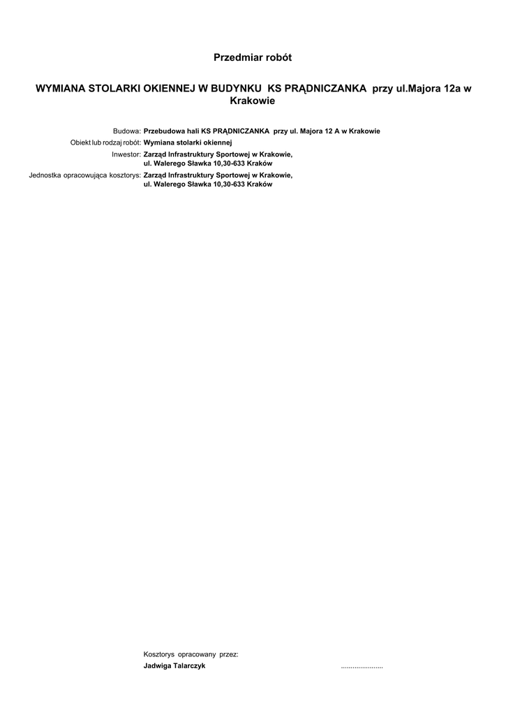 Przedmiar robót WYMIANA STOLARKI OKIENNEJ W BUDYNKU KS PRĄDNICZANKA przy ul.Majora 12a w Krakowie Budowa: Przebudowa hali KS PRĄDNICZANKA przy ul. Majora 12 A w Krakowie Obiekt lub rodzaj robót: Wymiana stolarki okiennej Inwestor: Zarząd Infrastruktury Sportowej w Krakowie, ul. Walerego Sławka 10,30-633 Kraków Jednostka opracowująca kosztorys: Zarząd Infrastruktury Sportowej w Krakowie, ul. Walerego Sławka 10,30-633 Kraków Kosztorys opracowany przez: Jadwiga Talarczyk ...................... Prądniczanka Hala_Wymiana okien i drzwi_Inwestorski Zuzia10 (C) Datacomp 1994-2012(lic. 14332) strona nr: 2 Przedmiar robót Nr Podstawa <!--TAG#PRZDM#PODST--!> Opis robót Jm Kosztorys WYMIANA STOLARKI OKIENNEJ W BUDYNKU KS PRĄDNICZANKA przy ul.Majora 12a w Krakowie 1 Rozdział Roboty demontażowe i montażowe 1.1 Element Demontaż parapetów Ilość 1.1.1 KNR 401/354/11 Wykucie z muru, parapetów wewnętrznych m 10,00 1.1.2 KNR 401/354/11 Wykucie z muru, parapetów zewnętrznych m 10,00 m2 6,60 m2 32,00 1.2 Element Stolarka okienna i drzwi balkonowe :PCV kolor biały -okna uchylno-otwieralne (wszystkie skrzydła,profil 6-cio komorowy z wkładką stalową ocynkowaną ,szyby float 2x4 mm z wkładką dystansową 16 mm z wypełnieniem argonem o wsp. przenikania ciepła u mniejsze lub równe 1,0 W/m2 st.K. Okucia obwiedniowe (np. Win Haus) 1.2.1 KNR 19/930/2 (1) Wymiana okien o powierzchni do 0,6 m2 1.2.2 KNR 19/930/6 (1) Wymiana okien o powierzchni do 1,5 m2 1.2.3 KNR 19/930/9 (1) Wymiana okien o powierzchni do 2,0 m2 m2 20,20 1.2.4 KNR 19/930/11 Wymiana okien o powierzchni ponad 2,5 m2 (1) m2 65,50 1.2.5 KNR 19/930/11 Wymiana witryny o powierzchni ~ 17,0 m2 - 2 szt (1) m2 34,00 1.2.6 KNR 19/930/12 Wymiana drzwi balkonowych - 2 szt (1) m2 3,60 1.2.7 KNR 202/129/2 Obsadzenie parapetów wewnętrznych szerokość 280 mm granitowe , jasny popiel gr. 3 cm szr. 28 cm ( z kapinosem przeciwociekowym) mb 170,00 1.2.8 KNR 202/129/2 Obsadzenie parapetów zewnętrznych szerokość 300 mm blacha powlekana w kolorze jasny popiel wypuszczone poza istn. obrys muru 15 cm mb 170,00 m2 10,20 szt 9,00 szt 9,00 szt 9,00 16,200000 m2 16 kpl 9,00 szt 8 1.3 Element Wymiana drzwi zewnętrznych aluminiowych 1.3.1 KNKRB 3/702/6 Wymiana drzwi zewnętrznych Aluminiowych kolor RAL 7038 , 3- komorowe ,szyba o wsp. przenikania ciepła u mniejsze lub równe 1,0 W/m2 st.K.szyba bezpieczna (klejona,zespolona,obustronnie foliowana , min. 1 zamek z atestem ( min . 3 klucze) 1.4 Element Wymiana drzwi w sanitariatach - drewniane wodoodporne pełne typu PORTA (z podcięciem wentylacyjnym ) z ościeżnicami regulowanymi o wym. 900x200 ,klamki i szyldy dopasować do pozostałych istniejących(wkładki patentowe z jednostronną możliwością otwierania -pokrętłem ręcznym kolor czarny) min. 3 klucze 1.4.1 Kalkulacja indywidualna Demontaż istniejących drzwi wraz z ościeżnicami - bez uszkodzenia (do wykorzystania dla Inwestora ) 1.4.2 Kalkulacja indywidualna Zabezpieczenie zdemontowanych drzwi wraz z klamkami i zamkami tekturą oraz folią 1.4.3 Kalkulacja indywidualna Drzwi wraz z ościeżnicami - DOSTAWA 1.4.4 KNR 19/1024/7 Analogia_Drzwi wraz z ościeżnicami i kratkami wentylacyjnymi - MONTAŻ (1) Wyliczenie ilości robót: 0,90*2,0*9 16,200000 RAZEM: 1.4.5 Kalkulacja indywidualna Dostawa i montaż odbojników do drzwi 1.4.6 KNR 202/1215/3 Drzwiczki rewizyjne w pomieszczeniu hali sportowej chromowane Prądniczanka Hala_Wymiana okien i drzwi_Inwestorski Zuzia10 (C) Datacomp 1994-2012(lic. 14332) strona nr: 3 Zestawienie materiałów Lp. 1. 2. 3. 4. 5. 6. 7. 8. 9. 10. 11. 12. 13. 14. 15. 16. 17. 18. 19. 20. 21. 22. Nazwa materiału J.m. Demontaż istniejących drzwi wraz z ościeżnicami Dostawa i montaż odbojników do drzwi Drzwi balkonowe 90 x 200 Drzwi wraz z ościeżnicami (regulowanymi)z podcięciem wentylacyjnym -dostawa (wodoodporne) Drzwi zewnetrzne aluminiowe zewnętrzne ( wiatrołap) sterowanie elektroniczne na fotokomórkę Drzwi zewnetrzne aluminiowe zewnętrzne profil ciepły,samozamykacz,zameka i szyld stal nierdzewna ,wkładka patentowa ,min. 3 klucze Drzwiczki rewizyjne chromowane Gips budowlany szpachlowy Gwoździe budowlane gołe Kotwy Kotwy rozporowe ze stali ocynkowanej kpl. Masa uszczelniająca silikonowa "Silikon" Okna i drzwi balkonowe PVC Parapet wewnętrzny granitowy szer. 28 cm (jasny) Parapet zewnętrzny o szerokości 30 cm Pianka poliuretanowa - opakowanie ciśnieniowe Płyta gipsowo-kartonowa grubości 9.5˙mm Sucha zaprawa szpachlowa do tynków "Ceresit˙CT˙29" Szpachlówka celulozowa ogólnego stosowania biała Zabezpieczenie zdemontowanych drzwi wraz z klamkami i zamkami tekturą oraz folią - materiał Zaprawa budowlana zwykła Zaprawa cementowa M12 (m.80) Ilość szt. szt m2 szt m2 9 9 3,6 9 6,4 m2 kpl kg kg szt szt dm3 m2 mb m dm3 m2 kg dm3 szt m3 m3 3,8 8 355,164 1,53 680 952,428 9,369 158,3 170 170 51,191 140,421 638,869 4,284 9 4,42 0,056 Zestawienie sprzętu Lp. 1. Środek transportowy (1) 2. Wyciąg Nazwa sprzętu J.m. m-g m-g Razem m-g (z dokładnością do zaokrągleń): Ilość 11,1252 45,3 56,4252