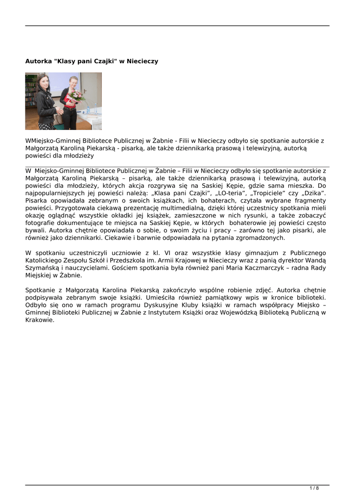 Autorka "Klasy pani Czajki" w Niecieczy WMiejsko-Gminnej Bibliotece Publicznej w Żabnie - Filii w Niecieczy odbyło się spotkanie autorskie z Małgorzatą Karoliną Piekarską - pisarką, ale także dziennikarką prasową i telewizyjną, autorką powieści dla młodzieży W Miejsko-Gminnej Bibliotece Publicznej w Żabnie – Filii w Niecieczy odbyło się spotkanie autorskie z Małgorzatą Karoliną Piekarską – pisarką, ale także dziennikarką prasową i telewizyjną, autorką powieści dla młodzieży, których akcja rozgrywa się na Saskiej Kępie, gdzie sama mieszka. Do najpopularniejszych jej powieści należą: „Klasa pani Czajki”, „LO-teria”, „Tropiciele” czy „Dzika”. Pisarka opowiadała zebranym o swoich książkach, ich bohaterach, czytała wybrane fragmenty powieści. Przygotowała ciekawą prezentację multimedialną, dzięki której uczestnicy spotkania mieli okazję oglądnąć wszystkie okładki jej książek, zamieszczone w nich rysunki, a także zobaczyć fotografie dokumentujące te miejsca na Saskiej Kępie, w których bohaterowie jej powieści często bywali. Autorka chętnie opowiadała o sobie, o swoim życiu i pracy – zarówno tej jako pisarki, ale również jako dziennikarki. Ciekawie i barwnie odpowiadała na pytania zgromadzonych. W spotkaniu uczestniczyli uczniowie z kl. VI oraz wszystkie klasy gimnazjum z Publicznego Katolickiego Zespołu Szkół i Przedszkola im. Armii Krajowej w Niecieczy wraz z panią dyrektor Wandą Szymańską i nauczycielami. Gościem spotkania była również pani Maria Kaczmarczyk – radna Rady Miejskiej w Żabnie. Spotkanie z Małgorzatą Karolina Piekarską zakończyło wspólne robienie zdjęć. Autorka chętnie podpisywała zebranym swoje książki. Umieściła również pamiątkowy wpis w kronice biblioteki. Odbyło się ono w ramach programu Dyskusyjne Kluby książki w ramach współpracy Miejsko – Gminnej Biblioteki Publicznej w Żabnie z Instytutem Książki oraz Wojewódzką Biblioteką Publiczną w Krakowie. 1/8 2/8 3/8 4/8 5/8 6/8 7/8 8/8 Powered by TCPDF (www.tcpdf.org)