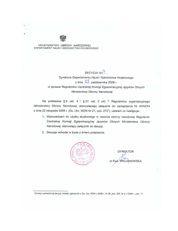 1 I. POSTANOWIENIA OGÓLNE §1 1. Niniejszy Regulamin określa zasady funkcjonowania Centralnej Komisji Egzaminacyjnej Języków Obcych Ministerstwa Obrony Narodowej oraz stanowi podstawę prowadzenia przez nią egzaminów ze znajomości języków obcych w resorcie obrony narodowej zgodnie z porozumieniem standaryzacyjnym STANAG 6001. 2. Ilekroć w Regulaminie jest mowa o: 1) Studium - należy przez to rozumieć Wojskowe Studium Nauczania Języków Obcych; 2) Komisji – należy przez to rozumieć Centralną Komisję Egzaminacyjną Języków Obcych Ministerstwa Obrony Narodowej, 3) podkomisji - należy przez to rozumieć komisję egzaminacyjną powołaną przez przewodniczącego CKEJO MON na konkretny termin egzaminu, 4) zespole egzaminacyjnym - należy przez to rozumieć egzaminatorów prowadzących egzamin z wydzieloną grupą egzaminowanych, 5) egzaminie - należy przez to rozumieć egzamin prowadzony w oparciu o standardy zawarte w porozumieniu STANAG 6001, podzielony na części w zakresie poszczególnych sprawności językowych: słuchania, mówienia, czytania i pisania, 6) arkuszu odpowiedzi – należy przez to rozumieć pisemną pracę egzaminacyjną ze sprawności słuchanie, czytanie lub pisanie. §2 1. Centralna Komisja Egzaminacyjna Języków Obcych MON jest etatową komórką organizacyjną Wojskowego Studium Nauczania Języków Obcych w Łodzi, powołaną w celu prowadzenia postępowania egzaminacyjnego ze znajomości języków obcych w resorcie Obrony Narodowej. 2. W skład Komisji wchodzą: 1) przewodniczący, 2) zastępca przewodniczącego; 3) specjalista ds. testów; 4) egzaminatorzy; 5) referent techniczny. 2 3. Przewodniczącym Komisji jest Komendant Wojskowego Studium Nauczania Języków Obcych. §3 Do zadań Komisji należy: 1) przygotowywanie i organizacja egzaminów resortowych ze znajomości języka angielskiego, francuskiego, niemieckiego i rosyjskiego; 2) prowadzenie nostryfikacji świadectw znajomości języków obcych wydanych przez placówki zagraniczne zgodnie z porozumieniem STANAG 6001 oraz dyplomów ukończenia krajowych i zagranicznych studiów lingwistycznych; 3) prowadzenie certyfikacji językowej kandydatów do służby poza granicami państwa; 4) przygotowywanie i wdrażanie egzaminów modelowych z języków obcych, o których mowa w pkt.1; 5) organizacja szkoleń dla osób powoływanych do prac w podkomisjach egzaminacyjnych; 6) prowadzenie prac badawczo-wdrożeniowych mających na celu doskonalenie metod egzaminowania; 7) wydawanie świadectw i certyfikatów oraz ich ewidencjonowanie; 8) prowadzenie analiz statystycznych dotyczących przebiegu egzaminów resortowych; 9) przechowywanie protokołów egzaminacyjnych, arkuszy odpowiedzi oraz protokołów kodowania – zgodnie z przepisami o archiwizacji w wojsku i postanowieniami niniejszego regulaminu; 10) zapewnienie powszechnie dostępnej informacji o zasadach prowadzenia egzaminów wraz z ich przykładami. II. ZASADY ORGANIZACJI EGZAMINÓW §4 1. Materiały egzaminacyjne na każdy poziom egzaminu przygotowywane są w oparciu o egzaminy modelowe. 2. Egzaminy modelowe opracowywane są przez Komisję i zatwierdzane przez dyrektora departamentu właściwego do spraw szkolnictwa wojskowego. 3 3. Poziom egzaminu ustalany jest na podstawie wewnętrznej procedury w oparciu o sesje pilotażowe. §5 1. Decyzję o przeprowadzeniu egzaminu ze znajomości języka obcego podejmuje przewodniczący Komisji na podstawie harmonogramu egzaminów na dany rok opracowywanego przez dyrektora departamentu właściwego ds. szkolnictwa wojskowego. 2. Za zgodą dyrektora departamentu właściwego ds. szkolnictwa wojskowego dopuszcza się możliwość organizacji egzaminów w terminach innych niż zawarte w harmonogramie, o którym mowa w ust. 1. 3. W celu przeprowadzenia egzaminu przewodniczący Komisji powołuje podkomisje. 4. Na czas egzaminów, do prac w podkomisjach mogą być powoływani egzaminatorzy spoza etatowego składu Komisji. 5. Podkomisję tworzą przewodniczący, egzaminatorzy oraz sekretarz. 6. Przewodniczącym podkomisji prowadzącej egzamin na poziomie 3 i 4 jest etatowy pracownik Komisji. §6 1. Egzaminatorzy prowadzą egzamin w zespołach egzaminacyjnych. 2. W skład zespołu egzaminacyjnego wchodzą co najmniej 2 osoby. 3. O doborze egzaminatorów do zespołu egzaminacyjnego decyduje przewodniczący podkomisji. 4. Przydział zespołów egzaminacyjnych do poszczególnych grup egzaminacyjnych odbywa się w drodze losowania. §7 1. Do prac w podkomisjach egzaminacyjnych powoływane są osoby z wykształceniem filologicznym lub ze znajomością języka obcego na minimum 4 poziomie znajomości danego języka obcego, które posiadają przygotowanie pedagogiczne (metodyczne) oraz wydany przez Komisję certyfikat egzaminatora, o którym mowa w § 32. 2. Przed przystąpieniem do egzaminowania, egzaminatorzy zobowiązani są zapoznać się z kryteriami oceny sprawności mówienie. 4. Wymogów, o których mowa w ust. 1, nie stosuje się wobec sekretarza podkomisji. 4 §8 1. Do składu podkomisji, powoływanych do przeprowadzenia egzaminu na poziomie 3 po zakończeniu kursu językowego, przewodniczący Komisji powołuje egzaminatorów spoza ośrodka kształcenia językowego, w którym odbywa się egzamin. 2. W skład zespołu egzaminacyjnego na poziomie 3 wchodzą nauczyciele (lektorzy) z różnych ośrodków kształcenia językowego. 3. W przypadku choroby lub zaistnienia innych okoliczności uniemożliwiających uczestnictwo osoby powołanej do udziału w pracach podkomisji, przewodniczący Komisji może włączyć do jej składu egzaminatora nie spełniającego wymogów, o których mowa w ust. 1 lub 2. §9 1. W przypadku egzaminów, o których mowa w § 8, protokoły z wynikami egzaminu w sprawności mówienie oraz arkusze odpowiedzi są dostarczane do siedziby Komisji. 2. Arkusze odpowiedzi są sprawdzane przez etatowych pracowników Komisji. 3. Na podstawie wyników egzaminu ze wszystkich sprawności, Komisja