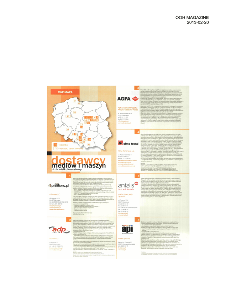 OOH MAGAZINE 2013-02-20 W Portfolio Agfa Graphics znajdą Państwo plotery z rodziny Anapurna oraz Jeti, jak również przemysłowe maszyny .flatbed" :M-Press Tiger i M-Press Leonard, łączące technologię UV z sitodrukową. Łącznie to kilkanaście modeli do drukowania solwentowego, UV (zarówno na podłożach płaskich, jak i z roli) oraz bezpośrednio na tkaninach. Innowacyjne rozwiązania czynią te plotery najwydajniejszymi urządzeniami w swojej klasie. Przykładowe modele UV to Anapurna M4f, Anapurna Mw, Anapurna M1600, Anapurna M2050 i Anapurna M2540 FB, a także Jeti 1224 HDC. Jeti 3020 Titan, Jeti 3348 Galaxy i JetSpeed. Do bezpośredniego drukowania na tkaninach Jeti 3324 Aquajet; oraz do drukowania solwentowego Jeti 3324 Solvent RTR, Jeti 3348 HSS RTR i Jeti 5024 Solvent RTR. V&P MAPA AGFA Agfa Graphics NV Spółka Akcyjna Oddział w Polsce A1. Jerozolimskie 195 A 02-222 Warszawa tel. 22 31 11900 ELE E3 fax22/31 U 966 [email protected] www.agfa-potska.pl a E alma trend i l - siedziba | l | - oddział / salon firmowy Alma Trend Sp. z o.o. ul. Wojska Polskiego 2 40-669 Katowice tel/fax32 202 8 4 2 0 [email protected] mediów i maszyn druk wielkoformatowy 4print)ers.pl 4 Printers S.C. ul. Lucerny 25/27 04-687 Warszawa tel. 22 292 39 49,22 292 38 79 tel. kom. 601 709101 [email protected] www.4printers.pl www.sklep.4printers.pl W 4Printers oferujemy wsparcie oraz doradztwo dla drukarni i agencji reklamo wych specjalizujących się w profesjonalnym druku cyfrowym, wielkoformatowym i produkcji reklam. Naszym klientom dostarczamy urządzenia do druku, laminacji i wykończenia, części zamienne do maszyn, akcesoria do przygotowania aplikacji oraz systemy do ekspozycji wydruków. Świadczymy usługi w zakresie doradztwa i informacji dla firm działających w branży reklamowej. Naszej firmie zaufały już setki drukami i agencji w Polsce oraz międzynarodowi producenci, liderzy w swoich branżach. 4Printers jest oficjalnym dystrybutorem: • • • • • MTEX - plotery d o bezpośredniego druku na tkaninach SEAL Graphics - laminatory i laminaty d o w y d r u k ó w wielkoformatowych KORNIT Digital - profesjonalne urządzenia d o bezpośredniego druku na odzieży DAIGE Inc. - ręczne laminatory płynne Ez-Glide 4ink - atramenty solventowe i UV Oferujemy także urządzenia i atramenty d o druku wielkoformatowego pracujące w technologii solwent i UV oraz trybach rolowym i flatbed, producentów takich jak Roland, Mimaki, M u t o h , Jeti, Matan, Naszym Klientom dostarczamy urządzenia nowe oraz używane, dostępne w komisie na stronie internetowej. 4Prmters t o przede wszystkim bardzo szeroka oferta części zamiennych i akcesoriów d o postprodukcji: • Akcesoria d o aplikacji i montażu reklam • Części zamienne d o laminatorów SEAL GRAPHICS • Głowice i części zamienne d o ploterów • Systemy wystawiennicze • Laminaty rolowe i płynne Zapraszamy d o sklepu internetowego: www.sklep.4printers.pl ADP Polska ul. Błękitna 70 04-663 Warszawa tel. + 4 8 2 2 773 85 75 www.adp| ADP Polska: materiały i maszyny do cyfrowego druku wielkoformatowego. DYSTRYBUGA MATERIAŁÓW: Posiadamy jedną z najszerszych ofert na materiały do druku solwentowego. Jesteśmy wyłącznym dystrybutorem międzynarodowej firmy Spandex Marki materiałów w ofercie: Image Perfect, Orafol, Avery Denison, Ferrari, Gerber Edge. Szerokie spektrum sprzedawanych materiałów pozwala na zaopatrzenie klientów w produkty, z których z powodzeniem będą mogli wykonać grafikę podświetlaną, podłogową, samochodową, okienną czy też grafikę do systemów wystawienniczych typu RoJI-up, Pop-up. DYSTRYBUGA MASZYN PLOTERY drukujące i tnąco-drukujące: Roland, Asbru (wyłączność w Polsce), Mimaki; plotery tnące: SummaCut LAMINATORY: jesteśmy wyłącznym dystrybutorem profesjonalnych laminatorów KALA oraz dystrybutorem laminatorów płynnych Seal i polskich maszyn LCM LG. TRYMERY: wyłączna dystrybucja trymerów EcoCut oraz dystrybucja trymerów KeenCut. Pozostałe: profesjonalne oczkarki pneumatyczne oraz ręczne Hiker, zgrzewarki Leister, akcesoria do wykańczania wydruków. Zajmujemy się serwisem ploterów drukujących: Roland, Asbru, Mimaki, Mutoh (łącznie z wykonywaniem profili barwnych ICC oraz naprawą elektroniki). Mamy jedną z najszerszych ofert na atramenty zamienne. Dostarczamy atramenty do ploterów: Roland, Mimaki, Mutoh, Seiko 64$, HP9000/1000, Oce. Marki atramentów w sprzedaży: Sioen, VersiColor, Colorifictnk, Triangle, SunChemical, Sericol. Jesteśmy wyłącznym dystrybutorem tuszy Sioen w Polsce. Specjalizujemy się w dostarczaniu rozwiązań najwyższej jakości. Naszym celem jest budowanie trwałych relacji z klientami poprzez wiedzę, kompeten cje, doświadczenie i rzetelność. www.aemjet.com.pl www.almatrend.com.pl www.dobreplotery.com.pl antalis (^> Just ask A n t a l i s ANTALIS POLAND Sp. z o.o. Atramenty serii ET i HL2 - do ploterów solwentowych drukujących za pomocą piezoelektrycznych głowic Spectra, o wielkości kropli 30,50 i 80 pl. Dostępne w sześciu kolorach CMYK + Lc i Lm, charakteryzujące się szerokim gamutem barwnym, niskim zużyciem głowic i elementów eksploatacyjnych. Atramenty te są dedykowane do ploterów solwentowych Jeti 3312 i 3324, Atramenty Aldura - do ploterów solwentowych, charakteryzujące się szerokim gamutem barwnym, niskim zużyciem głowic i elementów eksploatacyjnych. Nieszkodliwe dla obsługi (bezwonne opary), co umożliwia ich eksploatację w pomieszczeniach biurowych bez kosztownych systemów wentylacji. Zapewniają lepszą reprodukcję skali szarości oraz równomierny połysk, także w obszarach o dużym pokryciu atramentem. Występują w sześciu kolorach CMYK + Lc i Lm. Polecane do stosowania w ploterach marki Roland, Mimaki i Mutoh, Alma Trend istnieje od 1991 roku i jest jedną z największych firm na rynku polskim, która oferuje kompleksową obsługę handlową i serwisową drukarń wielkoformatowych, firm reklamowych 