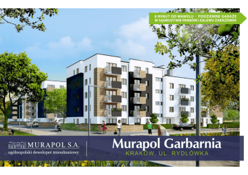 8 MINUT OD WAWELU . PODZIEMNE GARAŻE W SĄSIEDZTWIE PARKÓW I ZALEWU ZAKRZÓWEK Murapol Garbarnia K R A K Ó W, U L . R Y D L Ó W K A O Nas DOCENILI NAS KAPITUŁA I FORUM BIZNESU . NAJWYŻSZA JAKOŚĆ WYKONAWSTWA INWESTYCJI Kapituła, złożona z przedstawicieli Ministerstwa Rozwoju Regionalnego, Polskiej Agencji Rozwoju Przedsiębiorczości, Polskiego Forum ISO 9000 i przedstawicieli redakcji Forum Biznesu w ramach uznania dla prac związanych z podnoszeniem jakości w Murapol S.A., postanowiła uhonorować firmę tytułem „Najwyższa Jakość” i Srebrnym Godłem Quality International 2013. DUN & BRADSTREET POLAND . GWARANCJA WIARYGODNOŚCI I PŁYNNOŚCI FINANSOWEJ Międzynarodowa wywiadownia gospodarcza oceniła wiarygodność i stabilność Murapolu na podstawie: analizy moralności płatniczej według programu Bisnode International Payment Monitor, analizy wskaźników finansowych ostatnich dostępnych sprawozdań finansowych, największej w Polsce bazy relacyjnych powiązań korporacyjnych i osobowych. Wszystkie zagadnienia były dla nas błahostką. Kolejny rok z rzędu jesteśmy Firma Wiarygodną Biznesowo. FORBES . NAJWYŻSZY POZIOM OFEROWANYCH USŁUG „Diamenty Forbes” są przyznawane przedsiębiorstwom, które najszybciej i najdynamiczniej zwiększają swoją wartość oraz świadczą usługi najwyższej jakości. Murapol S.A. został doceniony przez redakcję miesięcznika Forbes i otrzymał tytuł „Diamentu Miesięcznika Forbes”. BUSINESS CENTER CLUB . NAJWYŻSZE STANDARDY OSIEDLI Laureatami Medalu Europejskiego są firmy, które odpowiadają standardom europejskim i spełniają wszystkie wymagane prawem normy, posiadają odpowiednie licencje i patenty. Medal Europejski przyznawany przez Business Centre Club firma Murapol S.A. otrzymała za inwestycje w Tychach i we Wrocławiu, które zostały wybudowane zgodnie z najwyższymi standardami. WSPIERAMY W KRAKOWIE AKADEMIA MALUCHA AKADEMIA PIŁKARSKA 21 TURNIEJ MURAPOL CUP DEDYKOWANA OPIEKA SPRZEDAŻOWA GDAŃSK Opiekun Klienta to doradca, który poprowadzi Państwa przez cały proces sprzedaży mieszkania – od pierwszego zapytania, poprzez formalności urzędowe, doradztwo dotyczące rynku nieruchomości, aż do momentu wygaśnięcia 3-letniej rękojmi na nabyty lokal. POZNAŃ WARSZAWA STREFA KLIENTA NA MURAPOL.PL To serwis internetowy, który krok po kroku pokaże Państwu, jak nabyć upragnione M, a po jego odbiorze gwarantuje bezpośredni kontakt z Opiekunem. Bez wychodzenia z domu możecie Państwo uzyskać pełną informację na każdy temat związany z mieszkaniem i osiedlem. WROCŁAW KATOWICE KRAKÓW TYCHY WIELICZKA BIELSKO-BIAŁA GWARANCJA BEZPIECZEŃSTWA Wprowadziliśmy unikatowy dwustopniowy system odbioru mieszkań. To podejście sprawia, że macie Państwo dużo większą kontrolę nad przebiegiem procesu budowlanego. Dodatkowo w trakcie budowy możecie Państwo zgłosić uwagi do jakości lub sposobu wykonania poszczególnych elementów Waszego mieszkania. 28 INWESTYCJI W 9 MIASTACH DORADZTWO PROJEKTOWE I KREDYTOWE W swojej ofercie posiadamy 18 osiedli mieszkaniowych i 10 inwestycji komercyjnych, położonych blisko centrum miasta, ale z dala od wielkomiejskiego zgiełku. Natomiast dzięki stałej współpracy z dostawcami usług i materiałów budowlanych, możemy oferować Państwu najlepsze ceny. Zachęcamy Państwa do skorzystania z bezpłatnej konsultacji z naszymi partnerskimi biurami projektowymi, które zrealizują każdą aranżację. Natomiast dzięki współpracy ze spółką Home Credit Group gwarantujemy najatrakcyjniejszy kredyt hipoteczny bez prowizji banku. MURAPOL S.A. STRONA 3 O inwest yc j i Murapol Garbarnia 8 MINUT OD STAREGO MIASTA, OSIEDLE W OTOCZENIU PARKÓW I TERENÓW REKREACYJNYCH, NAJBARDZIEJ POSZUKIWANE METRAŻE MIESZKAŃ – TO NASZA INWESTYCJA MURAPOL GARBARNIA STANDARD, CZYLI KAMERALNE BUDYNKI Z PODZIEMNYMI GARAŻAMI W ramach pierwszego etapu inwestycji zaplanowano budowę czterech kameralnych budynków. Zaprojektowano w nich łącznie 196 mieszkań – kawalerek, dwu oraz trzypokojowych. Dzięki przemyślanej koncepcji architektonicznej oraz możliwości indywidualnej aranżacji lokatorzy wprowadzą się do przestronnych i funkcjonalnych wnętrz. Metraże lokali kształtują się od 25 do 68 mkw., co odpowiada najczęstszym potrzebom klientów. Mieszkania na parterze zostaną wyposażone w tarasy, a te na piętrach w balkony. Dla wygody osób zmotoryzowanych pod każdym budynkiem powstaną obszerne parkingi. Dotarcie na najwyższe poziomy ułatwią cichobieżne windy. Teren inwestycji zostanie zagospodarowany zielenią oraz wybrukowanymi alejkami, co umożliwi mieszkańcom wypoczynek bez konieczności opuszczania terenu osiedla. CO ZYSKUJESZ, CZYLI PRZEWAGA NAD KONKURENCJĄ Osiedle Murapol Garbarnia to doskonała propozycja dla osób, które cenią sobie wygodę życia w centrum dużego miasta, a jednocześnie chcą spędzać wolny czas w naturalnym otoczeniu. Osiedle wyróżnia się bogactwem roślinności oraz sąsiedztwem urokliwych terenów przyrzecznych. Rozbudowana sieć ścieżek i dróg rowerowych zarówno przy osiedlu, jak również w pobliskich parkach, umożliwi mieszkańcom odpoczynek, a amatorom aktywnego spędzania wolnego czasu - rekreację. Dzięki niewielkiej liczbie mieszkań w budynkach lokatorzy zyskają poczucie prywatności i bezpieczeństwa. Na wyciągnięcie ręki są również liczne atrakcje centrum Krakowa z jego zabytkami, restauracjami, galeriami czy muzeami. MURAPOL GARBARNIA . KRAKÓW . STRONA 5 U OLK SZ CZYLI W OTOCZENIU PRZYRODY I BLISKO CENTRUM Osiedle powstaje w prawobrzeżnej części Krakowa – w dzielnicy Podgórze, blisko ścisłego centrum stolicy Małopolski. Zaledwie 8 minut zajmuje dotarcie stąd do Starego Miasta z Wawelem oraz Rynkiem Głównym. E KATOWIC Wzgórza Krzesławickie Prądnik Biały Bronowice Zwierzyniec Rejon ul. Rydlówki i Kobierzyńskiej to wyjątkowo cicha oraz bezpieczna część Krakowa. Mieszkańcy odnajd