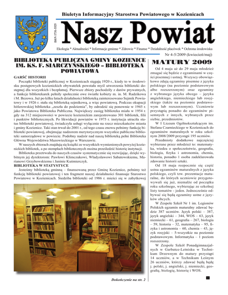 ISSN 1731-3325 Biuletyn Informacyjny Starostwa Powiatowego w Kozienicach Nasz Powiat Ekologia * Aktualności * Informacje gminne * Zdrowie * Finanse * Działalność placówek * Ochrona środowiska Biblioteka Publiczna Gminy Kozienice im. ks. F. Siarczyńskiego – Biblioteka Powiatowa Garść historii Początki biblioteki publicznej w Kozienicach sięgają 1920 r., kiedy to w środowisku postępowych kozienickich obywatelek powstała myśl utworzenia biblioteki dostępnej dla wszystkich i bezpłatnej. Pierwsze zbiory pochodziły z darów prywatnych, a funkcje bibliotekarek pełniły społecznie owe światłe kobiety m. in. M. Radzikowa i M. Bezowa. Już po kilku latach działalności biblioteką zainteresowano Sejmik Powiatowy i w 1926 r. stała się biblioteką sejmikową, a więc powiatową. Podczas okupacji hitlerowskiej biblioteka „zeszła do podziemia”, by odrodzić się ponownie w 1945 r. jako Powiatowa Biblioteka Publiczna. Największy zasięg biblioteka miała w 1954 r. gdy na 312 miejscowości w powiecie kozienickim zarejestrowano 301 bibliotek, filii i punktów bibliotecznych. Po likwidacji powiatów w 1975 r. instytucja utraciła status biblioteki powiatowej, świadczyła usługi wyłącznie na rzecz mieszkańców miasta i gminy Kozienice. Taki stan trwał do 2001 r., od tego czasu znowu pełnimy funkcję biblioteki powiatowej, obejmując nadzorem merytorycznym wszystkie publiczne biblioteki samorządowe w powiecie. Podobny nadzór nad naszą biblioteką pełni Biblioteka Główna Województwa Mazowieckiego w Warszawie. W naszych zbiorach znajdują się książki ze wszystkich wymienionych powyżej kozienickich bibliotek, a po stemplach bibliotecznych można prześledzić historię instytucji. Biblioteka przetrwała do naszych czasów systematycznie się rozwijając, dzięki wybitnym jej dyrektorom: Pawłowi Klimczukowi, Władysławowi Sabatowskiemu, Marianowi Grzybowskiemu i Janinie Kuśmierczyk. Biblioteka w statystyce Jesteśmy biblioteką gminną – finansowaną przez Gminę Kozienice, pełnimy też funkcję biblioteki powiatowej i ten fragment naszej działalności finansuje Starostwo Powiatowe w Kozienicach. Siedziba biblioteki od 1986 r. mieści się w zabytkowej Dokończenie na str. 2 Nr 4-5/2009 (kwiecień/maj) MATURY 2009 Od 4 maja aż do 29 maja młodzież zmagać się będzie z egzaminami w części pisemnej i ustnej. Wszyscy obowiązkowo zdają egzaminy pisemne z języka polskiego (na poziomie podstawowym albo rozszerzonym) oraz egzaminy z wybranego języka obcego – języka angielskiego, niemieckiego lub rosyjskiego (także na poziomie podstawowym lub rozszerzonym). Uczniowie przystąpią ponadto do egzaminów pisemnych z innych, wybranych przez siebie, przedmiotów. W I Liceum Ogólnokształcącym im. Stefana Czarnieckiego w Kozienicach do egzaminów maturalnych w roku szkolnym 2008/2009 przystąpi 195 uczniów. Przedmioty dodatkowe najczęściej wybierane przez młodzież to: matematyka, wiedza o społeczeństwie, geografia, biologia, fizyka i astronomia, chemia, historia, ponadto 1 osoba zadeklarowała zdawanie historii sztuki. Od 18 maja rozpocznie się część ustna egzaminów maturalnych z języka polskiego, czyli tzw. prezentacje maturalne, do których uczniowie przygotowywali się już, niemalże od początku roku szkolnego, wybierając ze szkolnej listy tematów - jeden. Jednocześnie odbywać się będą egzaminy ustne z języków obcych. W Zespole Szkół Nr 1 im. Legionów Polskich egzamin maturalny zdawać będzie 387 uczniów. Język polski – 387, język angielski – 344, WOS – 63, język niemiecki – 61, geografia – 267, biologia – 59, historia – 32, matematyka – 95, fizyka i astronomia – 60, chemia – 43, język rosyjski – 5-wszystkie na poziomie podstawowym. Informatyka – 1 poziom rozszerzony. W Zespole Szkół Ponadgimnazjalnych w Garbatce-Letnisku w Technikum Drzewnym do matury przystąpi 14 uczniów, a w Technikum Leśnym 26 uczniów, którzy zdawać będą będę j. polski, j. angielski, j. niemiecki, geografię, biologię, historię i WOS. Informacje Dokończenie ze str. 1 Biblioteka Publiczna Gminy Kozienice im. ks. F. Siarczyńskiego – Biblioteka Powiatowa willi z 1923 r. przy ul. J. Kochanowskiego 22. Posiadamy łącznie 8 placówek, 2 w Kozienicach i 6 filii wiejskich w Brzeźnicy, Stanisławicach, Holendrach Piotrkowskich, Nowej Wsi, Świerżach Górnych i Ryczywole. Obejmujemy nadzorem merytorycznym (jakości pracy) biblioteki samorządowe w: GarbatceLetnisko, Głowaczowie, Gniewoszowie, Magnuszewie i Sieciechowie. Razem tworzymy sieć złożoną z 17 placówek, w których pracuje 27 bibliotekarzy. Kozienicka biblioteka posiada ponad 80 tysięcy woluminów, a wszystkie biblioteki publiczne w powiecie łącznie 165.988. Najwięcej woluminów na 100 mieszkańców przypada w Bibliotece w Garbatce-Letnisko – wskaźnik wynosi 441 woluminów, a najmniej w bibliotece w Magnuszewie – 182 woluminy. Książki kupowane są ze środków samorządów i Ministerstwa Kultury i Dziedzictwa Narodowego. W 2008 r. do bibliotek przybyło łącznie 8.586 wol. o wartości 148.769 zł. W 2008 r. 8434 zarejestrowanych czytelników wypożyczyło 163.489 książek i zbiorów specjalnych, w tym prawie 110 tys. w bibliotekach Gminy Kozienice. Czytelnicy 13.055 razy sięgnęli po gazetę lub czasopismo, odwiedzili biblioteki 208.431 razy, tj. średnio 744 osób dziennie (w 17 placówkach). Biblioteka coraz bardziej nowoczesna Niemal wszystkie biblioteki udostępniają czytelnikom Internet, w siedzibach bibliotek gminnych znajdują się czytelnie IKONKI wyposażone w 3 komputery każda, natomiast w filiach stanowiska komputerowe z 1 komputerem. Informatyzacja bardzo ułatwia czytelnikom zdobywanie wiedzy. Bibliotekarze przy zastosowaniu bibliotecznych programów tworzą różnorodne bazy danych ułatwiające poszukiwanie informacji. Właściwie opracowana i opisana w systemach elektronicznych wiedza, zawarta w książkach i innych