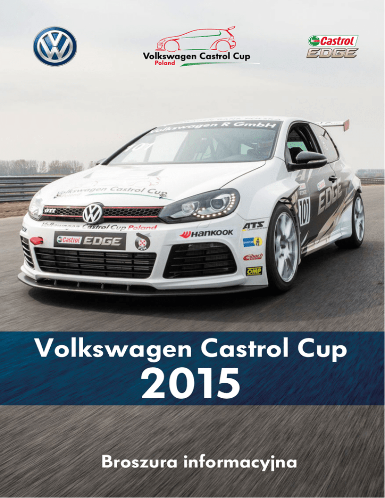 Volkswagen Castrol Cup 2015 Broszura informacyjna Nowa filozofia organizacji. Kierowca przybywa na tor jedynie z kaskiem. Wszystkie poniższe elementy zapewnia Organizator: udostępnienie samochodu wyścigowego i jego transport podczas całego sezonu (14 wyścigów, 14 wolnych treningów, 7 kwalifikacji), pełna obsługa serwisowa w trakcie treningów i wyścigów w całym sezonie, paliwo na treningi i wyścigi, wyczynowe opony, wszystkie opłaty na torze tzw. wpisowe zawodników, W sezonie 2015 Volkswagen Castrol Cup wkroczy w trzeci rok swojej działalności. Organizator Pucharu Volkswagen Racing Polska i Volkswagen Group Polska planuje jeszcze bardziej zwiększyć widowiskowość i atrakcyjność rozgrywek. Dzięki współpracy z Volkswagen Motorsport, ekipa Volkswagen Racing Polska przygotuje nowe wersje Golfów GTI, które będzie charakteryzował zmodyfikowany pakiet aerodynamiczny oraz silnik wzmocniony o dodatką moc. AUTODROM MOST OSCHERSLEBEN HUNGARORING LAUSITZRING SLOVAKIARING RED BULL RING TOR POZNAŃ homologowany kombinezon oraz pakiet odzieży z logo Pucharu, wyznaczona powierzchnia reklamowa na samochodzie oraz na kombinezonie zawodnika, 3 VIP-owskie bilety uprawniające do wstępu na tory wyścigowe i do tzw. „Miasteczka VW”, catering na każdy weekend wyścigowy (dni treningowe i wyścigowe), briefingi i seminaria szkoleniowe m.in. z technik jazdy, stosowania systemów telemetrii, bezpieczeństwa itd., pakiet marketingowo-medialny, i wiele więcej… Powyższy pakiet jest dostępny pod następującymi warunkami: 1) Przy wpłacie zadatku w wysokości 5 tys. € netto do 31 X 2014 r. obowiązuje promocyjna cena 39 tys. € netto za sezon 2) Przy wpłacie zadatku po 1 XI 2014 r. obowiązuje cena 44 tys. € netto Pasja, wyścigi, Volkswagen Volkswagen Castrol Cup 2015 – jeszcze lepszy wybór Kolejne dwa sezony pucharu – 2015 i 2016 Rundy Volkswagen Castrol Cup w towarzystwie najbardziej prestiżowych serii wyścigowych (WTCC, Blancpain GT Series, ADAC GT Masters) Transmisje na żywo z wyścigów dostępne w internecie dzięki technologii livestreamingu! 39 000 € (+ VAT) – bezkonkurencyjna cena za sezon Testy dla nowych kandydatów jesienią 2014 Jeszcze mocniejszy wyścigowy Golf GTI Cup z Systemem Push - to - Pass Program wymiany zawodników między seriami Volkswagena dla czołowych zawodników. Dwudniowe testy i briefingi przed sezonem BRIEFINGI I SZKOLENIA TRANSMISJE Z WYŚCIGÓW NA ŻYWO W INTERNECIE JEDNAKOWE SAMOCHODY WYCZYNOWY GOLF GTI Zbudowany przez Volkswagen Racing Polska przy współpracy z Volkswagen Motorsport Sportowa skrzynia biegów DSG z LSG Nagroda główna: Golf VII i 30 tys. € dla zwycięzcy Zmodyfikowane zawieszenie i hamulce, system telemetrii i wyczynowe opony 20 tys. € dla drugiego zawodnika sezonu 310 KM mocy (260 + 50 KM z Push - to - Pass) 10 tys. € dla trzeciego zawodnika sezonu 56 tys. € do podziału w siedmiu rundach ZACIĘTA RYWALIZACJA NA ZNANYCH TORACH ATRAKCYJNE NAGRODY Odwiedź nas i wypełnij formularz zgłoszeniowy: Volkswagen Castrol Cup: www.vwcastrolcup.pl Volkswagen Racing Polska: www.vwracing.pl Find us on Facebook: facebook.com/volkswagencastrolcup Kontakt: [email protected] [email protected] tel./fax +48 14 674 12 04