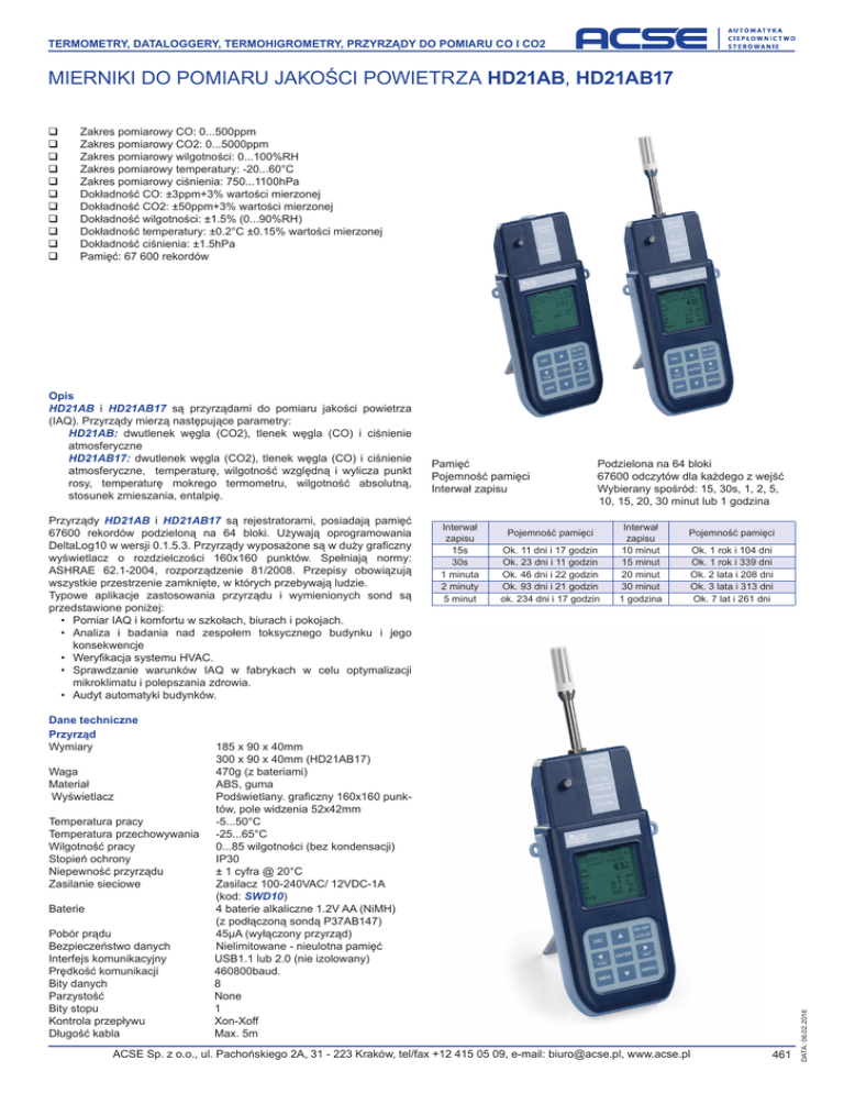 TERMOMETRY, DATALOGGERY, TERMOHIGROMETRY, PRZYRZĄDY DO POMIARU CO I CO2 MIERNIKI DO POMIARU JAKOŚCI POWIETRZA HD21AB, HD21AB17 Zakres pomiarowy CO: 0...500ppm Zakres pomiarowy CO2: 0...5000ppm Zakres pomiarowy wilgotności: 0...100%RH Zakres pomiarowy temperatury: -20...60°C Zakres pomiarowy ciśnienia: 750...1100hPa Dokładność CO: ±3ppm+3% wartości mierzonej Dokładność CO2: ±50ppm+3% wartości mierzonej Dokładność wilgotności: ±1.5% (0...90%RH) Dokładność temperatury: ±0.2°C ±0.15% wartości mierzonej Dokładność ciśnienia: ±1.5hPa Pamięć: 67 600 rekordów Opis HD21AB i HD21AB17 są przyrządami do pomiaru jakości powietrza (IAQ). Przyrządy mierzą następujące parametry: HD21AB: dwutlenek węgla (CO2), tlenek węgla (CO) i ciśnienie atmosferyczne HD21AB17: dwutlenek węgla (CO2), tlenek węgla (CO) i ciśnienie atmosferyczne, temperaturę, wilgotność względną i wylicza punkt rosy, temperaturę mokrego termometru, wilgotność absolutną, stosunek zmieszania, entalpię. Przyrządy HD21AB i HD21AB17 są rejestratorami, posiadają pamięć 67600 rekordów podzieloną na 64 bloki. Używają oprogramowania DeltaLog10 w wersji 0.1.5.3. Przyrządy wyposażone są w duży graficzny wyświetlacz o rozdzielczości 160x160 punktów. Spełniają normy: ASHRAE 62.1-2004, rozporządzenie 81/2008. Przepisy obowiązują wszystkie przestrzenie zamknięte, w których przebywają ludzie. Typowe aplikacje zastosowania przyrządu i wymienionych sond są przedstawione poniżej: • Pomiar IAQ i komfortu w szkołach, biurach i pokojach. • Analiza i badania nad zespołem toksycznego budynku i jego konsekwencje • Weryfikacja systemu HVAC. • Sprawdzanie warunków IAQ w fabrykach w celu optymalizacji mikroklimatu i polepszania zdrowia. • Audyt automatyki budynków. Dane techniczne Przyrząd Wymiary Waga Materiał Wyświetlacz Temperatura pracy Temperatura przechowywania Wilgotność pracy Stopień ochrony Niepewność przyrządu Zasilanie sieciowe Baterie Pobór prądu Bezpieczeństwo danych Interfejs komunikacyjny Prędkość komunikacji Bity danych Parzystość Bity stopu Kontrola przepływu Długość kabla Pamięć Pojemność pamięci Interwał zapisu Interwał zapisu 15s 30s 1 minuta 2 minuty 5 minut Podzielona na 64 bloki 67600 odczytów dla każdego z wejść Wybierany spośród: 15, 30s, 1, 2, 5, 10, 15, 20, 30 minut lub 1 godzina Pojemność pamięci Ok. 11 dni i 17 godzin Ok. 23 dni i 11 godzin Ok. 46 dni i 22 godzin Ok. 93 dni i 21 godzin ok. 234 dni i 17 godzin Interwał zapisu 10 minut 15 minut 20 minut 30 minut 1 godzina Pojemność pamięci Ok. 1 rok i 104 dni Ok. 1 rok i 339 dni Ok. 2 lata i 208 dni Ok. 3 lata i 313 dni Ok. 7 lat i 261 dni 185 x 90 x 40mm 300 x 90 x 40mm (HD21AB17) 470g (z bateriami) ABS, guma Podświetlany. graficzny 160x160 punktów, pole widzenia 52x42mm -5...50°C -25...65°C 0...85 wilgotności (bez kondensacji) IP30 ± 1 cyfra @ 20°C Zasilacz 100-240VAC/ 12VDC-1A (kod: SWD10) 4 baterie alkaliczne 1.2V AA (NiMH) (z podłączoną sondą P37AB147) 45μA (wyłączony przyrząd) Nielimitowane - nieulotna pamięć USB1.1 lub 2.0 (nie izolowany) 460800baud. 8 None 1 Xon-Xoff Max. 5m ACSE Sp. z o.o., ul. Pachońskiego 2A, 31 - 223 Kraków, tel/fax +12 415 05 09, e-mail: [email protected], www.acse.pl 461 DATA: 06.02.2016 TERMOMETRY, DATALOGGERY, TERMOHIGROMETRY, PRZYRZĄDY DO POMIARU CO I CO2 Dwutlenek węgla CO2 Czujnik Zakres pomiarowy Zakres pracy czujnika Dokładność Rozdzielczość Efekt temperaturowy Czas odpowiedzi (T90) Stabilność długoterminowa NDIR z podwójną długością fali 0…5000 ppm -5…50°C ±50ppm+3% wartości mierzonej 1ppm 0,1%f.s./°C < 120s (dla prędkości powietrza = 2m/s) 5% wartości mierzonej/ 5 lat Tlenk węgla CO Czujnik Zakres pomiarowy Zakres pracy czujnika Dokładność Rozdzielczość Czas odpowiedzi (T90) Stabilność długoterminowa Żywotność Cela elektrochemiczna 0…500ppm -5…50°C ±3ppm+3% wartości mierzonej 1ppm < 50s 5% wartości mierzonej/rok > 5 lat w normalnych warunkach Ciśnienie atmosferyczne Patm Typ czujnika Zakres pomiarowy Dokładność Rozdzielczość Stabilność długoterminowa Dryft temperaturowy Piezorezystncyjny 750...1100hPa ±1.5 hPa @25°C 1 hPa 2hPa/rok ±3 hPa w temperaturze -20...60°C Wilgotność względna RH (tylko HD21AB17) Czujnik Czujnik pojemnościowy Ochrona czujnika Filtr siatkowy ze stali nierdzewnej (opcjonalnie spiekany P6 ze AISI316: 10μm lub teflonowy PTFE P7: 20μm) Zakres pomiarowy 0...100%RH Zakres pracy czujnika -20...+60°C Dokładność ±1,5%RH (0...90%RH) ±2,0%RH (w pozostałym), T=10...35°C ±(1,5+1,5% wartości mierzonej)%RH w pozostałym zakresie temperatury Efekt temperaturowy ±2% w całym zakresie temperatury Histereza i powtarzalność 1% RH Czas odpowiedzi (T90) < 20s (dla prędkości powietrza = 2m/s) Stabilność długoterminowa 1%/rok Sposób zamawiania HD21AB: HD21AB17: Komplet zawiera: przyrząd HD21AB do pomiaru CO2, CO i ciśnienia atmosferycznego, oprogramowanie DeltaLog10, 4 baterie alkaliczne 1.5V 2200mAh, instrukcję obsługi, walizkę. Kable komunikacyjne należy zamawiać oddzielnie. Komplet zawiera: przyrząd HD21AB17 do pomiaru CO2, CO i ciśnienia atmosferycznego, temperatury i wilgotności względnej, oprogramowanie DeltaLog10, 4 baterie alkaliczne 1.5V 2200mAh, instrukcję obsługi, walizkę. Kable komunikacyjne należy zamawiać oddzielnie. Akcesoria: SWD10: CP23: P6: Zasilacz 100-240VAC/12VDC-1A Kabel komunikacyjny USB 2.0 (mini-USB typu B – USB typu A) Filtr siatkowy 10μm ze stali nierdzewnej dla sond o średnicy 14mm i gwintem M12×1. P7: Filtr teflonowy PTFE 20μ, dla sond o średnicy 14mm i gwintem M12×1. P8: Filtr siatkowy ze stali nierdzewnej i Pocan dla sond o średnicy 14mm i gwintem M12×1. HD75: Roztwór nasyconej soli do kalibracji i sprawdzania wilgotności względnej 75% RH, z adapterem dla sond o średnicy 14mm i gwintem M12×1. HD33: Roztwór nasyconej soli do kalibracji i sprawdzania wi