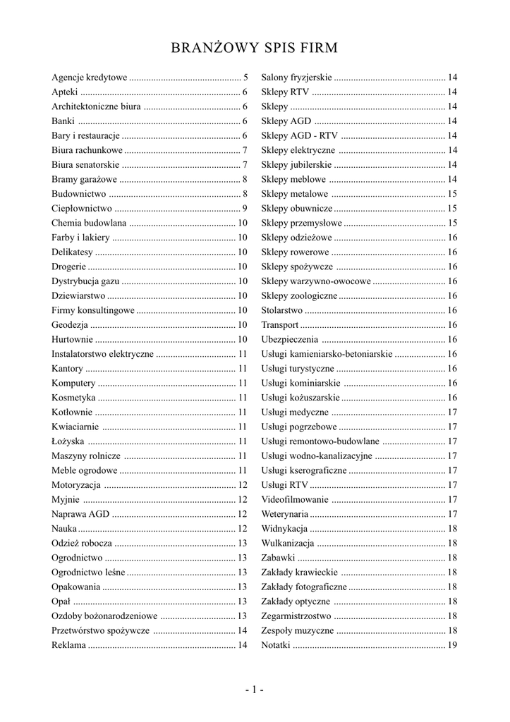 BRAN¯OWY SPIS FIRM Agencje kredytowe .............................................. 5 Apteki .................................................................. 6 Architektoniczne biura ........................................ 6 Banki ................................................................... 6 Bary i restauracje ................................................. 6 Biura rachunkowe ................................................ 7 Biura senatorskie ................................................. 7 Bramy gara¿owe .................................................. 8 Budownictwo ...................................................... 8 Ciep³ownictwo .................................................... 9 Chemia budowlana ............................................ 10 Farby i lakiery ................................................... 10 Delikatesy .......................................................... 10 Drogerie ............................................................. 10 Dystrybucja gazu ............................................... 10 Dziewiarstwo ..................................................... 10 Firmy konsultingowe ......................................... 10 Geodezja ............................................................ 10 Hurtownie .......................................................... 10 Instalatorstwo elektryczne ................................. 11 Kantory .............................................................. 11 Komputery ......................................................... 11 Kosmetyka ......................................................... 11 Kot³ownie .......................................................... 11 Kwiaciarnie ....................................................... 11 £o¿yska ............................................................. 11 Maszyny rolnicze .............................................. 11 Meble ogrodowe ................................................ 11 Motoryzacja ...................................................... 12 Myjnie ............................................................... 12 Naprawa AGD ................................................... 12 Nauka ................................................................. 12 Odzie¿ robocza .................................................. 13 Ogrodnictwo ...................................................... 13 Ogrodnictwo lene ............................................. 13 Opakowania ....................................................... 13 Opa³ ................................................................... 13 Ozdoby bo¿onarodzeniowe ............................... 13 Przetwórstwo spo¿ywcze .................................. 14 Reklama ............................................................. 14 Salony fryzjerskie .............................................. 14 Sklepy RTV ....................................................... 14 Sklepy ................................................................ 14 Sklepy AGD ...................................................... 14 Sklepy AGD - RTV ........................................... 14 Sklepy elektryczne ............................................ 14 Sklepy jubilerskie .............................................. 14 Sklepy meblowe ................................................ 14 Sklepy metalowe ............................................... 15 Sklepy obuwnicze .............................................. 15 Sklepy przemys³owe .......................................... 15 Sklepy odzie¿owe .............................................. 16 Sklepy rowerowe ............................................... 16 Sklepy spo¿ywcze ............................................. 16 Sklepy warzywno-owocowe .............................. 16 Sklepy zoologiczne ............................................ 16 Stolarstwo .......................................................... 16 Transport ............................................................ 16 Ubezpieczenia ................................................... 16 Us³ugi kamieniarsko-betoniarskie ..................... 16 Us³ugi turystyczne ............................................. 16 Us³ugi kominiarskie .......................................... 16 Us³ugi ko¿uszarskie ........................................... 16 Us³ugi medyczne ............................................... 17 Us³ugi pogrzebowe ............................................ 17 Us³ugi remontowo-budowlane .......................... 17 Us³ugi wodno-kanalizacyjne ............................. 17 Us³ugi kserograficzne ........................................ 17 Us³ugi RTV ........................................................ 17 Videofilmowanie ............................................... 17 Weterynaria ........................................................ 17 Widnykacja ........................................................ 18 Wulkanizacja ..................................................... 18 Zabawki ............................................................. 18 Zak³ady krawieckie ........................................... 18 Zak³ady fotograficzne ........................................ 18 Zak³ady optyczne .............................................. 18 Zegarmistrzostwo .............................................. 18 Zespo³y muzyczne ............................................. 18 Notatki ............................................................... 19 -1- TELEFONY ALARMOWE POGOTOWIE ..................................................................................................................... 999 STRA¯ PO¯ARNA ............................................................................................................. 998 POLICJA ............................................................................................................................. 997 POGOTOWIE ENERGETYCZNE CA£ODOBOWE ........