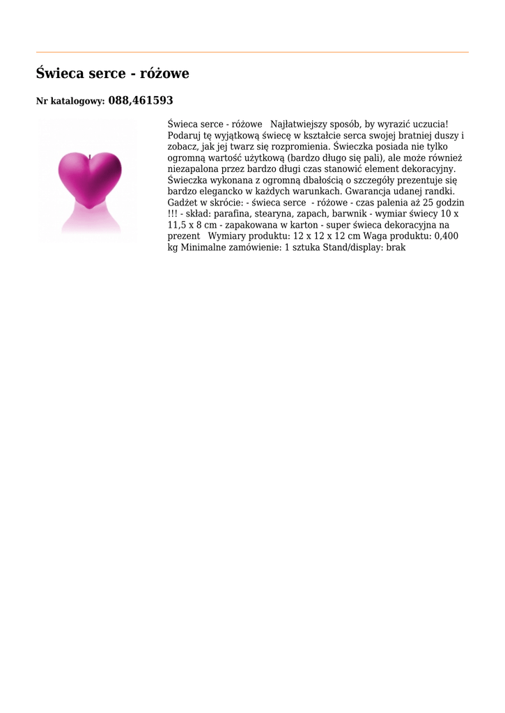 Świeca serce - różowe Nr katalogowy: 088,461593 Świeca serce - różowe Najłatwiejszy sposób, by wyrazić uczucia! Podaruj tę wyjątkową świecę w kształcie serca swojej bratniej duszy i zobacz, jak jej twarz się rozpromienia. Świeczka posiada nie tylko ogromną wartość użytkową (bardzo długo się pali), ale może również niezapalona przez bardzo długi czas stanowić element dekoracyjny. Świeczka wykonana z ogromną dbałością o szczegóły prezentuje się bardzo elegancko w każdych warunkach. Gwarancja udanej randki. Gadżet w skrócie: - świeca serce - różowe - czas palenia aż 25 godzin !!! - skład: parafina, stearyna, zapach, barwnik - wymiar świecy 10 x 11,5 x 8 cm - zapakowana w karton - super świeca dekoracyjna na prezent Wymiary produktu: 12 x 12 x 12 cm Waga produktu: 0,400 kg Minimalne zamówienie: 1 sztuka Stand/display: brak