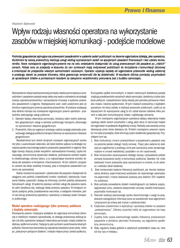 Prawo i finanse Wojciech Bąkowski Wpływ rodzaju własności operatora na wykorzystanie zasobów w miejskiej komunikacji - podejście modelowe Podmio podar cz jące się pr er ganizat or at or zy odmiotty gos gospodar podarcz czee zajmu zajmujące przzewozami pasaż pasażer ersskimi w sy w sysstemie zadań publiczn publicznyych na zlecenie or organizat ganizator oraa działają, jak jakoo oper operat ator orzy zy.. ealizu ją usługi w edług wyznacz on W yr óżnieni ttąą nazwą pr pec jaln inanso wy ch i bez udziału kkonk onk uyróżnieni przzewoźnicy rrealizu ealizują według wyznaczon onyych zadań na sspec pecjaln jalnyych zasadach ffinanso inansowy wych onkurent ozwiązanie or ganizacy jno-pr enie dos ci do usług pr ch dla pasaż er kich” entóów. N Noowe rrozwiązanie organizacy ganizacyjno-pr jno-praawne ma na celu zwiększ zwiększenie dosttępnoś ępności przzewoz ozoowy wych pasażer eraa po „nis „niskich” ynk ch mają mo óżn or zy cenach. Niższ omunik ac przzejazdy w s w sttosunk osunkuu do cen rrynk ynkoowy wych mott yw ywoować podr podróżn óżnyych do kkor orzy zysstania z k Niższee cen cenyy za pr z komunik omunikac acjiji zbior zbioroowej w własn ym samochodem osobo wym. Oper at or uzy a zniechęcać do pr ganizat or ww edług us przzejazdó jazdów własnym osobowym. Operat ator uzysskuje zapłat zapłatęę od or organizat ganizator oraa pr przzewozó ozów według usttalone alonejj w pr gu ssttawki za pr yt tr ór ar antu je rrent ent ci. W r ezult acie rróżnica óżnica pomiędzy pr zy chodami w przzetar argu przzeb ebyt ytee kilome kilometr tryy, kt któr óraa gw gwar arantu antuje entoowność dla tteej działalnoś działalności. W rezult ezultacie przy zychodami upione w oz okilome tr yw ana jes ządu. ze sspr pr ymi kkoszt oszt ami za zak zakupione woz ozokilome okilometr tryy pokr pokryw ywana jestt z budż z budżeetu samor samorządu. przzedan edanyych bile bilettów a poniesion a poniesionymi osztami Wprowadzenie relacji kosztowocenowej pomiędzy władzą samorządową a przewoźnikiem i pasażerem posiada swoje zalety oraz wady w odniesieniu do strategii rozwoju operatora-przewoźnika i wprowadzania innowacji w systemie przewozów pasażerskich w regionie. Występowanie wad i zalet uzależnione jest od struktury organizacyjno prawnej operatora-przewoźnika. W praktyce występują dwa istotnie różniące się rozwiązania organizacyjno prawne operatora– przewoźnika realizującego usługi publiczne: 1. Operator będący własnością samorządu, świadczy całym swoim potencjałem gospodarczym usługi w zakresie publicznego transportu zbiorowego na wyznaczonym obszarze geograficznym. 2. Przewoźnik, który po wygranym przetargu częścią swojego potencjału przewozowego obsługuje publiczny transport zbiorowy na wyznaczonym obszarze geograficznym. Wyodrębnienie tych dwóch skrajnych rozwiązań organizacyjnych wynika nie tylko z uwarunkowań własności, ale także istotnie wpływa na strategie rozwojową szeroko rozumianego systemu przewozów pasażerskich w regionie. Strategie rozwoju dotyczą przede wszystkim: wprowadzania innowacji, ryzyka biznesowego, ekonomicznej sprawności działania, podnoszenia wartości kapitału intelektualnego, odnowy taboru, a co najważniejsze tworzenia wartości dodanej dla pasażera w transporcie zrównoważonym. W tym ostatnim przypadku zawiera się istota wszelkiej innowacji, jaką w transporcie pasażerskim powinno się wprowadzać. Należy nieustannie poprawiać i udoskonalać dla pasażera: dostępność do osiągania celu podróży (częstotliwość kursów i szybkość), dystrybucję i kasowanie biletów, zawartość i dostęp do informacji, komfort podróży (stosowanie hybrydowych usług). W systemie poprawy wartości usługi dla pasażera operator pełni określoną rolę, realizując istotę przewozu pasażera. W niniejszym artykule podejmę próbę przedstawienia warunków, a następnie interesów, jakimi się kierują przewoźnicy-operatorzy i operatorzy w realizacji zadań transportu publicznego. Model operatora realizującego tylko przewozy publiczne z dopłatą samorządu Rozwiązania prawne i tradycyjne podejście do organizacji komunikacji zbiorowej w niektórych miastach spowodowały, że obsługę przewozową realizuje jeden lub kilku operatorów będących własnością samorządu miasta (zakład budżetowy, spółki komunalne). Tradycja ta, jest wynikiem wyrachowania lokalnych polityków. Kierownicze stanowiska są najczęściej obsadzane przez osoby , które po „zasłużonym partyjnym działaniu” znalazły miejsce pracy i prestiż społeczny. W przypadku spółek komunalnych, w radach nadzorczych dodatkową posadę znajdują przedstawiciele naczelnych władz samorządu, dyrektorzy a także działacze polityczni. Uzasadnieniem takiej obsady jest potrzeba pilnowania interesów miasta i lokalnej społeczności. W tych miastach przewoźnicy z kapitałem prywatnym nie biorą udziału w realizacji przewozów publicznych, a jeśli już są dopuszczeni do wykonywania usług to ich udział stanowi zaledwie kilka procent w całej sieci komunikacyjnej miasta i najbliższego otoczenia. W tym rozwiązaniu organizacyjnym operatorzy będący własnością miasta uzyskują całość swoich przychodów z usług, jakie zleca im samorząd miejski lub organizator na podstawie długoletniej umowy. Niekiedy czas zawartej umowy obowiązuje przez okres dziesięciu lat. W takim rozwiązaniu prawnym operator ma wiele przywilejów, które eliminują ryzyko działalności gospodarczej. Przywilejami tymi są: 1. Brak konkurencji z innymi przewoźnikami w pozyskiwaniu pasażera oraz na poziomie jakości obsługi i taryfy cenowej . Popyt, jako zadanie do realizacji po uzgodnionej w przetargu cenie jest wyznaczony przez zarząd-organizatora w umowie wieloletniej z podziałem na rok i sezonowość. 2. Brak konieczności opracowywania strategii rozwoju i prowadzenia polityki cenowej (budowania ta