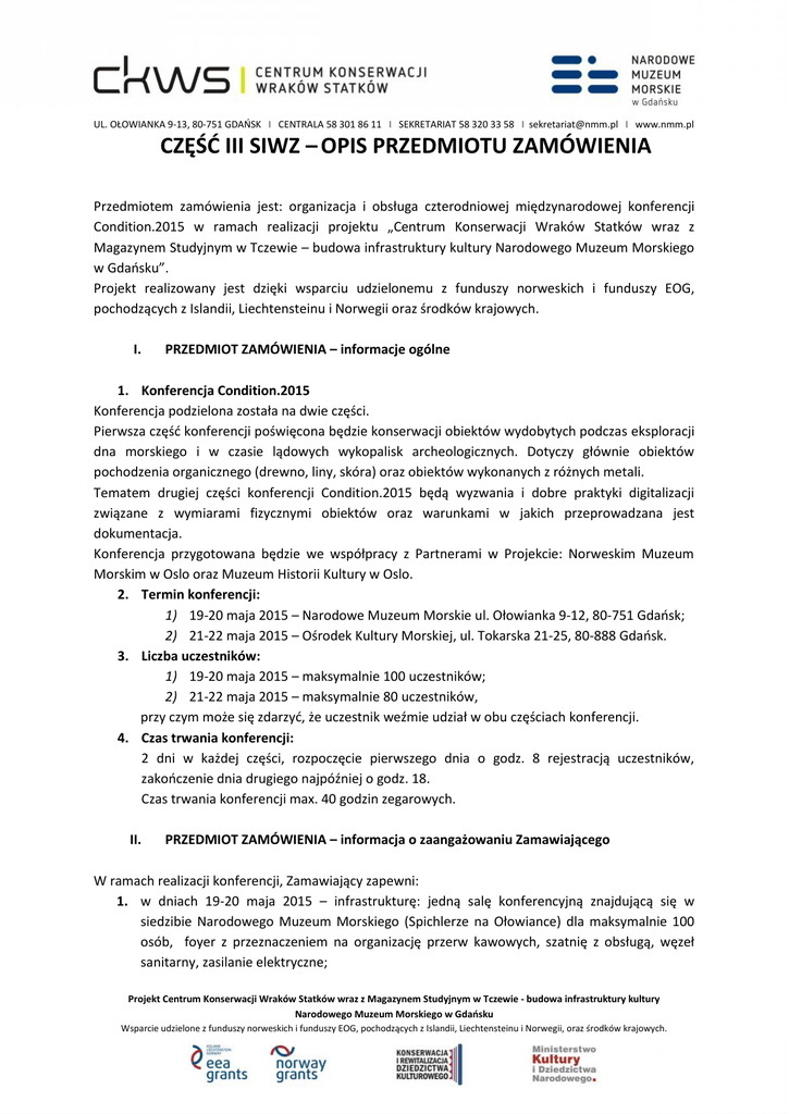 UL. OŁOWIANKA 9-13, 80-751 GDAŃSK I CENTRALA 58 301 86 11 I SEKRETARIAT 58 320 33 58 I [email protected] I www.nmm.pl CZĘŚĆ III SIWZ – OPIS PRZEDMIOTU ZAMÓWIENIA Przedmiotem zamówienia jest: organizacja i obsługa czterodniowej międzynarodowej konferencji Condition.2015 w ramach realizacji projektu „Centrum Konserwacji Wraków Statków wraz z Magazynem Studyjnym w Tczewie – budowa infrastruktury kultury Narodowego Muzeum Morskiego w Gdańsku”. Projekt realizowany jest dzięki wsparciu udzielonemu z funduszy norweskich i funduszy EOG, pochodzących z Islandii, Liechtensteinu i Norwegii oraz środków krajowych. I. PRZEDMIOT ZAMÓWIENIA – informacje ogólne 1. Konferencja Condition.2015 Konferencja podzielona została na dwie części. Pierwsza część konferencji poświęcona będzie konserwacji obiektów wydobytych podczas eksploracji dna morskiego i w czasie lądowych wykopalisk archeologicznych. Dotyczy głównie obiektów pochodzenia organicznego (drewno, liny, skóra) oraz obiektów wykonanych z różnych metali. Tematem drugiej części konferencji Condition.2015 będą wyzwania i dobre praktyki digitalizacji związane z wymiarami fizycznymi obiektów oraz warunkami w jakich przeprowadzana jest dokumentacja. Konferencja przygotowana będzie we współpracy z Partnerami w Projekcie: Norweskim Muzeum Morskim w Oslo oraz Muzeum Historii Kultury w Oslo. 2. Termin konferencji: 1) 19-20 maja 2015 – Narodowe Muzeum Morskie ul. Ołowianka 9-12, 80-751 Gdańsk; 2) 21-22 maja 2015 – Ośrodek Kultury Morskiej, ul. Tokarska 21-25, 80-888 Gdańsk. 3. Liczba uczestników: 1) 19-20 maja 2015 – maksymalnie 100 uczestników; 2) 21-22 maja 2015 – maksymalnie 80 uczestników, przy czym może się zdarzyć, że uczestnik weźmie udział w obu częściach konferencji. 4. Czas trwania konferencji: 2 dni w każdej części, rozpoczęcie pierwszego dnia o godz. 8 rejestracją uczestników, zakończenie dnia drugiego najpóźniej o godz. 18. Czas trwania konferencji max. 40 godzin zegarowych. II. PRZEDMIOT ZAMÓWIENIA – informacja o zaangażowaniu Zamawiającego W ramach realizacji konferencji, Zamawiający zapewni: 1. w dniach 19-20 maja 2015 – infrastrukturę: jedną salę konferencyjną znajdującą się w siedzibie Narodowego Muzeum Morskiego (Spichlerze na Ołowiance) dla maksymalnie 100 osób, foyer z przeznaczeniem na organizację przerw kawowych, szatnię z obsługą, węzeł sanitarny, zasilanie elektryczne; Projekt Centrum Konserwacji Wraków Statków wraz z Magazynem Studyjnym w Tczewie - budowa infrastruktury kultury Narodowego Muzeum Morskiego w Gdańsku Wsparcie udzielone z funduszy norweskich i funduszy EOG, pochodzących z Islandii, Liechtensteinu i Norwegii, oraz środków krajowych. UL. OŁOWIANKA 9-13, 80-751 GDAŃSK I CENTRALA 58 301 86 11 I SEKRETARIAT 58 320 33 58 I [email protected] I www.nmm.pl 2. w dniach 21-22 maja 2015 – infrastrukturę: jedną salę konferencyjną znajdującą się w Ośrodku Kultury Morskiej dla maksymalnie 80 osób, szatnię z obsługą, węzeł sanitarny, zasilanie elektryczne; 3. ochronę; 4. moderatorów i prowadzących bloki; 5. materiały poligraficzne: broszura o projekcie, książeczka abstraktów, broszura o konferencji; 6. pytania do ankiety; 7. listę imienną prelegentów i przedstawicieli partnerów norweskich wraz z kontaktem; 8. wysłanie podziękowań z krótkim podsumowaniem konferencji do wszystkich uczestników. III. PRZEDMIOT ZAMÓWIENIA – informacje szczegółowe W ramach realizacji niniejszego zamówienia Wykonawca zobowiązany będzie do zapewnienia: 1. W zakresie zapewnienia transportu i noclegów dla uczestników konferencji: 1) zapewnienia przelotów dla uczestników konferencji: Liczba osób Do Gdańska z.... Piza Oslo Gardermoen Frankfurt Data przejazdu 18.05.2015 16.05.2015 Uwagi 18.05.2015 18.05.2015 19.05.2015 (rano) 1 1 Oslo Gardermoen Stockholm (Arlanda) Budapest Stavanger Wylot po 12:00 Lot o 11:15 1 Moskwa 18.05.2015 1 2 1 1 Trondheim Berlin Glasgow Groningen 18.05.2015 20.05.2015 19.05.2015 18.05.2015 2 2 1 3 1 18.05.2015 18.05.2015 Przez Kaliningrad 17:05-20:25 Projekt Centrum Konserwacji Wraków Statków wraz z Magazynem Studyjnym w Tczewie - budowa infrastruktury kultury Narodowego Muzeum Morskiego w Gdańsku Wsparcie udzielone z funduszy norweskich i funduszy EOG, pochodzących z Islandii, Liechtensteinu i Norwegii, oraz środków krajowych. UL. OŁOWIANKA 9-13, 80-751 GDAŃSK I CENTRALA 58 301 86 11 I SEKRETARIAT 58 320 33 58 I [email protected] I www.nmm.pl Liczba osób 1 1 1 Z Gdańska do... Pisa Data Uwagi 22.05.2015 Może być też 23.05.2015 Pisa Oslo Gardenmoen Frankfurt Oslo Gardenmoen Oslo Gardebmoen Stockholm Arlanda 25.05.2015 21.05.2015 1 1 Budapest Stavanger 22.05.2015 21.05.2015 1 Kolonia /Dusseldorf Moskwa Berlin Trondheim Glasgow Groningen 21.05.2015 1 2 1 1 1 2 1 1 1 23.05.2015 22.05.2015 21:10 23.05.2015 wieczór 21.05.2015 (w południe) 22.05.2015 23.05.2015 21.05.2015 23.05.2015 24.05.2015 Godziny 11:00 do 16:00 15:05-16:35 Przez zapewnienie przelotów należy rozumieć dokonanie ostatecznych uzgodnień ze wskazanymi przez Zamawiającego uczestnikami konferencji, dokonanie zakupu biletów lotniczych z bagażem głównym i podręcznym oraz ich dostarczenie odpowiednim osobom w terminie nie krótszym niż 21 dni przed datą wylotu. Połączenie lotnicze winno być bezpośrednie lub – jeśli brak takiej możliwości – łączone, z jak najmniejszą ilością przesiadek i najkrótszym łącznym czasie podróży. Wykonawca zobowiązany jest również zapewnić transport z lotniska do hotelu lub miejsca organizacji konferencji oraz z hotelu lub miejsca organizacji konferencji na lotnisko. Transport winien być dokonany z udziałem osoby znającej język angielski, która będzie w stanie udzielić uczestnikowi konferencji podstawowych informacji. Projekt Centrum Konserwacji Wraków Statków wraz z Magazynem Studyjnym w Tczewie - budowa infrastruktury kultury Narodowego Mu