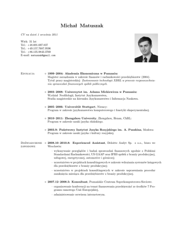 Michal Matuszak CV na dzień 1 września 2011 Wiek: 31 lat Tel.: +48.691.697.837 Tel.: +49.157.7687.9596 Tel.: +86.135.9843.3769 E-mail: [email protected] Edukacja 1999–2004: Akademia Ekonomiczna w Poznaniu: Magister zarzadzania w zakresie finansów i rachunkowości przedsiebiorstw (2004). , , Tytul pracy magisterskiej: Zastosowanie technologii XBRL w procesie rozpowszechniania sprawozdań finansowych spólek publicznych. 2003–2008: Uniwersytet im. Adama Mickiewicza w Poznaniu: Wydzial Neofilologii, Instytut Jezykoznawstwa, , Studia magisterskie na kierunku Jezykoznawstwo i Informacja Naukowa. , 2005–2006: Universität Stuttgart, Niemcy: Program w zakresie jezykoznawstwa komputerowego i fonetyki eksperymentalnej. , 2010–2011: Zhengzhou University, Zhengzhou, Henan, ChRL: Program w zakresie nauki jezyka chińskiego. , 2003.9: Państwowy Instytut Jezyka Rosyjskiego im. A. Puszkina, Moskwa: , Program w zakresie nauki jezyka i kultury rosyjskiej. , Doświadczenie 2008.10–2010.8: Experienced Assistant, Deloitte Audyt Sp. z o.o., biuro we zawodowe Wroclawiu: · wykonywanie przegladów i badań sprawozdań finansowych zgodnie z Polskimi , Standardami Rachunkowości, US GAAP oraz IFRS spólek z branży produkcyjnej, uslugowej, energetycznej, automotive i górniczej; · uczestnictwo w projektach konsultingowych w zakresie wdrażania systemów ksiegowych , dla przedsiebiorstw z branży produkcyjnej; , · uczestnictwo w projektach konsultingowych w zakresie usprawniania procedur zamkniecia miesiaca dla przedsiebiorstw z branży produkcyjnej. , , , 2007.12–2008.5: Konsultant, Poznańskie Centrum Superkomputerowo-Sieciowe. · organizowanie konferencji na temat finansowania przedsiewzi eć , , ze środków 7 Programu ramowego Unii Europejskiej, · administrowanie serwisem internetowym. Michal Matuszak 2002–2008: Niezależny programista aplikacji internetowych: · tworzenie aplikacji internetowych w zakresie e-commerce, obslugi transakcji, publikacji materialów audiowizualnych dla krajowych i zagranicznych przedsiebiorstw, , zwiazków sportowych, instytucji publicznych i NGO. , 2001–2003: Liczne staże i praktyki studenckie: · w tym: Deloitte, mBank, Urzad , Skarbowy Poznań-Śródmieście, CapGemini Ernst&Young. Inne umiejetno ści , Znajomość jezyków programowania: , · Python, PHP, Ruby, Perl, Prolog, Javascript, VBA; Znajomość technologii bazodanowych, jezyków zapytań oraz formatów wymi, any danych: · MySQL, PostgreSQL, SQLite, SQL, XPath, XML, YAML, REGEXP, Narzedzia , GNU; Znajomość metod prezentacji danych i obróbki mediów: · HTML, CSS, XSLT, LATEX, Avisynth, ImageMagick, Snack; Znajomość systemów ksiegowych, statystycznych oraz pakietów biurowych: , · SAP, Oracle Financials, R-project, Microsoft Office, Open Office. Znajomość jezyków obcych: , · angielski: biegle w mowie i piśmie, · niemiecki: zaawansowany, · rosyjski: konwersacyjny, · wloski: konwersacyjny, · chiński: średnio-zaawansowany. Pozostale informacje Organizowane konferencje: · RuPy: Miedzynarodowa konferencja poświecona jezykom programowania Ruby i , , , Python (2008). · Startup-IT: cykl warsztatów na temat wspierania mlodego biznesu internetowego (2007–2008). · XBRL – Miedzynarodowa Sprawozdawczość Finansowa, razem ze Stowarzysze, niem Ksiegowych w Polsce (2005). , Czlonkostwo w organizacjach: · czlonek Stowarzyszenia Ksiegowych w Polsce (od 2004). , Prawo jazdy kat. B Referencje Dostepne na życzenie. ,
