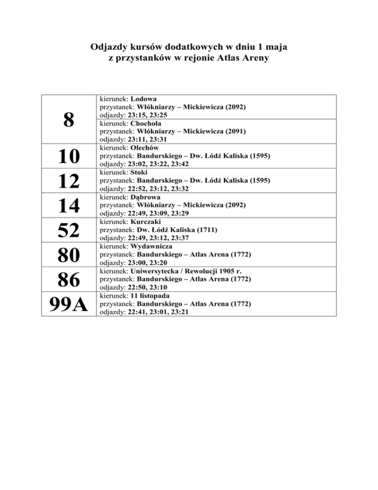 Odjazdy kursów dodatkowych w dniu 1 maja z przystanków w rejonie Atlas Areny 8 10 12 14 52 80 86 99A kierunek: Lodowa przystanek: Włókniarzy – Mickiewicza (2092) odjazdy: 23:15, 23:25 kierunek: Chochoła przystanek: Włókniarzy – Mickiewicza (2091) odjazdy: 23:11, 23:31 kierunek: Olechów przystanek: Bandurskiego – Dw. Łódź Kaliska (1595) odjazdy: 23:02, 23:22, 23:42 kierunek: Stoki przystanek: Bandurskiego – Dw. Łódź Kaliska (1595) odjazdy: 22:52, 23:12, 23:32 kierunek: Dąbrowa przystanek: Włókniarzy – Mickiewicza (2092) odjazdy: 22:49, 23:09, 23:29 kierunek: Kurczaki przystanek: Dw. Łódź Kaliska (1711) odjazdy: 22:49, 23:12, 23:37 kierunek: Wydawnicza przystanek: Bandurskiego – Atlas Arena (1772) odjazdy: 23:00, 23:20 kierunek: Uniwersytecka / Rewolucji 1905 r. przystanek: Bandurskiego – Atlas Arena (1772) odjazdy: 22:50, 23:10 kierunek: 11 listopada przystanek: Bandurskiego – Atlas Arena (1772) odjazdy: 22:41, 23:01, 23:21