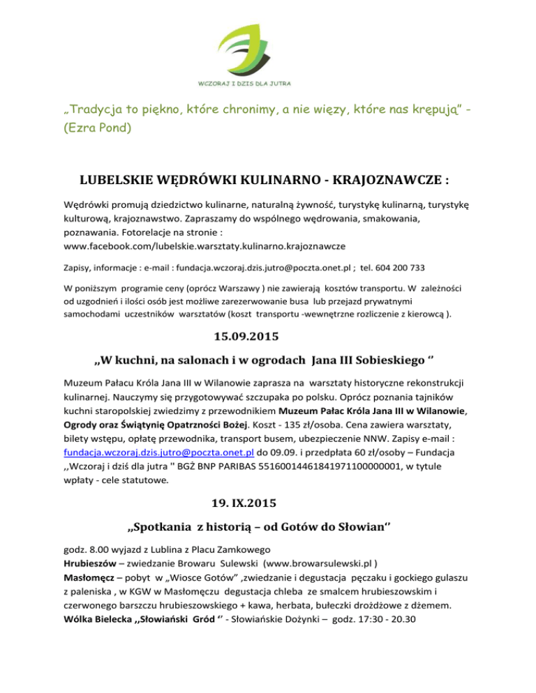 „Tradycja to piękno, które chronimy, a nie więzy, które nas krępują” (Ezra Pond) LUBELSKIE WĘDRÓWKI KULINARNO - KRAJOZNAWCZE : Wędrówki promują dziedzictwo kulinarne, naturalną żywność, turystykę kulinarną, turystykę kulturową, krajoznawstwo. Zapraszamy do wspólnego wędrowania, smakowania, poznawania. Fotorelacje na stronie : www.facebook.com/lubelskie.warsztaty.kulinarno.krajoznawcze Zapisy, informacje : e-mail : [email protected] ; tel. 604 200 733 W poniższym programie ceny (oprócz Warszawy ) nie zawierają kosztów transportu. W zależności od uzgodnień i ilości osób jest możliwe zarezerwowanie busa lub przejazd prywatnymi samochodami uczestników warsztatów (koszt transportu -wewnętrzne rozliczenie z kierowcą ). 15.09.2015 ,,W kuchni, na salonach i w ogrodach Jana III Sobieskiego ‘’ Muzeum Pałacu Króla Jana III w Wilanowie zaprasza na warsztaty historyczne rekonstrukcji kulinarnej. Nauczymy się przygotowywać szczupaka po polsku. Oprócz poznania tajników kuchni staropolskiej zwiedzimy z przewodnikiem Muzeum Pałac Króla Jana III w Wilanowie, Ogrody oraz Świątynię Opatrzności Bożej. Koszt - 135 zł/osoba. Cena zawiera warsztaty, bilety wstępu, opłatę przewodnika, transport busem, ubezpieczenie NNW. Zapisy e-mail : [email protected] do 09.09. i przedpłata 60 zł/osoby – Fundacja ,,Wczoraj i dziś dla jutra '' BGŻ BNP PARIBAS 55160014461841971100000001, w tytule wpłaty - cele statutowe. 19. IX.2015 ,,Spotkania z historią – od Gotów do Słowian‘’ godz. 8.00 wyjazd z Lublina z Placu Zamkowego Hrubieszów – zwiedzanie Browaru Sulewski (www.browarsulewski.pl ) Masłomęcz – pobyt w „Wiosce Gotów” ,zwiedzanie i degustacja pęczaku i gockiego gulaszu z paleniska , w KGW w Masłomęczu degustacja chleba ze smalcem hrubieszowskim i czerwonego barszczu hrubieszowskiego + kawa, herbata, bułeczki drożdżowe z dżemem. Wólka Bielecka ,,Słowiański Gród ‘’ - Słowiańskie Dożynki – godz. 17:30 - 20.30 zapoznanie z życiem obozowym, stanowiska rzemieślnicze, uczta słowiańska (soczewica ze skwarkami, kaszanka i boczek z pieca ), widowisko plenerowe „Słowiańskie Dożynki” i spektakl ogniowy , www.horodyszcze.lbn.pl godz.21.30 – 21.45 powrót do Lublina Cena 70 zł/osoba (bez kosztu transportu), z transportem 100 -110 zł .Cena zawiera bilety wstępu, opłatę przewodnika w Gotanii, udział w Słowiańskich Dożynkach, degustacje (oprócz degustacji piwa w Browarze ), ubezpieczenie NNW 03.10.2015 Na lniano-rzepakowym i różanym szlaku ziemi puławskiej Muzeum Czartoryskich w Puławach – zwiedzanie z przewodnikiem Końskowola ,, Manufaktura różana ‘’- sekrety różanych specjałów, m.in. pokaz wydrążania nasion z owoców róży, degustacja różanych przetworów, możliwość zakupu produktów różanych - Zabłocie ,,Skarby Natury ‘’- pokaz tłoczenia oleju rydzowego na zimno, degustacja olejów ekologicznych: rzepakowego (oliwa północy), konopnego, lnianego, słonecznikowego, rydzowego z prawdziwym żytnim chlebem pieczonym w piecu chlebowym. Przypomnienie - zapoznanie z roślinami : lędźwianem, ostropestem, lnianką, pszenicą płaskurką ( to "starsza siostra orkiszu", to jedno z pierwszych udomowionych zbóż na Bliskim Wschodzie, badania archeologów wykazują, że początki polskiego rolnictwa wiążą się właśnie z uprawą płaskurki) i samopszą ( najstarszy gatunek pszenicy - jej wiek szacowany jest na ok. 9000 lat. Jest to odmiana dzika, uważana za roślinę leczniczą).Możliwość zakupu chleba ,olejów ekologicznych tłoczonych na zimno. Degustacja ,,Lędźwianu po zabłocku ‘’. Cena 60 zł/osoba ( bez kosztu transportu) 24.10.2015 …. Jabłka, maliny , śliwki – tradycyjne, naturalne …. Mikołajówka – wizyta w ,,FRUX SOLIS SOKI, OWOCE I WARZYWA ‘’poznajemy historię Mikołajówki i tradycję upraw sadowniczych, zapoznamy się ze sztuką robienia nalewek i zdegustujemy różne nalewki, trzecim omawianym tematem będzie – cydr –jabłeczniak ,degustacja cydru i pokaz cydrowni (FRUX SOLIS to siedziba Lubelskiego Stowarzyszenia Miłośników Cydru). ,,Pałaszowac ‘’będziemy domowe pierogi z kaszą, twarogiem i miętą- typowe pierogi dla tego terenu. Osoby chętne mogą zrobić zakupy przetworów owocowych, zamkniętych w słoiczkach i butelkach - pełnych słońca, aromatu i smaku. Cena 55zł /osoba ( bez kosztów transportu). 14.11.2015 ,,Z wizytą u Matki Boskiej Kodeńskiej oraz smaczki nadbużańskiego Kodnia ,, Sapiehów’’ Kodeń –zwiedzanie Sanktuarium Matki Bożej Kodeńskiej Kodeń – poznanie kulinarnych przysmaków ziemi Sapiehów - warsztaty u Państwa Pietrusików (zdobywców nagród w konkursie „Nasze Kulinarne Dziedzictwo – Smaki Regionów ‘’) -warsztaty i degustacja tortu z wątróbki, placków na sodzie – ,, sodziaków ‘’, oraz degustacja herbatki Księcia Sapiehy, Sekretu Sapiehów i kisielu z owsa. Cena 50 zł/osoba (bez kosztów transportu) 21.11.2015 Smaki naszych sąsiadów ……. Lublin - malownicza wielokulturowośc Lubelszczyzny pozostawiła ciekawą spuściznę kulinarną kuchnię żydowską, tatarską, ormiańską, ukraińską czy też dania nawiązujące do różnych korzeni ,, dania przenikania kultur’’. Na warsztatach poznamy tajniki kuchni ukraińskiej. Swoje tajemnice odsłoni m.in. solianka . Cena 50 zł/osoba 05.12.2015 Czar poleskich smaków Andrzejów - spotkanie w ,,Gospodarstwie agroturystycznym ‘’ Joli Kaniewskiej, specjalizującej się w daniach regionalnych . Warsztaty - wspólne przygotowywanie gryczanki , suma w kapuście , korowaja .Uzupełnieniem warsztatów będzie dyskusja o typowych daniach Polesia i o historii Polesia Wspólna ,, biesiada’’ po wspólnym gotowaniu przy kieliszku nalewki bobkowej zakończy spotkanie . Cena 50 zł/osoba (bez kosztów transportu). 12.12.2015 Piernikowy czas i czar … Hołowno - Kraina Rumianku – wspaniały przepis na ciasto i niezliczo