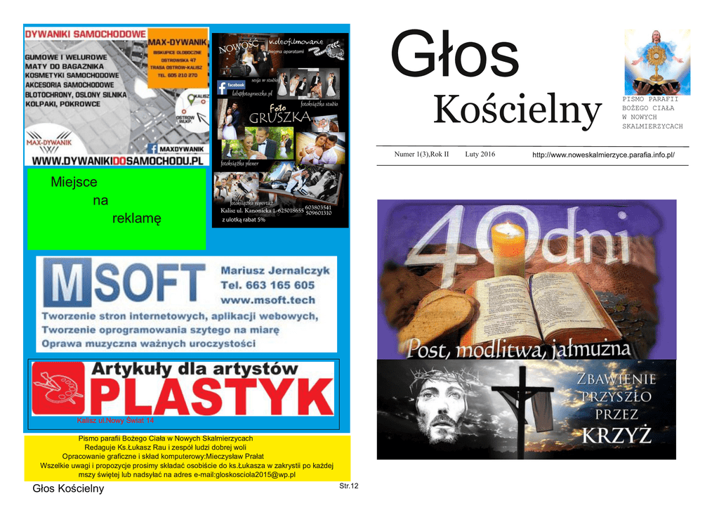 Głos Kościelny Numer 1(3),Rok II Miejsce na reklamę Kalisz ul.Nowy Świat 1 4 Pismo parafii Bożego Ciała w Nowych Skalmierzycach Redaguje Ks.Łukasz Rau i zespół ludzi dobrej woli Opracowanie graficzne i skład komputerowy:Mieczysław Prałat Wszelkie uwagi i propozycje prosimy składać osobiście do ks.Łukasza w zakrystii po każdej mszy świętej lub nadsyłać na adres e-mail:gloskosciola201 [email protected] Głos Kościelny Str.1 2 Luty 2016 PISMO PARAFII BOŻEGO CIAŁA W NOWYCH SKALMIERZYCACH http://www.noweskalmierzyce.parafia.info.pl/ Drodzy Czytelnicy „Głosu Kościelnego” Kochani Parafianie! Rozpoczynamy Wielki Post!!! To bardzo ważny,ale i wymagający okres liturgiczny w życiu każdego z Nas. Przypominają się słowa Pana Jezusa „nawracajcie się i wierzcie w Ewangelię”. Możemy postawić sobie pytanie w związku z tymi słowami; Kto ma się nawracać? Czy ludzie grzeszni? Czy ci „stojący” poza kościołem? Nawrócenia potrzebuje każdy z nas! ta prawda jest warunkiem dobrej oceny samego siebie i drugiego człowieka. Każdy stając przed Bogiem, przed NAJŚWIĘTSZYM Bogiem, zauważa swoją grzeszność i kruchość tzw.dobrej woli. Ale ta świadomość nie ma nas wprowadzać w depresję, w stan załamania i rezygnacji. Ma nam uświadamiać prawdę o nas samych i uczyć pokory przed Bogiem, drugim człowiekiem i samym sobą. Ma nam uświadamiać, że sił do zmiany naszego życia nie szukamy w sobie, że my nie możemy zmienić życia, ale może uczynić to Jezus Chrystus, którego do tego życia zapraszamy. A zatem nawracanie się to odkrywanie na nowo Chrystusa w swoim życiu i pełne zaufanie jego miłosiernej miłości wyrażające się w słowach: „nie moja, ale Twoja wola niech się stanie”. W dobrym przeżyciu Wielkiego Postu mają nam pomóc nabożeństwa Pasyjne-Gorzkie Żale, Droga Krzyżowa, a także rekolekcje wielkopostne. Starajmy się uczestniczyć w nich z wiarą, że Jezus, nasz Pan i Zbawicie, weźmie nas za rękę i poprowadzi drogami Zbawienia! Rozwiązanie krzyżówek prosimy przesłać na e-mail:gloskosciola201 [email protected] Na ten piękny czas Rozlosowana zostanie nagroda. Powodzenia Wszystkim z serca błogosławię Wasz Proboszcz str.2 Głos kościelny Głos kościelny str.11 Matka Boska Gromniczna-2 lutego Warto przeczytać Nick Vujicic„Nie daj się gnębić” Wydawnictwo „Aetos” Wrocław 2015r. Książka mówi o poniżaniu, zastraszaniu, dręczeniu. Pokazuje, jak się przed tym bronić, że nie należy się temu poddawać. Jej autor, znany ewangelizator, był prześladowany przez szkolnych kolegów. Nie miał rąk i nóg, obrona była więc bardzo trudna. wszelkim złem. W Gromniczną po powrocie z Kościoła do domu zapaloną w kościele świecą kopcono znak krzyża na belkach stropowych, rozpalano od niej ognie w piecach i lampkach olejnych przed świętymi obrazami. Warto wiedzieć ! str.1 0 Głos kościelny Głos Sakramenty – znaki Bożej miłości. Ostatecznej definicji siedmiu sakramentów Kościoła katolickiego dokonano na Soborze Trydenckim w XVI wieku po wielu wiekach dyskusji teologicznych. Istota każdego sakramentu polega na tym, że poprzez swój znak umożliwia on doświadczenie Bożej miłości. CHRZEST Chrzest jest sakramentem przyjęcia do Kościoła, a tym samym warunkiem korzystania z innych sakramentów, otrzymujący chrzest zostaje zanurzony w śmierci Chrystusa i razem z nim „odrodzony” do nowego życia. Chrzest oczyszcza z grzechu pierworodnego oraz z wyjątkiem chrztu niemowląt i małych dzieci – z grzechów osobistych. Zewnętrznym znakiem jest trzykrotne pokropienie osoby chrzczonej wodą i wypowiedzenie nad nią odpowiedniej formuły. Chrztu udziela zazwyczaj biskup, kapłan lub diakon. W wyjątkowej sytuacji chrztu może udzielić każdy człowiek ( także nieochrzczony), który zna znaczenie i formę tego sakramentu. Maria Boroch str.3 kościelny Z kancelarii Parafialnej D o wspólnoty Kościoła przez chrzest zostali włączeni: 1 .Magdalena Małgorzata Matuszczak 2.Jan Kacper Galewski Milosierdziu Bożemu i naszym modlitwom polecają się: 1 .Zenona Petryk 1 951 2.Bogumił Śliwiński 1 959 3.Jan Pawlak 1 949 Złote Myśli,Cytaty: Słyszeliście, że powiedziano: „Oko za oko, ząb za ząb!” A Ja wam powiadam: Nie stawiajcie oporu złemu. Lecz jeśli cię ktoś uderzy w prawy policzek, nadstaw mu i drugi. Ewangelia Mateusza 5, 38–39 Czemu to widzisz drzazgę w oku swego brata, a nie dostrzegasz belki we własnym oku? Źródło: Ewangelia Mateusza 7, 3. Miłujcie waszych nieprzyjaciół; dobrze czyńcie tym, którzy was nienawidzą; błogosławcie tym, którzy was przeklinają, i módlcie się za tych, którzy was oczerniają. Źródło: Ewangelia Łukasza 6, 27–28. Ja jestem drogą, prawdą i życiem. Ego sum via et veritas, et vita. (łac.) Źródło: Ewangelia Jana 1 4, 6 Czemu bojaźliwi jesteście, ludzie małej wiary? Źródło: Ewangelia Mateusza 8, 26 (N) "Myślę, o nas, ochrzczonych: czy mamy tę moc i myślę: czy my w to wierzymy? Że wystarcza chrzest, że nie trzeba więcej by ewangelizować? Albo ufamy, że ksiądz powie, że biskup powie ... A my? Wtedy łaska chrztu jest trochę nieco skryta, a my zamknięci w naszych myślach, w naszych sprawach. Czasami myślimy: «Jesteśmy chrześcijanami: zostałem ochrzczony, otrzymałem bierzmowanie, pierwszą Komunię ... dokumenty mam w porządku». A teraz możesz spać spokojnie, jesteś chrześcijaninem. Ale gdzie jest ta moc Ducha Świętego, która popycha cię naprzód?" (N) "Prośmy Pana o łaskę stania się odważnymi ochrzczonymi, pewnymi Ducha Świętego, który jest w nas, otrzymany na Chrzcie św. pobudza nas nieustannie do głoszenia Jezusa Chrystusa naszym życiem, świadectwem, a także naszymi słowami. Niech się tak stanie". Boże, mój Boże, czemuś mnie opuścił? Papież Franciszek[cytat z homilii 1 7.04.201 3)] Eli, Eli, lema sabachthani? (Mt 27, 46) lub Eloi, Eloi, lema sabachthani