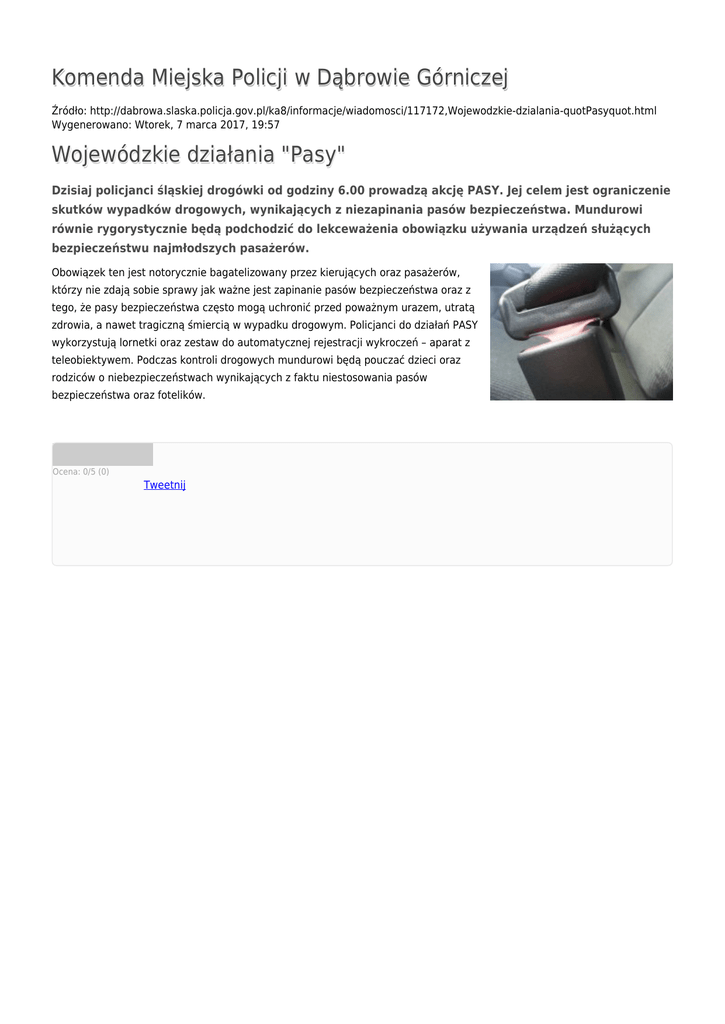 Komenda Miejska Policji w Dąbrowie Górniczej Źródło: http://dabrowa.slaska.policja.gov.pl/ka8/informacje/wiadomosci/117172,Wojewodzkie-dzialania-quotPasyquot.html Wygenerowano: Wtorek, 7 marca 2017, 19:57 Wojewódzkie działania "Pasy" Dzisiaj policjanci śląskiej drogówki od godziny 6.00 prowadzą akcję PASY. Jej celem jest ograniczenie skutków wypadków drogowych, wynikających z niezapinania pasów bezpieczeństwa. Mundurowi równie rygorystycznie będą podchodzić do lekceważenia obowiązku używania urządzeń służących bezpieczeństwu najmłodszych pasażerów. Obowiązek ten jest notorycznie bagatelizowany przez kierujących oraz pasażerów, którzy nie zdają sobie sprawy jak ważne jest zapinanie pasów bezpieczeństwa oraz z tego, że pasy bezpieczeństwa często mogą uchronić przed poważnym urazem, utratą zdrowia, a nawet tragiczną śmiercią w wypadku drogowym. Policjanci do działań PASY wykorzystują lornetki oraz zestaw do automatycznej rejestracji wykroczeń – aparat z teleobiektywem. Podczas kontroli drogowych mundurowi będą pouczać dzieci oraz rodziców o niebezpieczeństwach wynikających z faktu niestosowania pasów bezpieczeństwa oraz fotelików. Ocena: 0/5 (0) Tweetnij