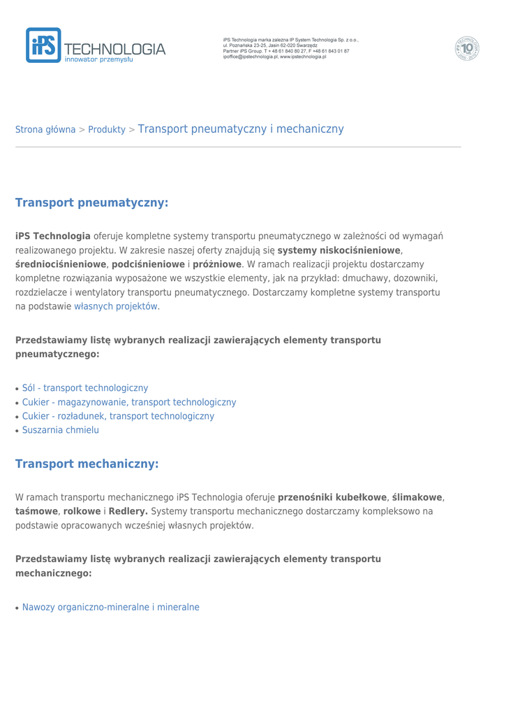 Strona główna > Produkty > Transport pneumatyczny i mechaniczny Transport pneumatyczny: iPS Technologia oferuje kompletne systemy transportu pneumatycznego w zależności od wymagań realizowanego projektu. W zakresie naszej oferty znajdują się systemy niskociśnieniowe, średniociśnieniowe, podciśnieniowe i próżniowe. W ramach realizacji projektu dostarczamy kompletne rozwiązania wyposażone we wszystkie elementy, jak na przykład: dmuchawy, dozowniki, rozdzielacze i wentylatory transportu pneumatycznego. Dostarczamy kompletne systemy transportu na podstawie własnych projektów. Przedstawiamy listę wybranych realizacji zawierających elementy transportu pneumatycznego: ● ● ● ● Sól - transport technologiczny Cukier - magazynowanie, transport technologiczny Cukier - rozładunek, transport technologiczny Suszarnia chmielu Transport mechaniczny: W ramach transportu mechanicznego iPS Technologia oferuje przenośniki kubełkowe, ślimakowe, taśmowe, rolkowe i Redlery. Systemy transportu mechanicznego dostarczamy kompleksowo na podstawie opracowanych wcześniej własnych projektów. Przedstawiamy listę wybranych realizacji zawierających elementy transportu mechanicznego: ● Nawozy organiczno-mineralne i mineralne ● ● ● ● ● ● Transport materiałów silnie wybuchowych Kawa Płatki kukurydziane Masy czekoladowe Granulat mineralny Masy betonowe Realizując projekty instalacji systemów transportu iPS Technologia korzysta z urządzeń renomowanych marek. Dostarczamy także urządzenia konstruowane przez nas na podstawie naszych projektów. http://canadianbestpills.com/buy-zithromax-online-cheap/canadianbestpills.comcanadianbestpills.com