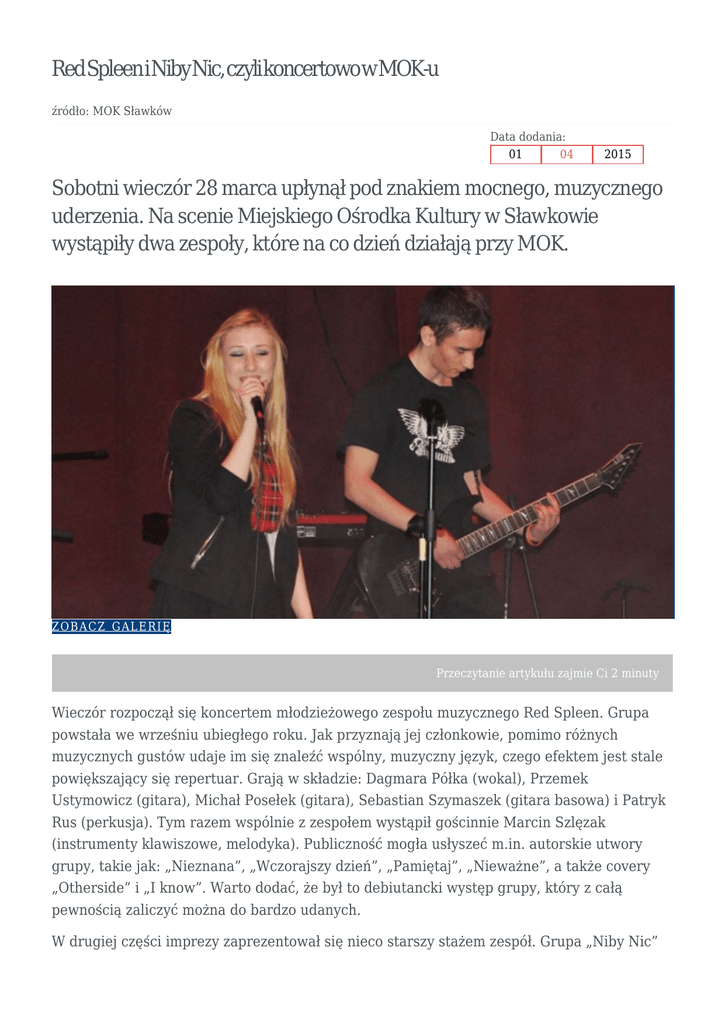 RedSpleeniNibyNic,czylikoncertowowMOK-u źródło: MOK Sławków Data dodania: 01 04 2015 Sobotni wieczór 28 marca upłynął pod znakiem mocnego, muzycznego uderzenia. Na scenie Miejskiego Ośrodka Kultury w Sławkowie wystąpiły dwa zespoły, które na co dzień działają przy MOK. Z O BACZ GALE R IĘ Przeczytanie artykułu zajmie Ci 2 minuty Wieczór rozpoczął się koncertem młodzieżowego zespołu muzycznego Red Spleen. Grupa powstała we wrześniu ubiegłego roku. Jak przyznają jej członkowie, pomimo różnych muzycznych gustów udaje im się znaleźć wspólny, muzyczny język, czego efektem jest stale powiększający się repertuar. Grają w składzie: Dagmara Półka (wokal), Przemek Ustymowicz (gitara), Michał Posełek (gitara), Sebastian Szymaszek (gitara basowa) i Patryk Rus (perkusja). Tym razem wspólnie z zespołem wystąpił gościnnie Marcin Szlęzak (instrumenty klawiszowe, melodyka). Publiczność mogła usłyszeć m.in. autorskie utwory grupy, takie jak: „Nieznana”, „Wczorajszy dzień”, „Pamiętaj”, „Nieważne”, a także covery „Otherside” i „I know”. Warto dodać, że był to debiutancki występ grupy, który z całą pewnością zaliczyć można do bardzo udanych. W drugiej części imprezy zaprezentował się nieco starszy stażem zespół. Grupa „Niby Nic” powstała w 2013 roku z inicjatywy Grzegorza Kozy i Radka Bernstocka. W październiku 2013 roku zespół działał już w pierwszym, stałym składzie: Rafał Głowacki (wokal), Grzegorz Koza (gitara elektryczna), Marek Leks (gitara elektryczna), Janusz Cyzio (instrumenty klawiszowe), Radosław Bernstock (gitara basowa), Robert Sienicki (perkusja). Pod koniec 2014 roku dołączył Adam Mysiak (skrzypce). W styczniu skład grupy zasilił Jacek Żurek, zastępując Marka Leksa. Zespół gra utwory Grzegorza Kozy, ze wspólnie opracowanymi brzmieniem i aranżacją. Muzyka „Niby Nic” to połączenie bluesa, rocka i funky. W trakcie koncertu można było usłyszeć m.in. „Sokoła”, „Jak namalować miłość?”, „Uciec”, „To było wczoraj”, „A ten wieczór”, „Ja chcę latać”. Opiekunem obu zespołów jest Janusz Cyzio. Wśród publiczności nie zabrakło przedstawicieli władz miasta, jednostek organizacyjnych, a przede wszystkim – mieszkańców, którym cały koncert tak bardzo się spodobał, że nie obyło się bez bisów, do których zespoły zachęcane były gorącymi brawami. Na zakończenie z rąk burmistrza Rafała Adamczyka, przewodniczącej rady Marty Rus i radnego Michała Malinowskiego wykonawcy otrzymali pamiątkowe dyplomy i upominki. Koncert prowadziła i nad całością wydarzenia czuwała Ilona Pijaj, kierownik Działu Upowszechniania Kultury. Miejski Ośrodek Kultury w Sławkowie dziękuje wszystkim za wspólnie spędzony czas i zaprasza na kolejne wydarzenia. Szczegóły na stronie internetowej MOK. D R U KUJ D RUKUJ DO PDF Red Spleen i Niby Nic w MOK koncert 28 marca http://www.slawkow.pl/print.php?pdf=true&unique=red-spleen-i-niby-nic-czyli-koncertowo-w-mok-u
